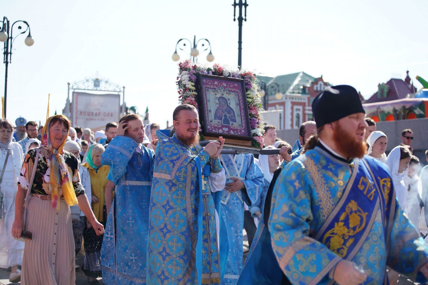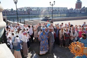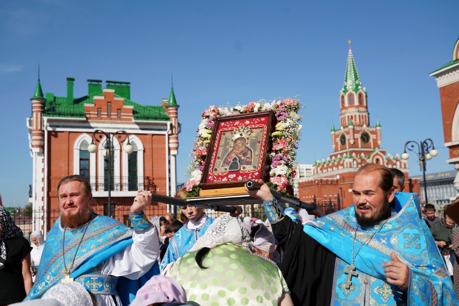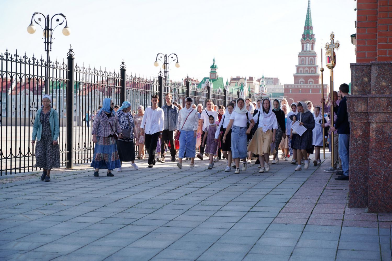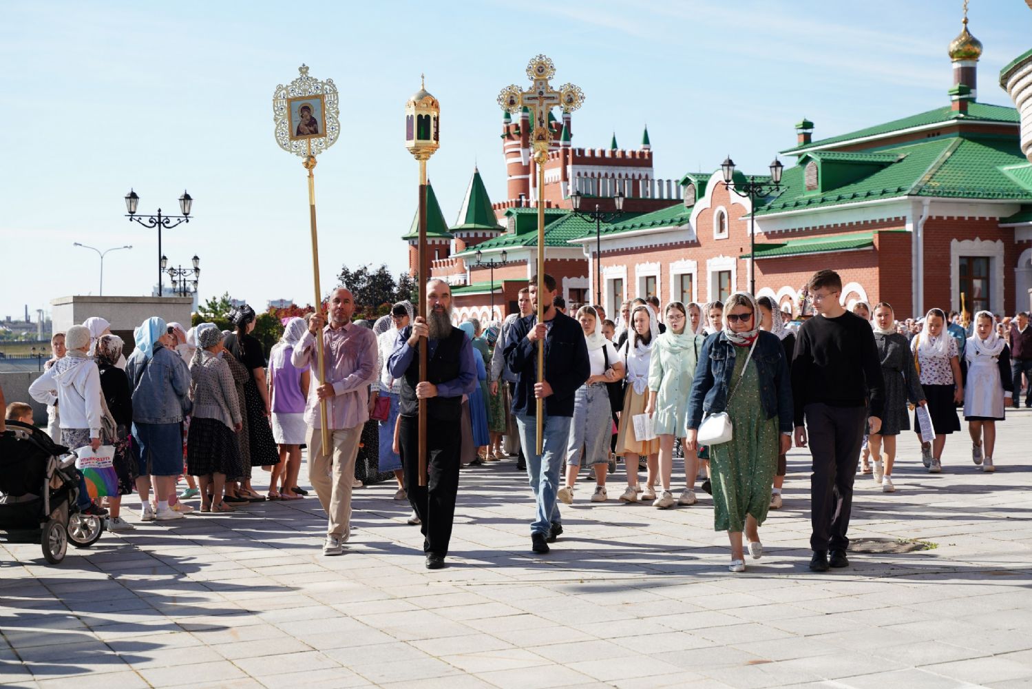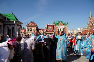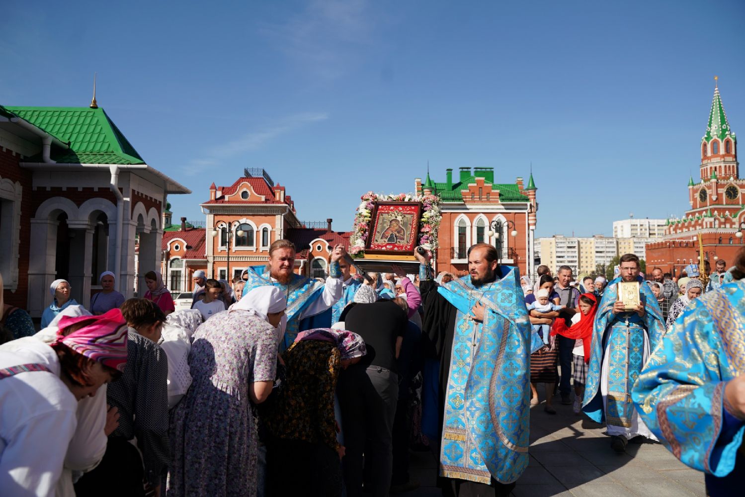 После Литургии верующие с Мироносицкой иконой Божией Матери обошли крестным ходом вокруг собора, затем владыка Иоанн возглавил молитвенное шествие в Успенский храм г. Йошкар-Олы. Около строящегося Входоиерусалимского храма, Православного центра и храма мученицы Татианы делались остановки с молитвами Пречистой и кроплением святой водой. У Татианинского храма к крестоходцам присоединились прихожане храма, учащиеся и педагоги гимназии им. Сергия Радонежского с настоятелем храма, директором гимназии протоиереем Евгением Сурковым.