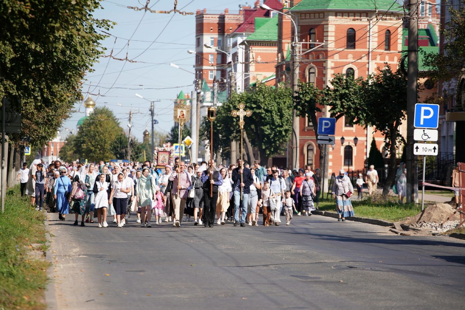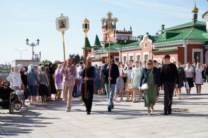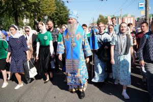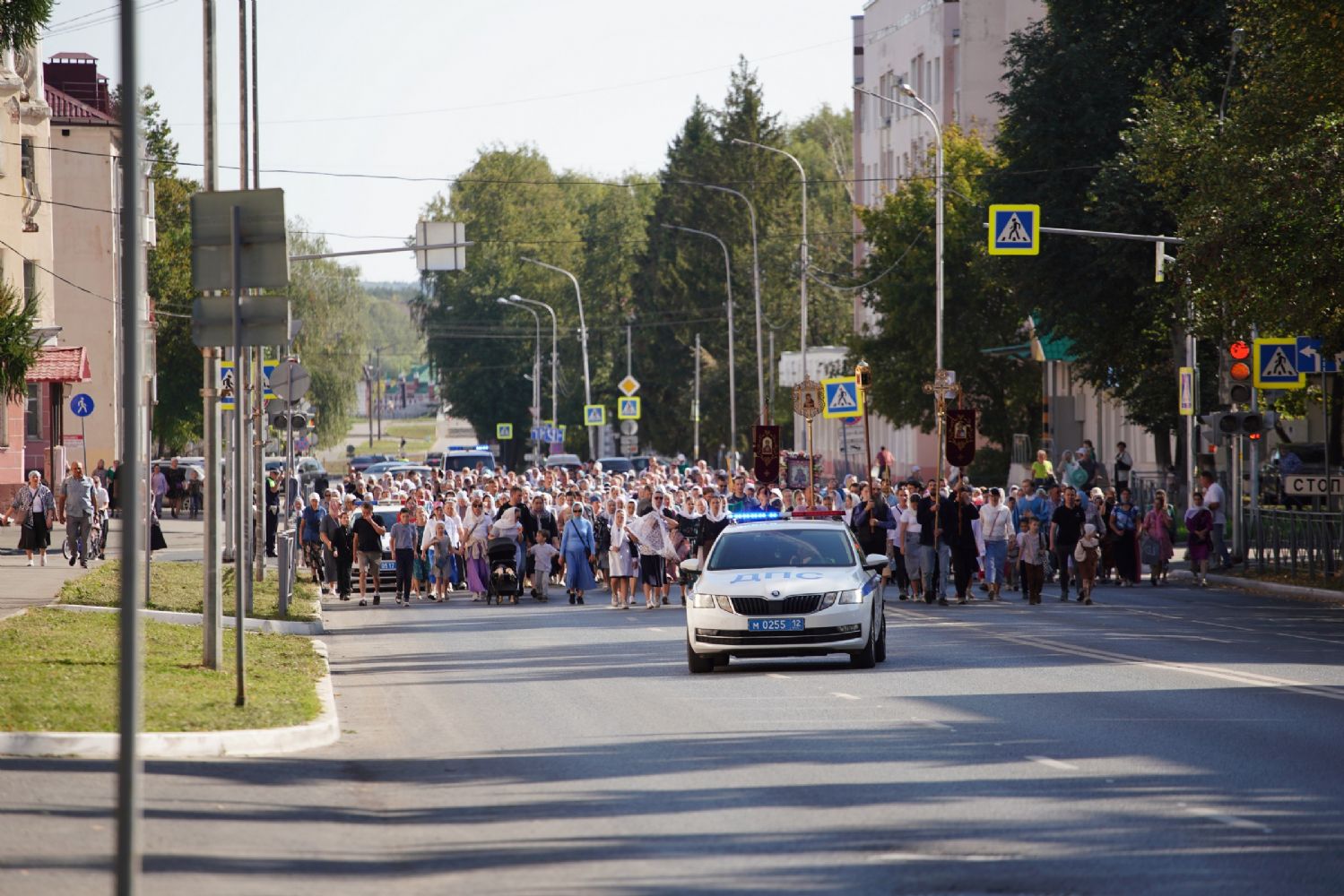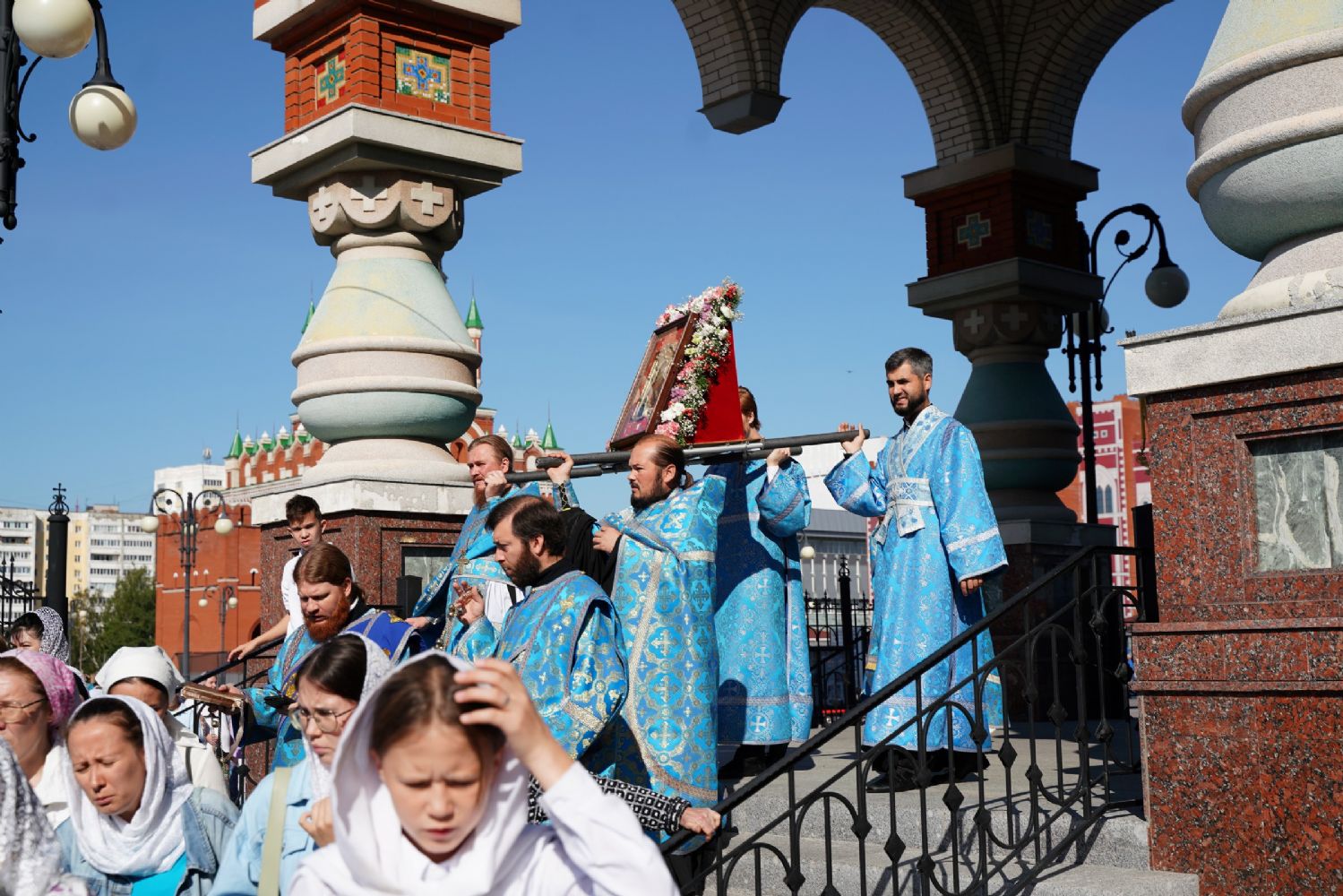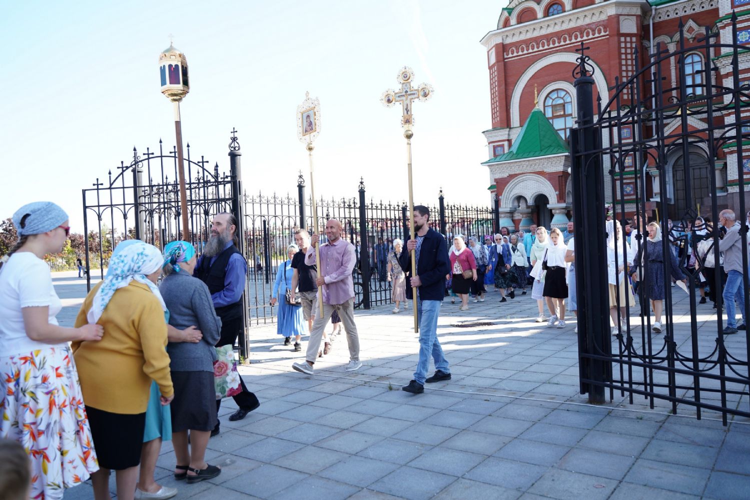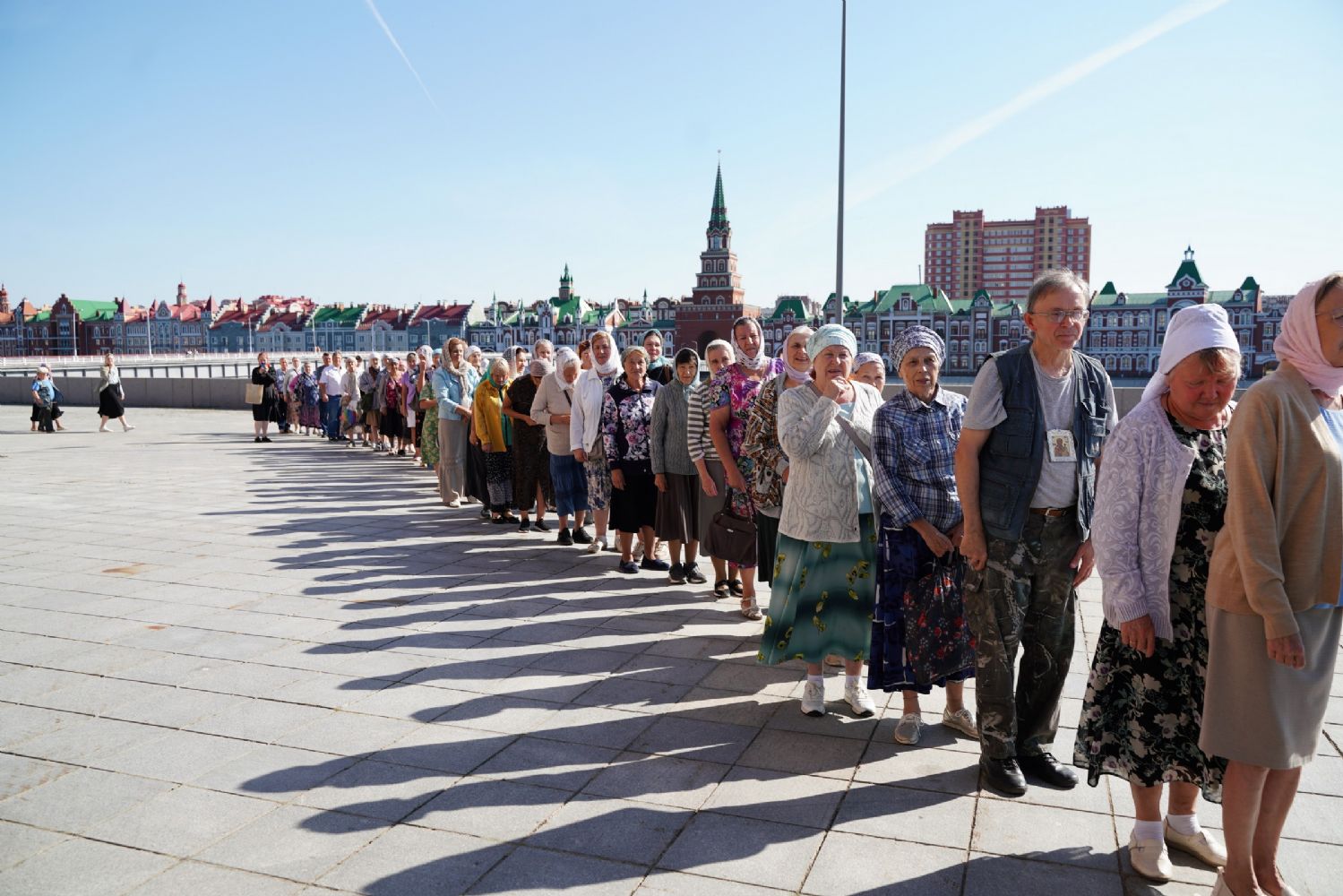 После Литургии верующие с Мироносицкой иконой Божией Матери обошли крестным ходом вокруг собора, затем владыка Иоанн возглавил молитвенное шествие в Успенский храм г. Йошкар-Олы. Около строящегося Входоиерусалимского храма, Православного центра и храма мученицы Татианы делались остановки с молитвами Пречистой и кроплением святой водой. У Татианинского храма к крестоходцам присоединились прихожане храма, учащиеся и педагоги гимназии им. Сергия Радонежского с настоятелем храма, директором гимназии протоиереем Евгением Сурковым.