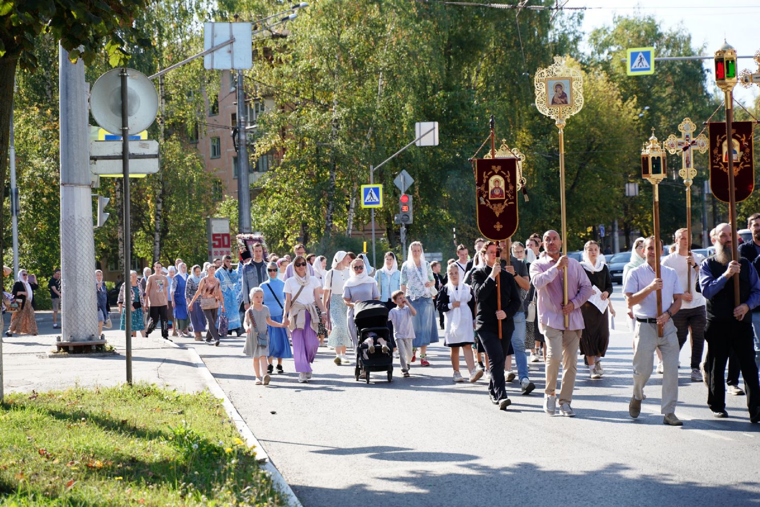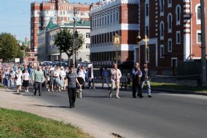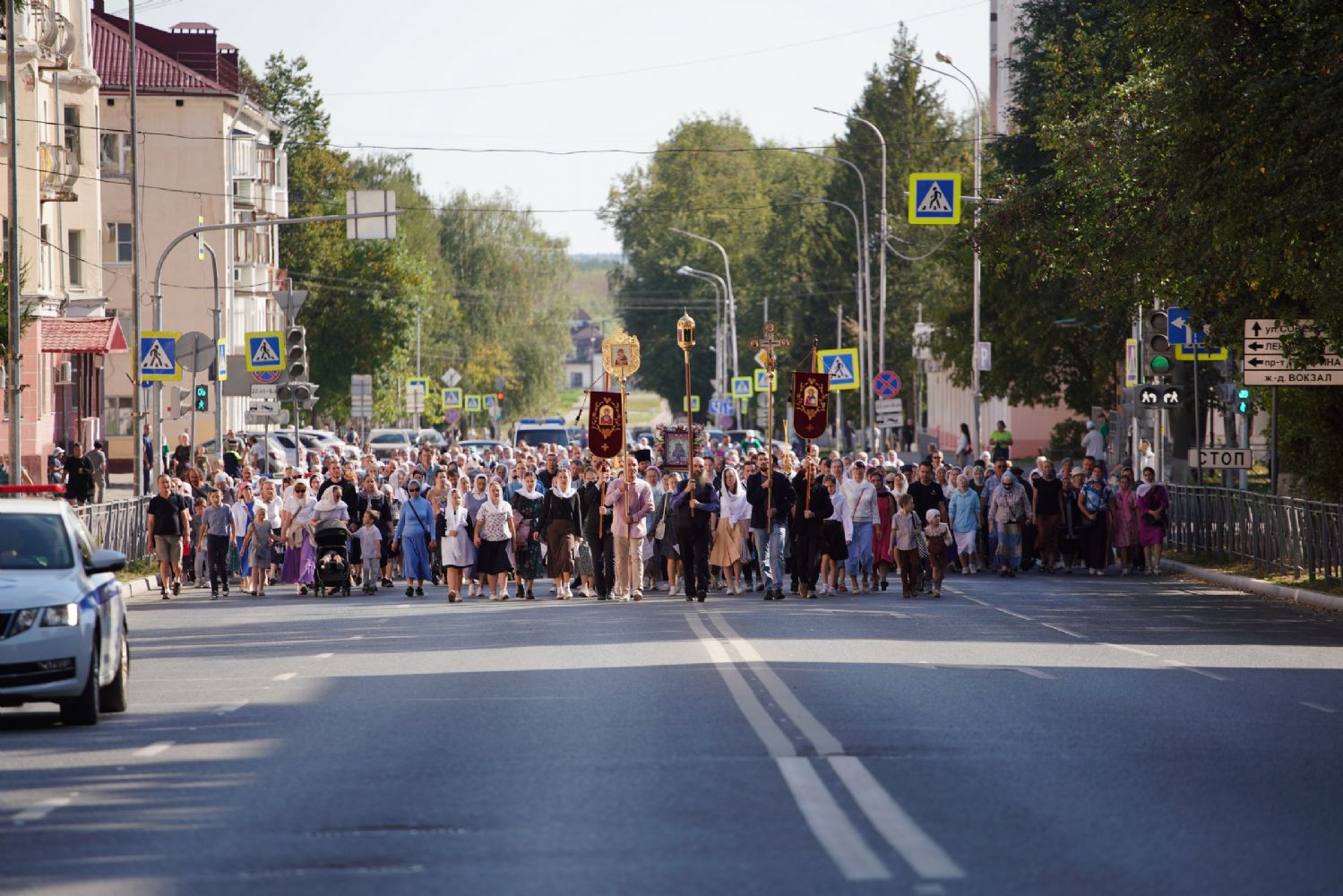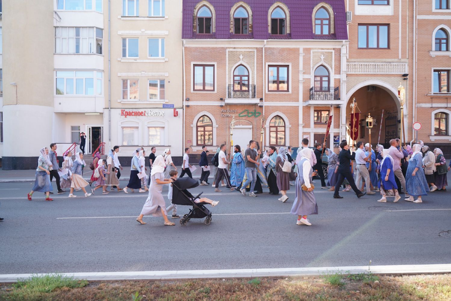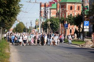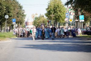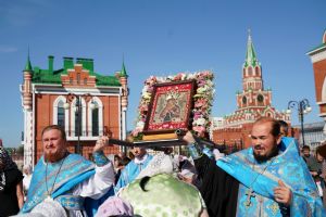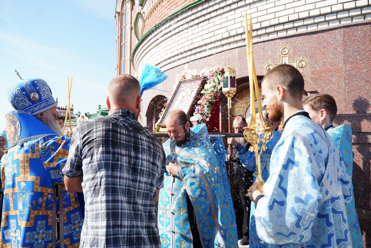 После Литургии верующие с Мироносицкой иконой Божией Матери обошли крестным ходом вокруг собора, затем владыка Иоанн возглавил молитвенное шествие в Успенский храм г. Йошкар-Олы. Около строящегося Входоиерусалимского храма, Православного центра и храма мученицы Татианы делались остановки с молитвами Пречистой и кроплением святой водой. У Татианинского храма к крестоходцам присоединились прихожане храма, учащиеся и педагоги гимназии им. Сергия Радонежского с настоятелем храма, директором гимназии протоиереем Евгением Сурковым.