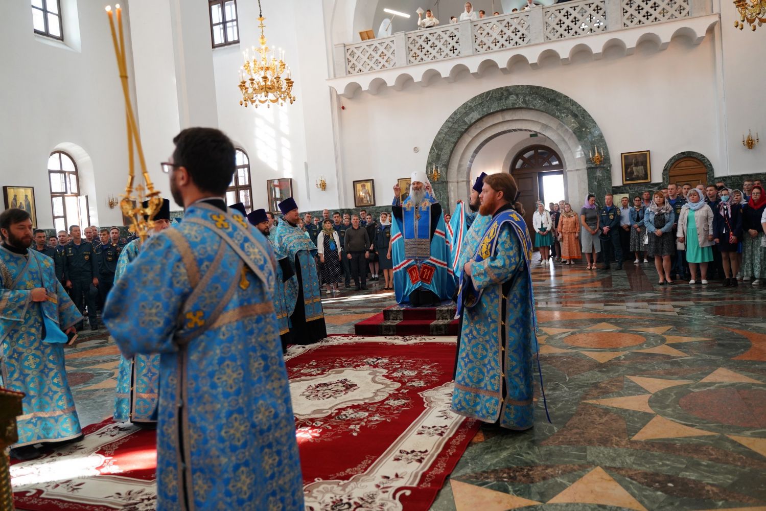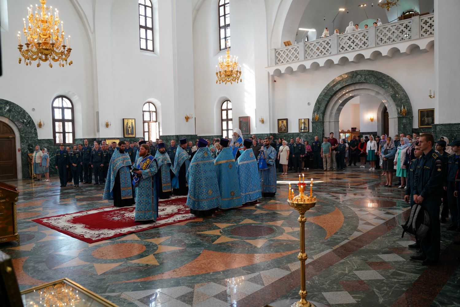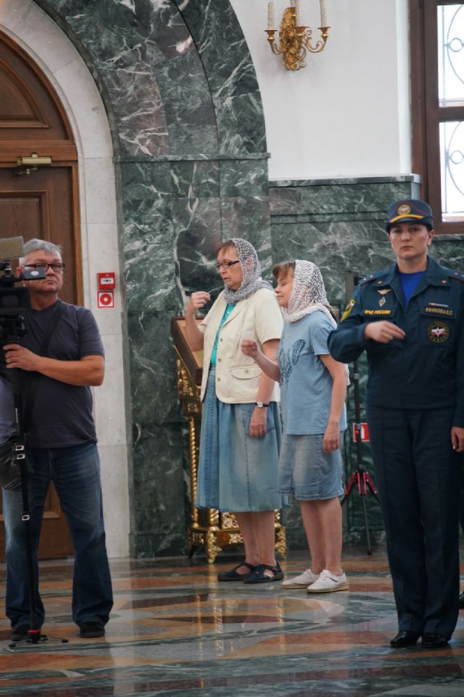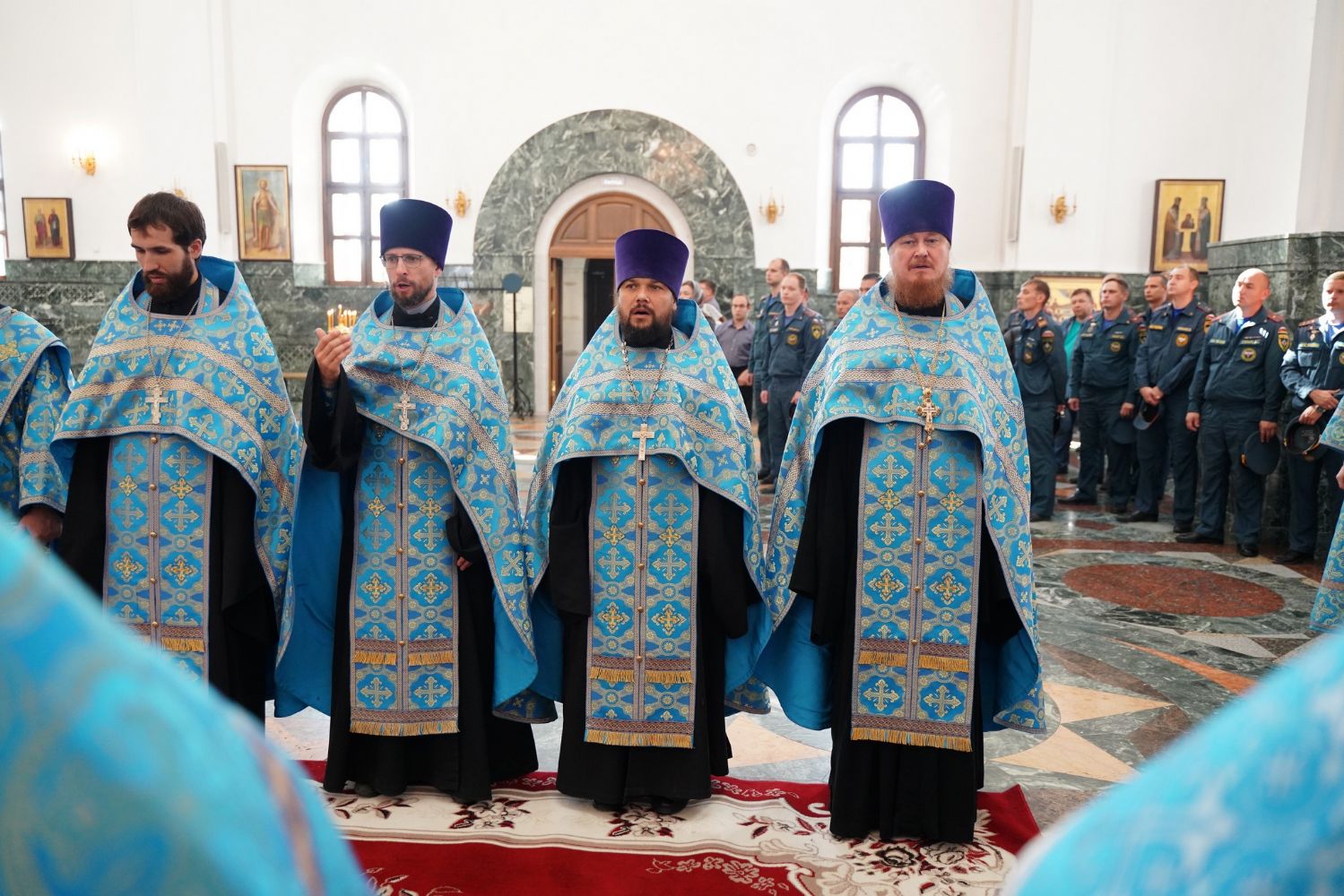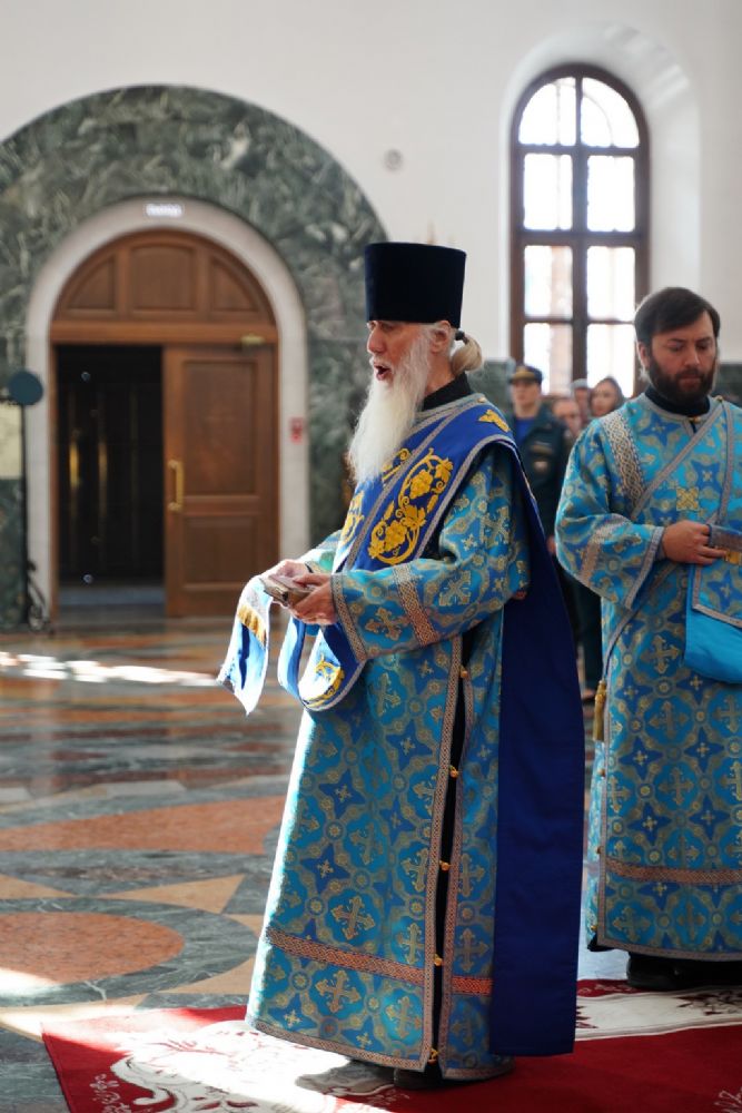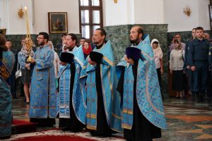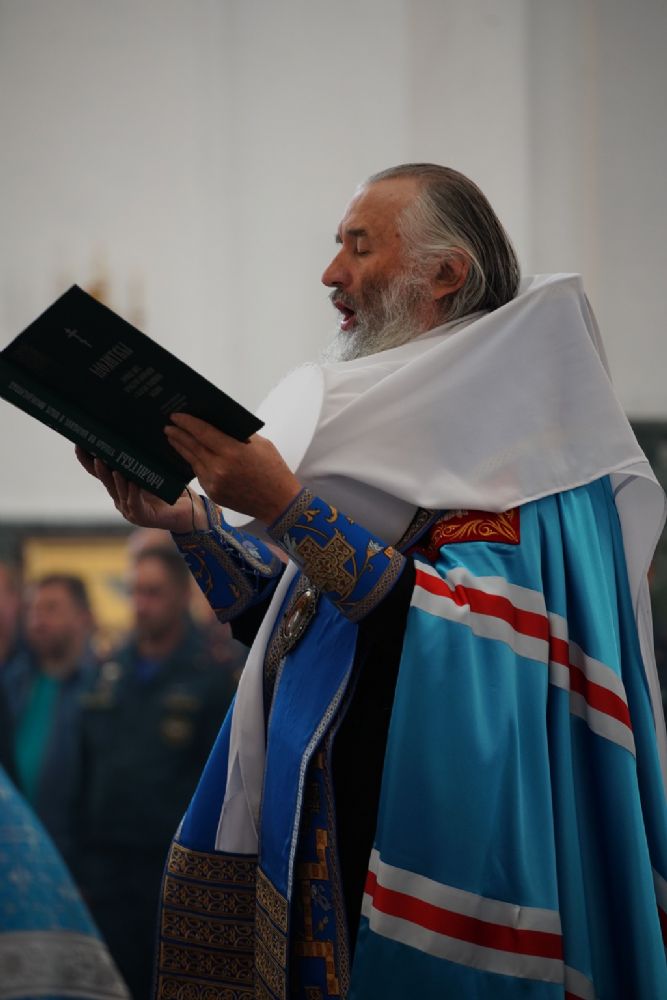 Молебен возглавил митрополит Йошкар-Олинский и Марийский Иоанн. Владыке сослужили ключарь кафедрального собора протоиерей Сергий Поглазов, клирик храма Рождества Пресвятой Богородицы с. Семеновка иерей Димитрий Иванов, окормляющий сотрудников МЧС, настоятель Воскресенского собора г. Йошкар-Олы иерей Андрей Кочаков, клирики кафедрального собора иереи Никифор Захаров, Евгений Самойлов, Александр Староверов и Иоанн Милютин, диаконы Андрей Дружинин и Артемий Бобоч, а также протодиакон Михаил Козловский. Песнопения исполнял хор «Благовест» под управлением Татьяны Черновой.