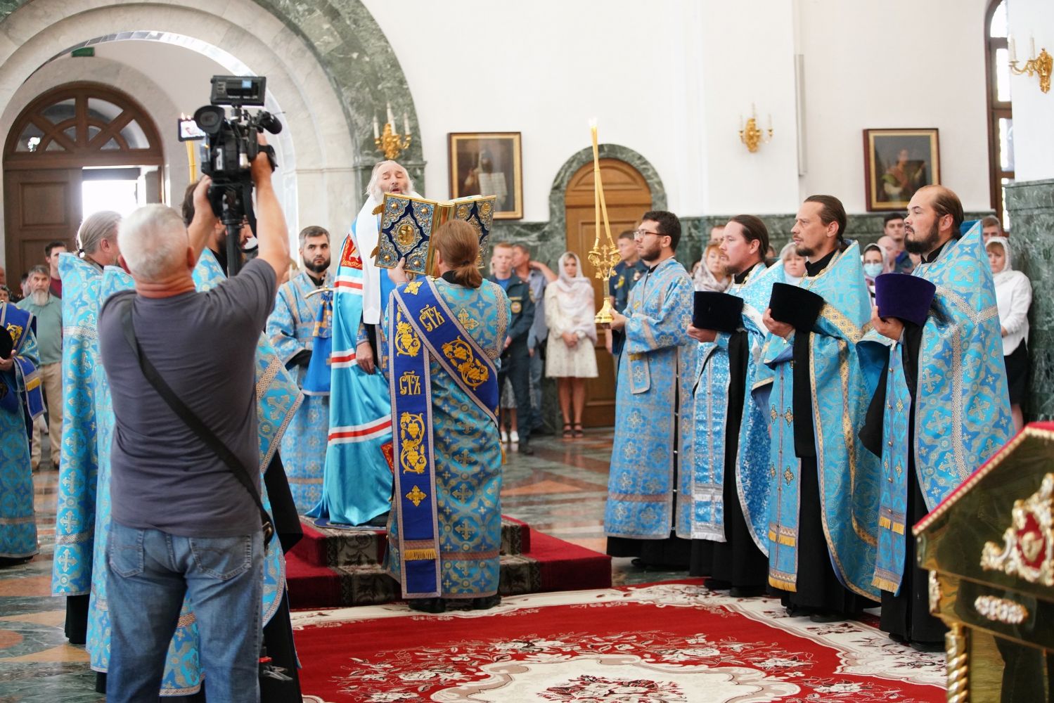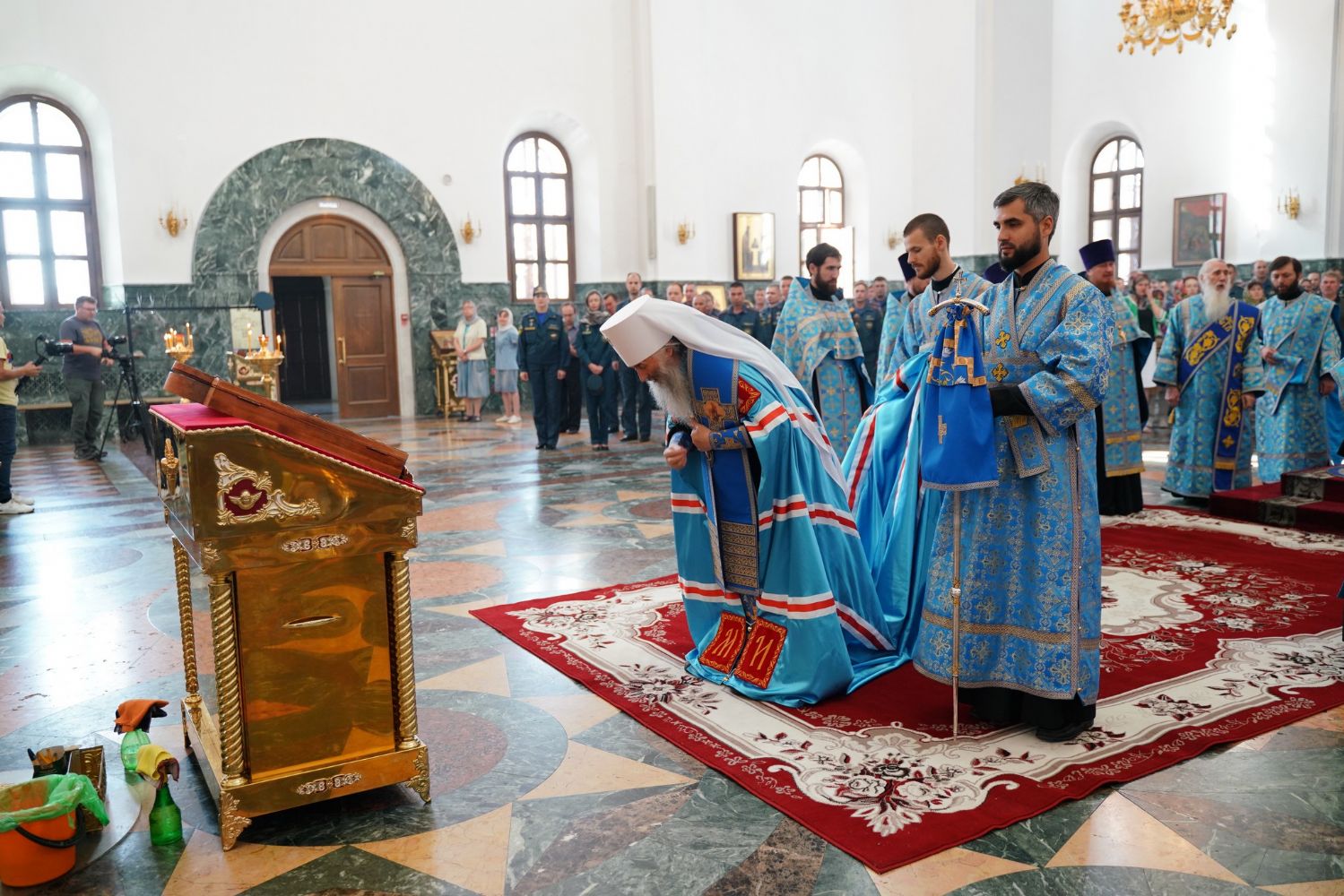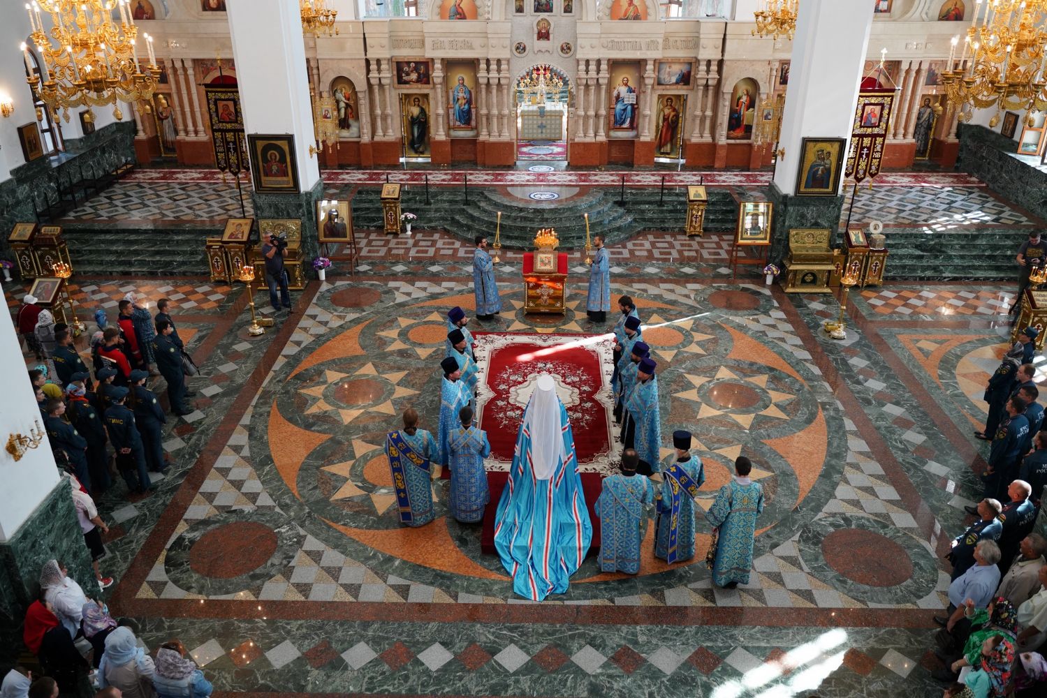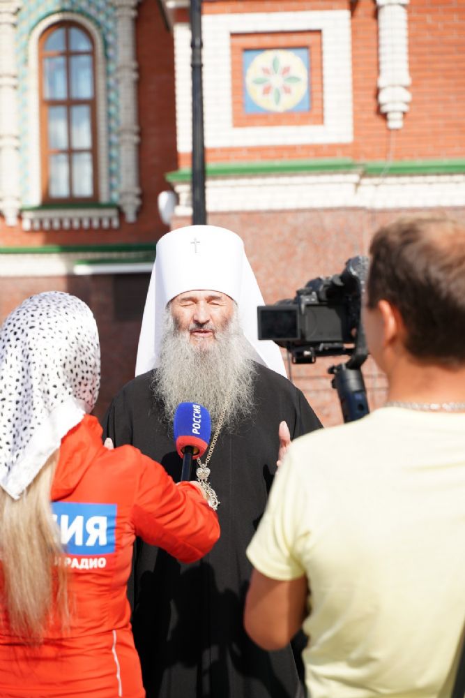 Молебен возглавил митрополит Йошкар-Олинский и Марийский Иоанн. Владыке сослужили ключарь кафедрального собора протоиерей Сергий Поглазов, клирик храма Рождества Пресвятой Богородицы с. Семеновка иерей Димитрий Иванов, окормляющий сотрудников МЧС, настоятель Воскресенского собора г. Йошкар-Олы иерей Андрей Кочаков, клирики кафедрального собора иереи Никифор Захаров, Евгений Самойлов, Александр Староверов и Иоанн Милютин, диаконы Андрей Дружинин и Артемий Бобоч, а также протодиакон Михаил Козловский. Песнопения исполнял хор «Благовест» под управлением Татьяны Черновой.
