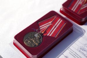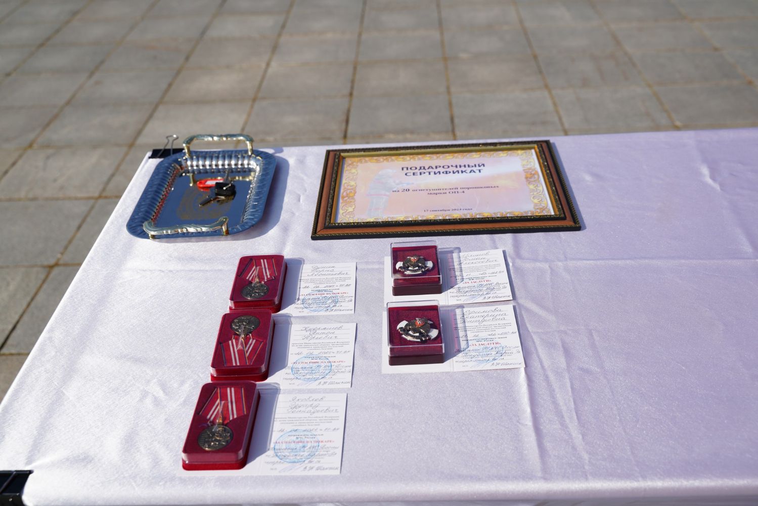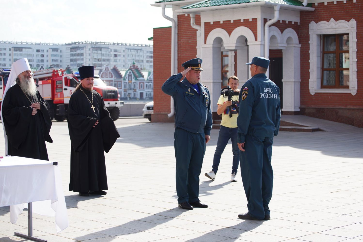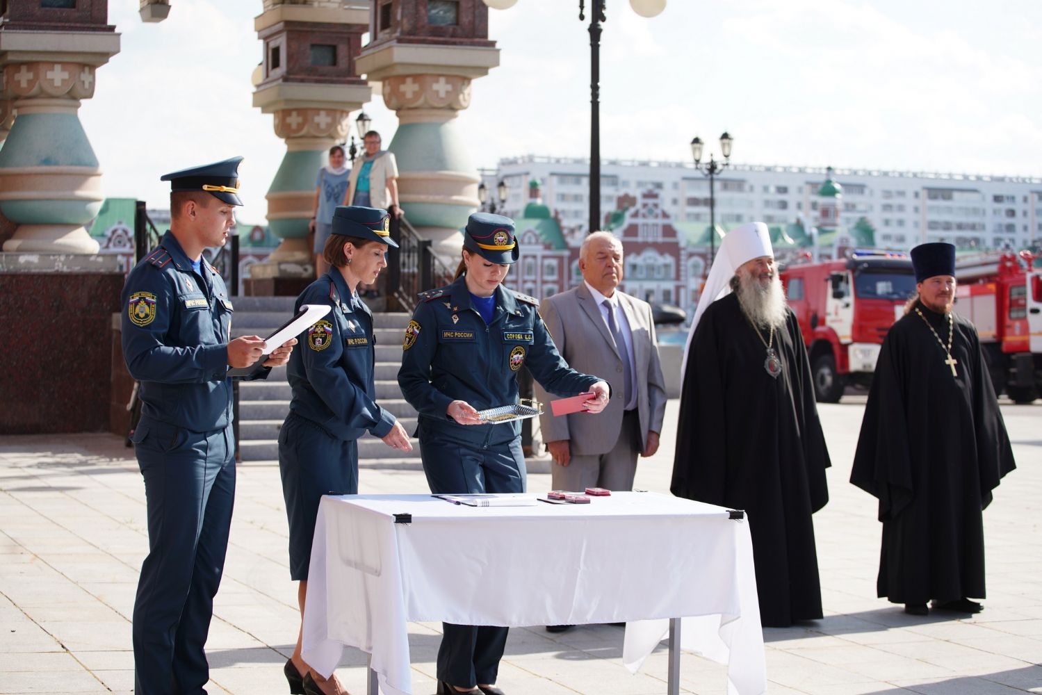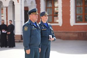 После молебна на площадке возле храма состоялось вручение наград – пятеро лучших сотрудников МЧС получили медали и знаки отличия из рук митрополита Иоанна.