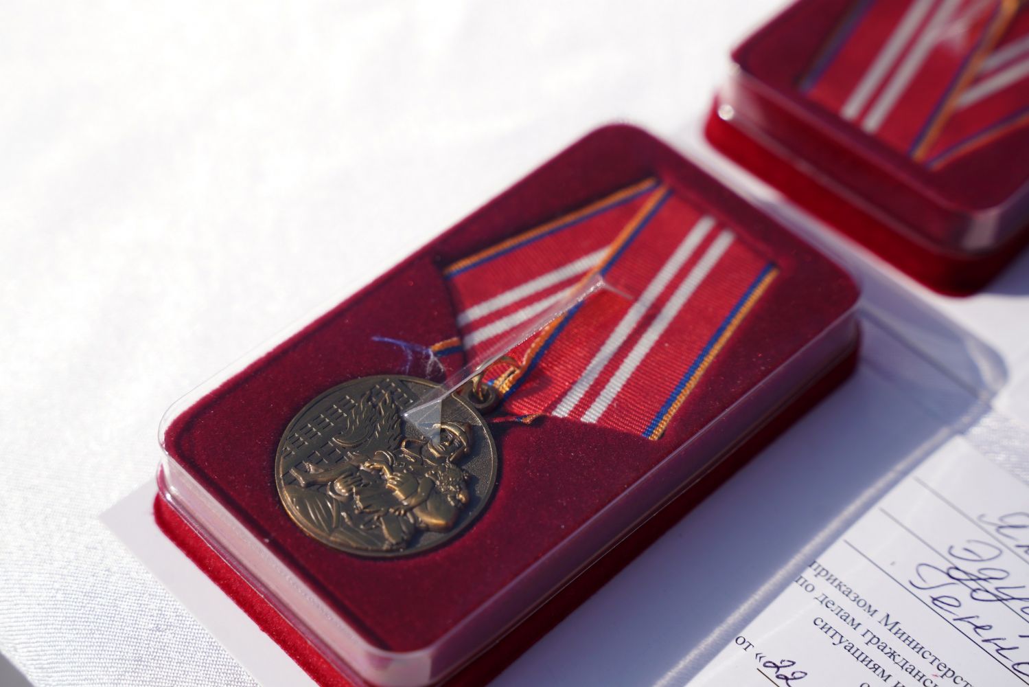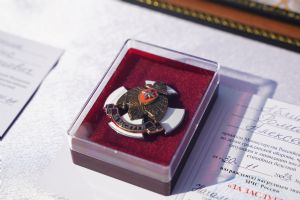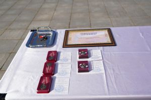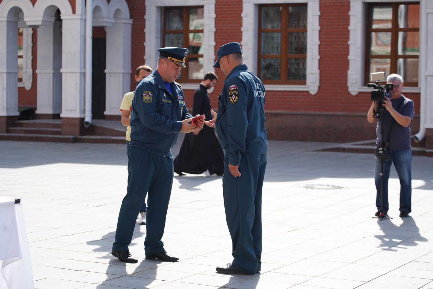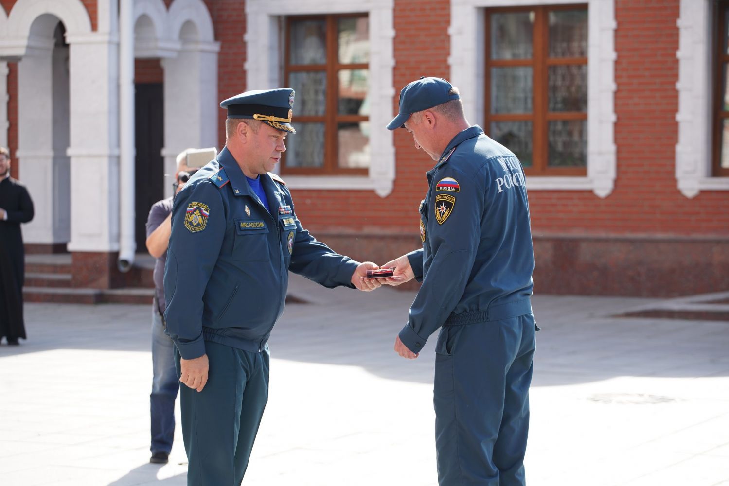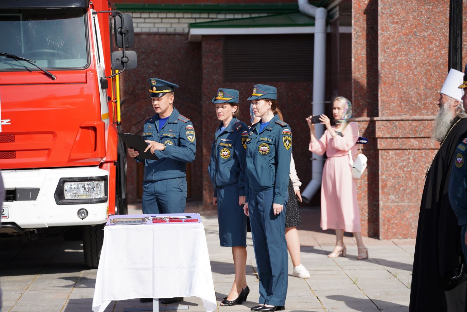 После молебна на площадке возле храма состоялось вручение наград – пятеро лучших сотрудников МЧС получили медали и знаки отличия из рук митрополита Иоанна.