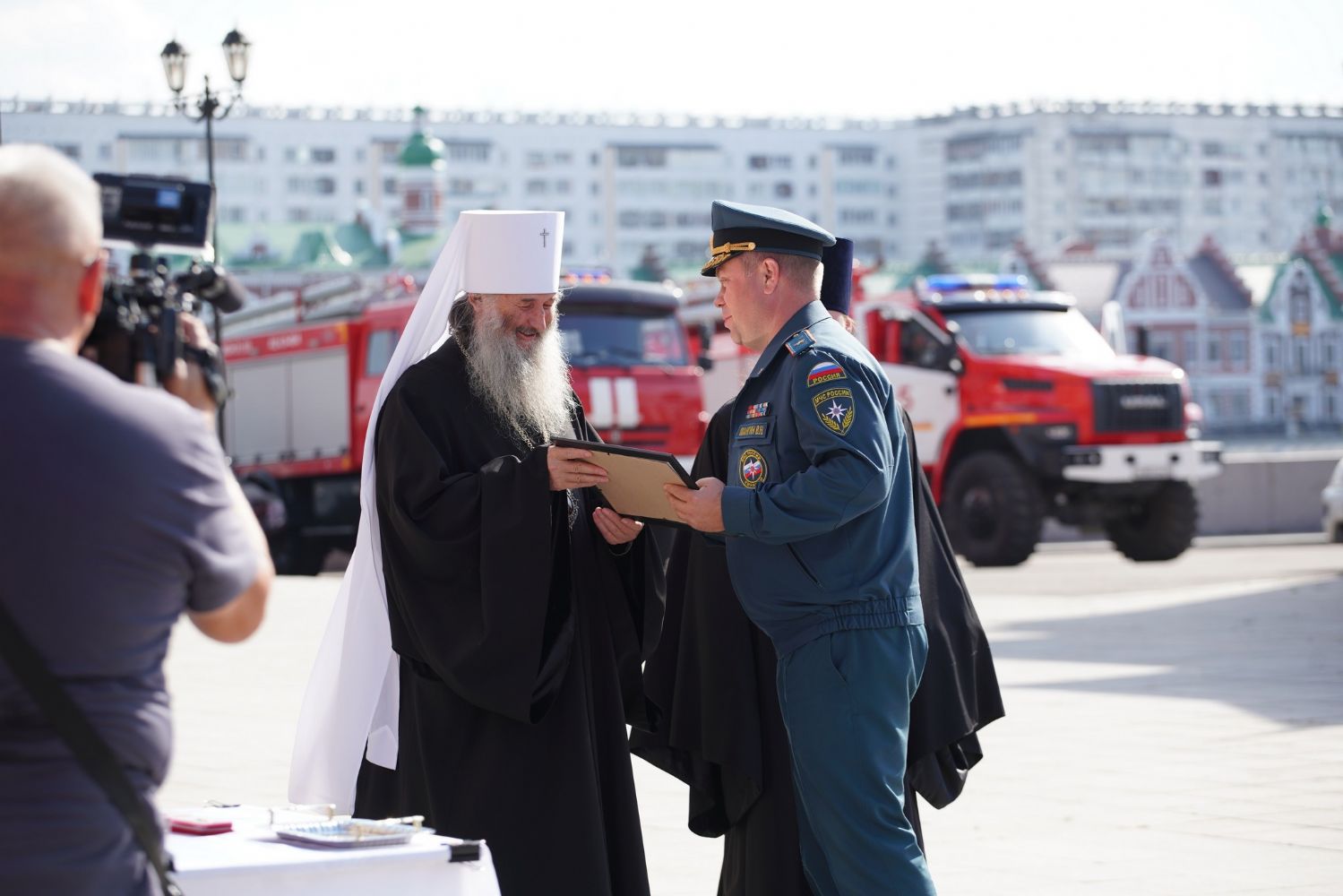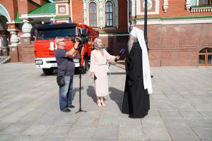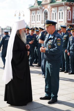 В благодарность за многолетнее сотрудничество начальник Главного управления МЧС России по Республике Марий Эл генерал-майор внутренней службы Виктор Шангин вручил владыке Иоанну сертификат на 20 огнетушителей для храмов города.