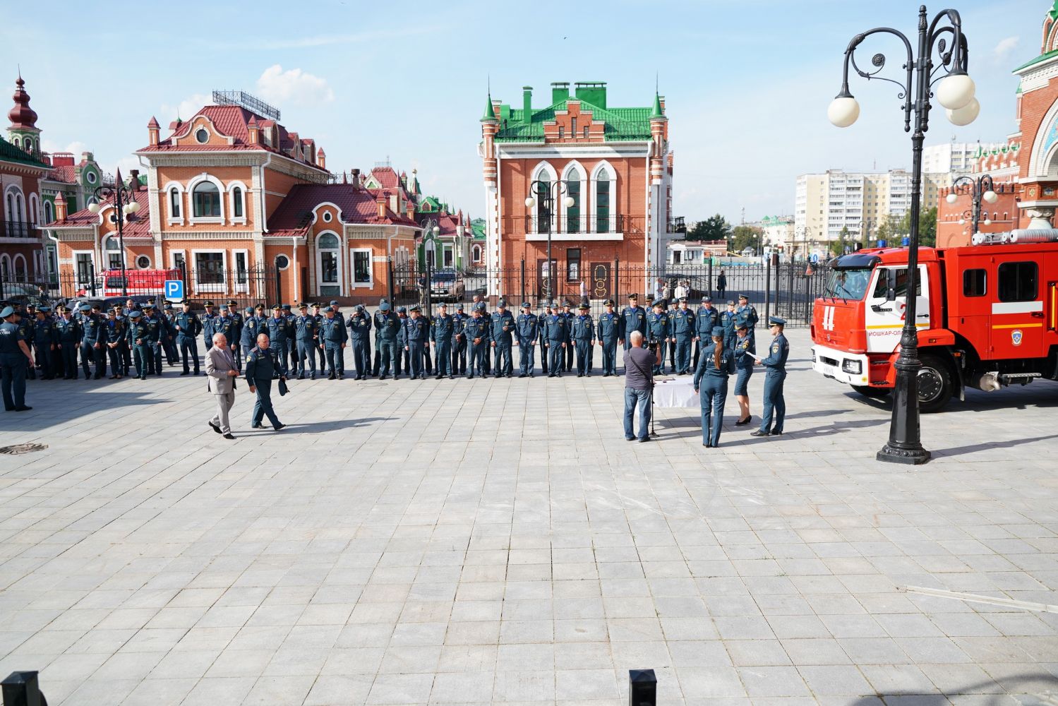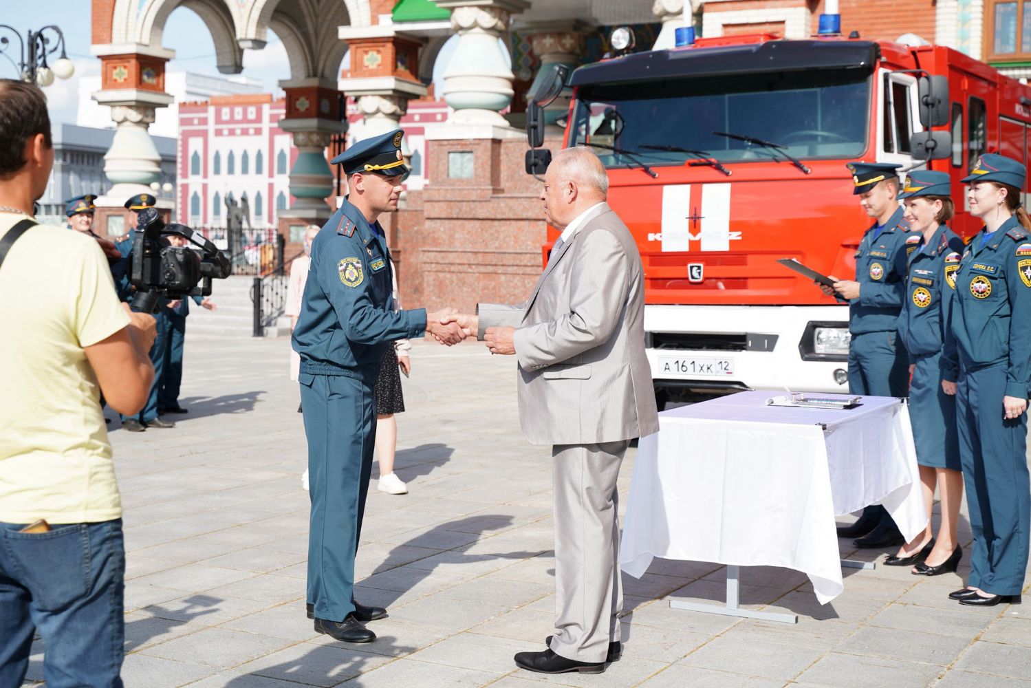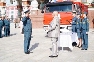Заместитель генерального директора ММЗ Владимир Шевцов вручил в подарок сотрудникам МЧС ключи от новой пожарной машины.