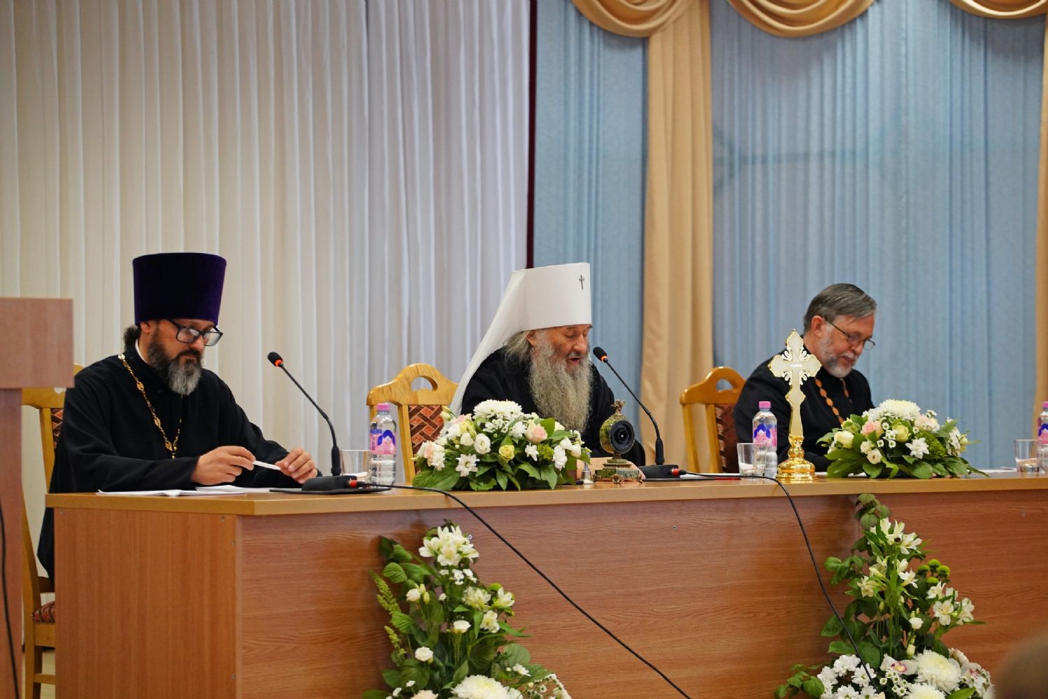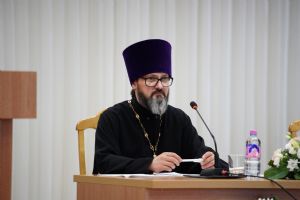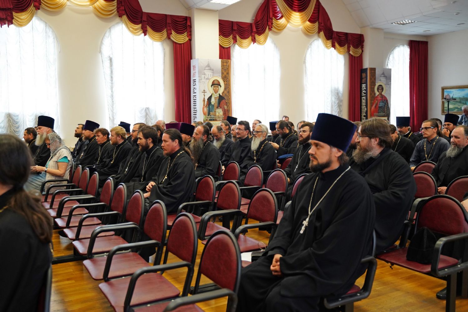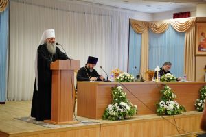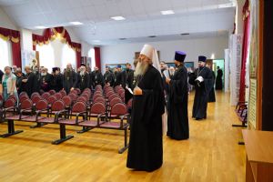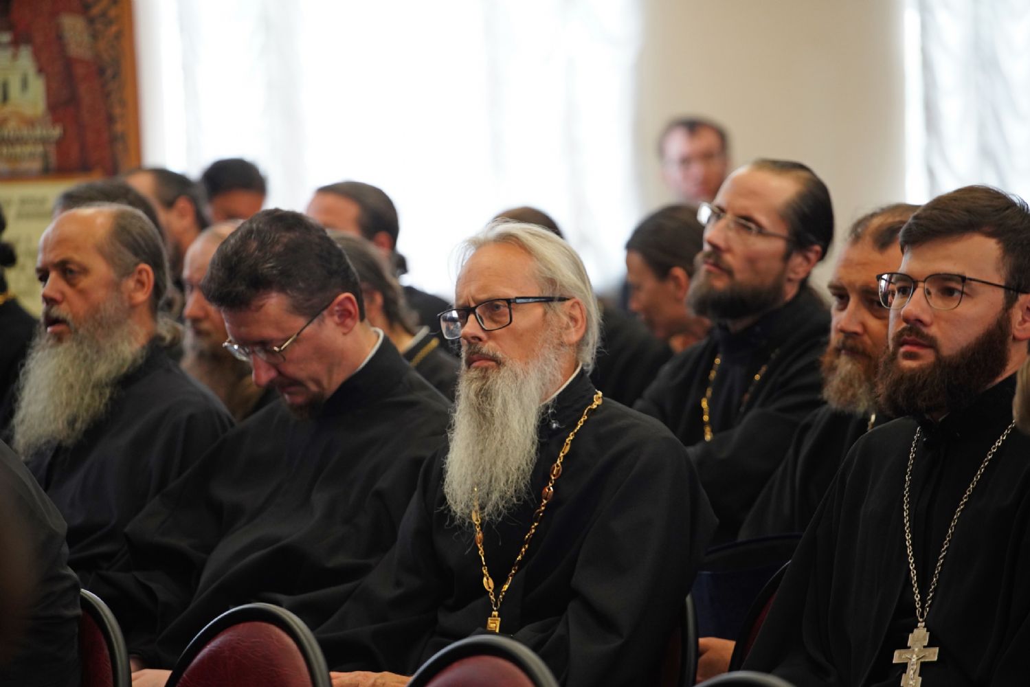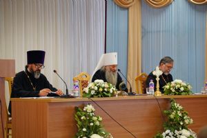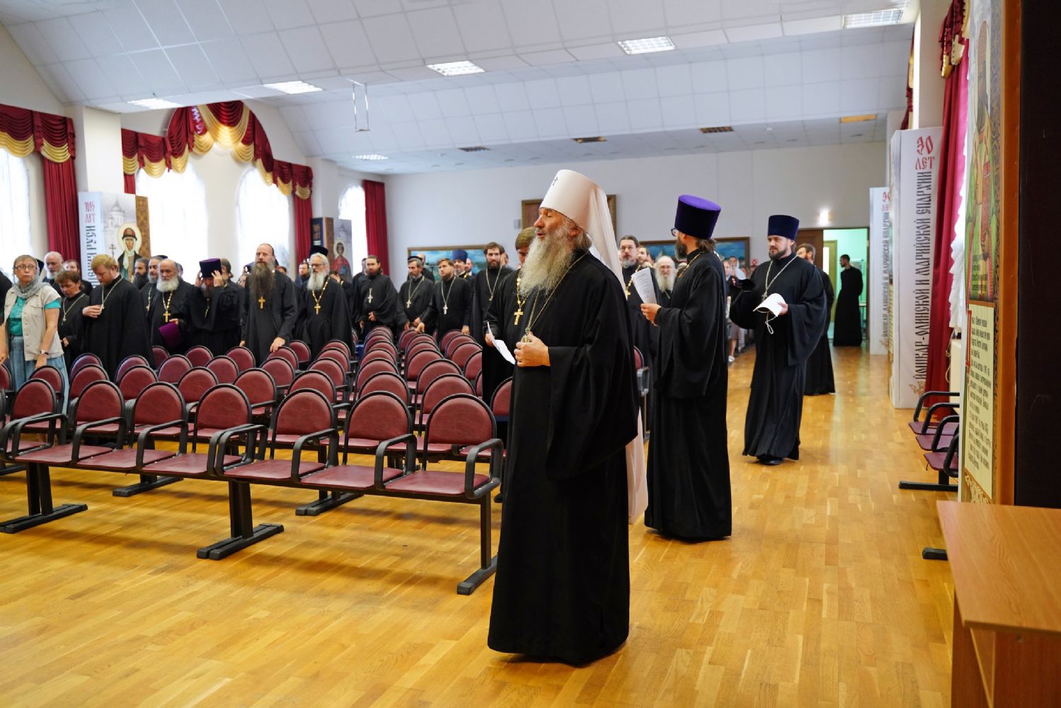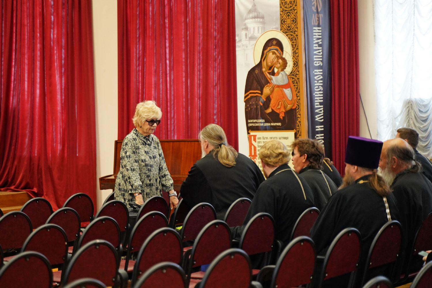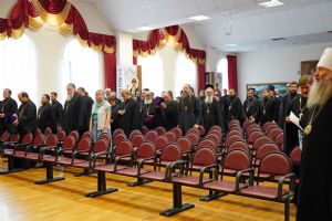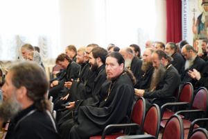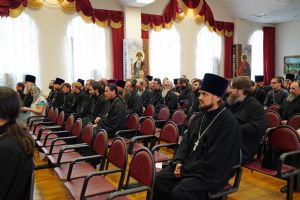 После соборного богослужения в Мироносицком женском монастыре с. Ежово священнослужители и представители приходов переехали в Йошкар-Олу и собрались в актовом зале Православного центра.