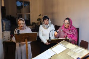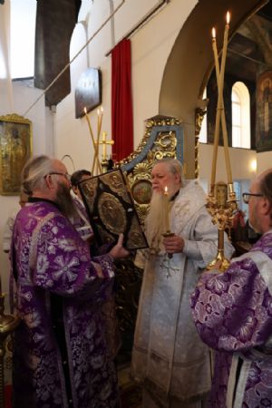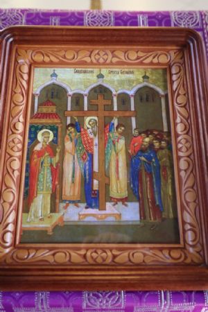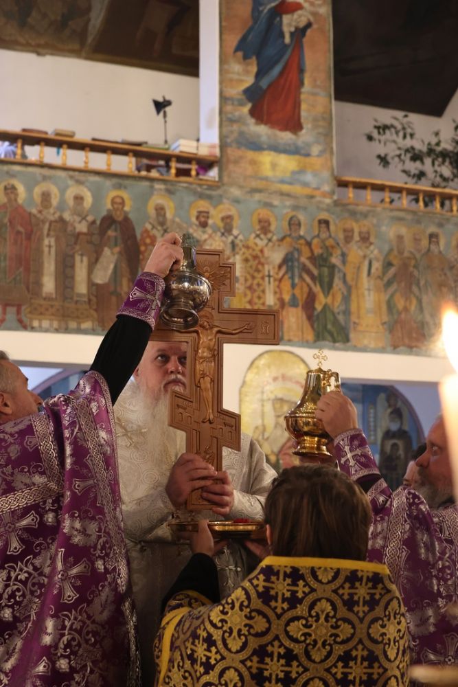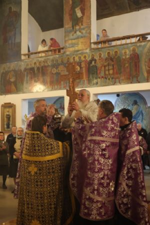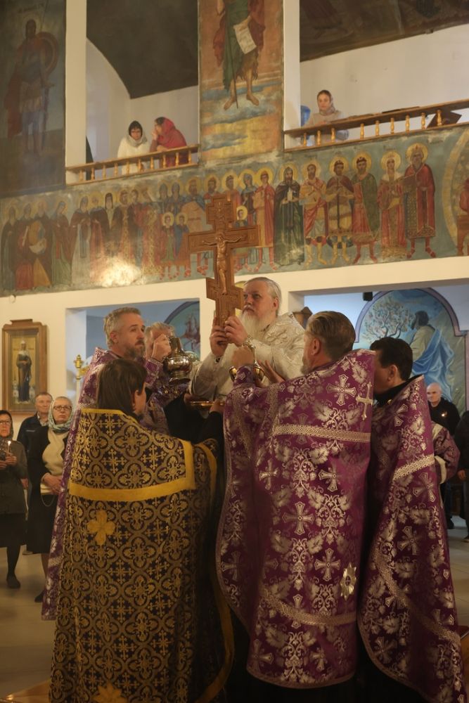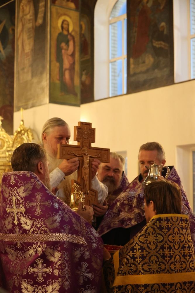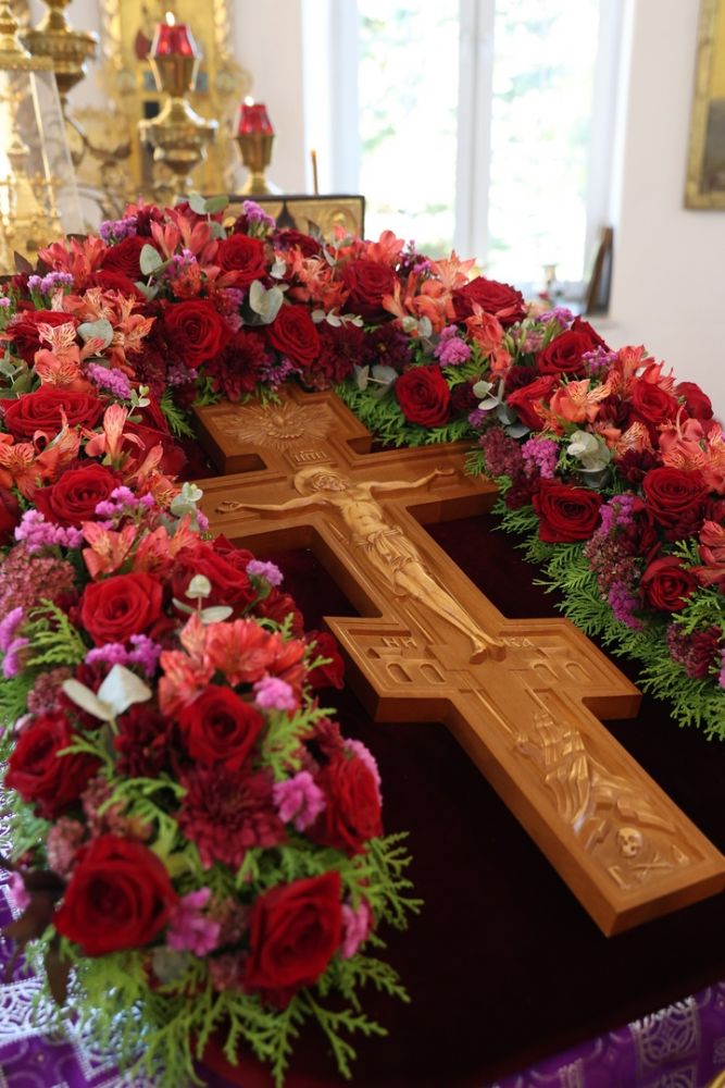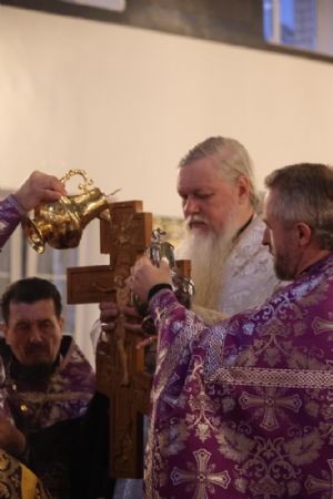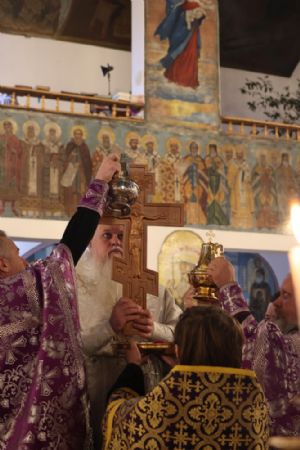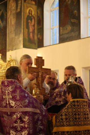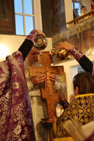В завершение Великого славословия Крест при пении Трисвятого был изнесен на середину храма, после чего владыка Феофан совершил чин Воздвижения Животворящего Креста – архиерей возносил Крест на четыре стороны света под пение стократного «Господи, помилуй», а два священника возливали на святыню благовония.