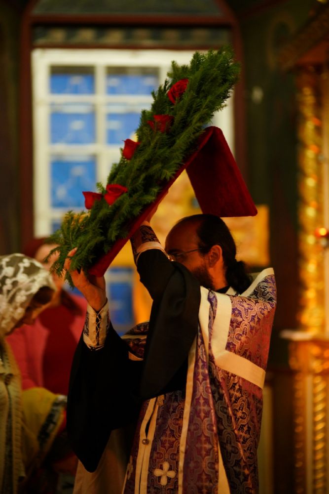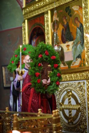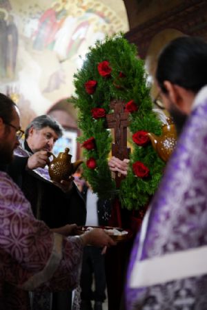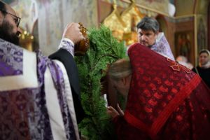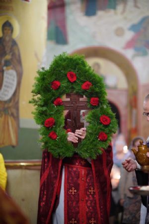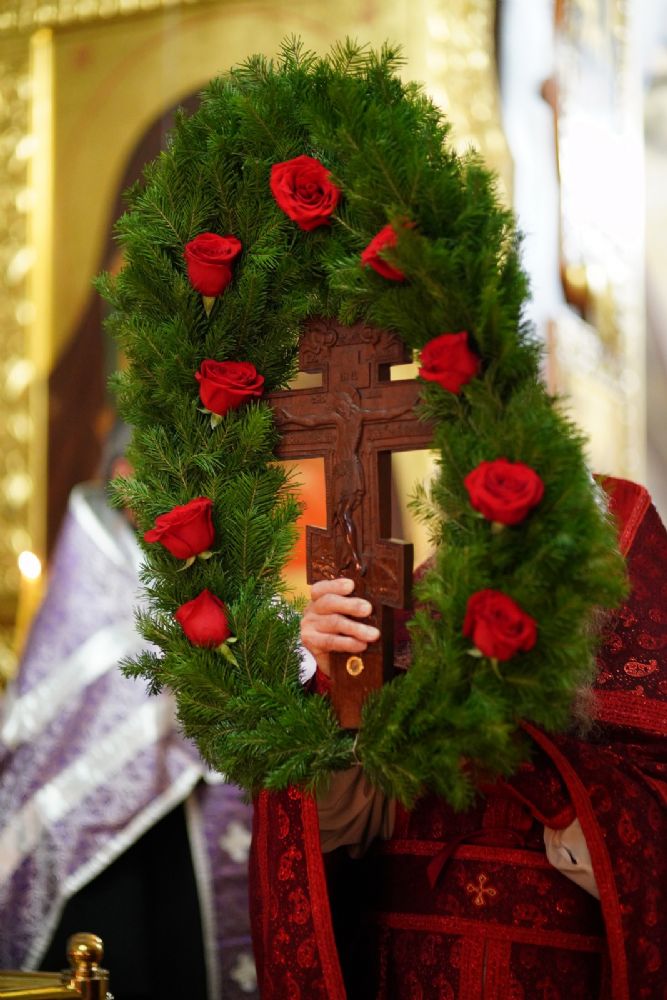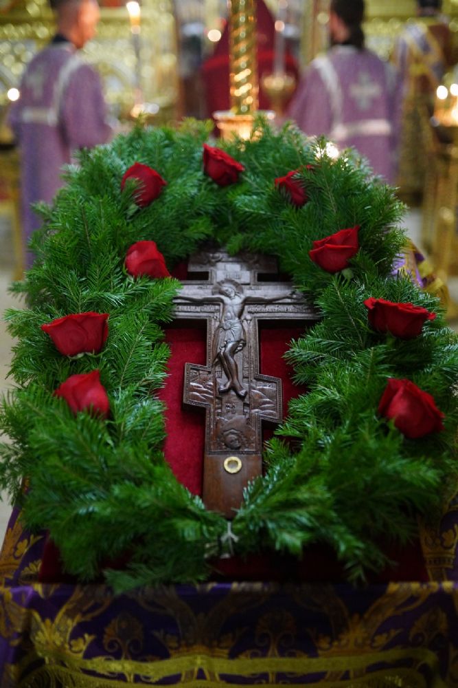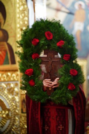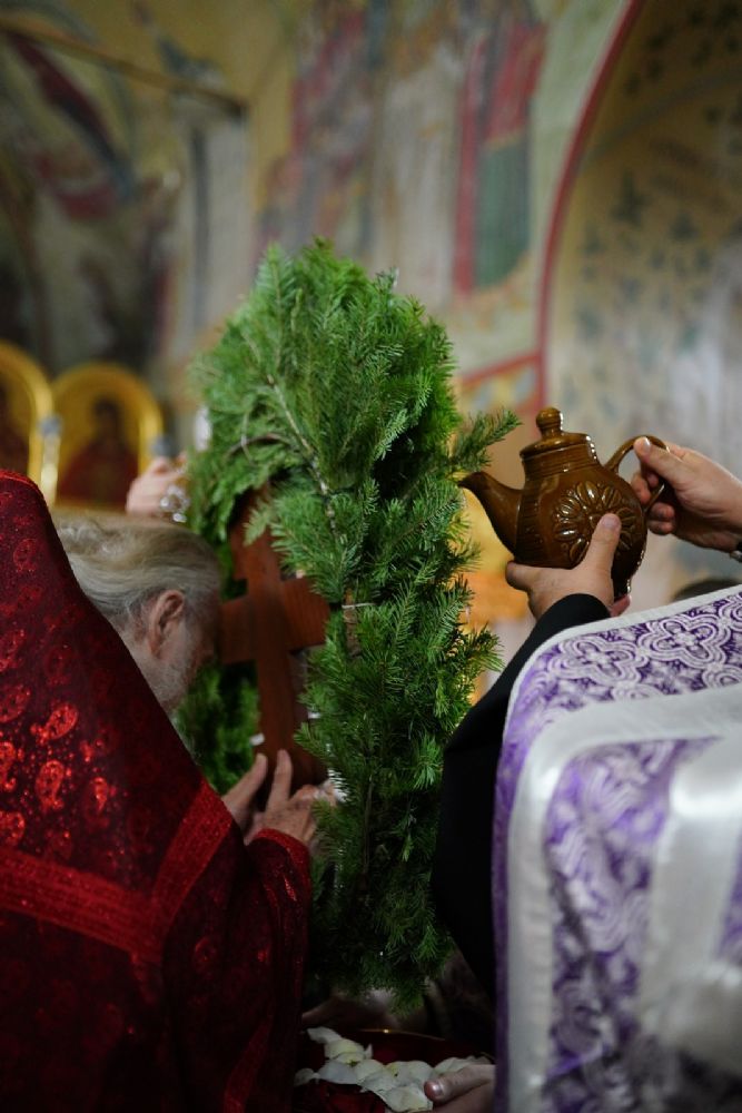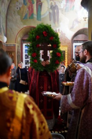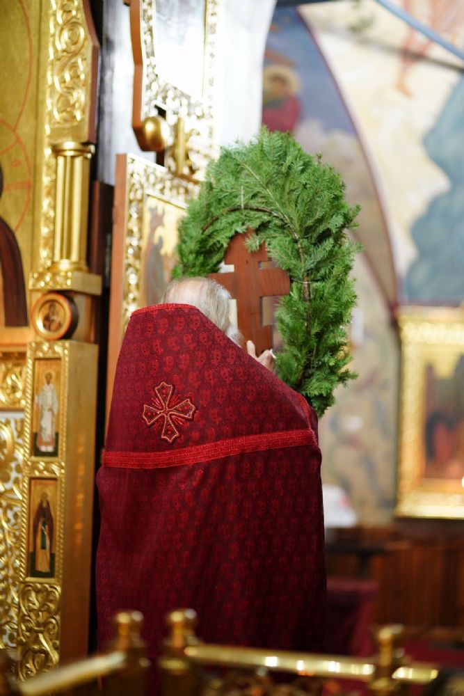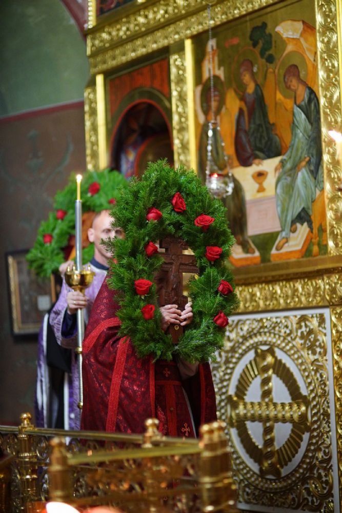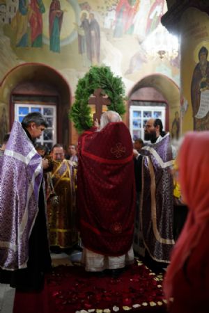 Во время пения Великого славословия было совершено каждение креста, а при пении трисвятого совершено земное поклонение и святой крест был изнесен из алтаря в центр храма. После троекратного пения тропаря по установившейся в храме традиции был совершен чин воздвижения Креста Господня. Настоятель храма взял в руки святой крест и взошел с ним на специально установленное возвышение в центре храма. Протодиакон возглашал пять особых прошений о Церкви, государстве и людях, после каждого из которых хор пел «сотницу» – повторял 100 раз «Господи, помилуй», причем первые 50 раз пение постепенно стихало и спускалось на низкие ноты, а вторую половину, наоборот, усиливалось и возвышалось. В это время настоятель осенял крестом молящихся и, высоко подняв его, постепенно опускал практически до земли и снова поднимал ввысь и осенял, а сослужащие священники возливали на крест благовонную розовую воду.