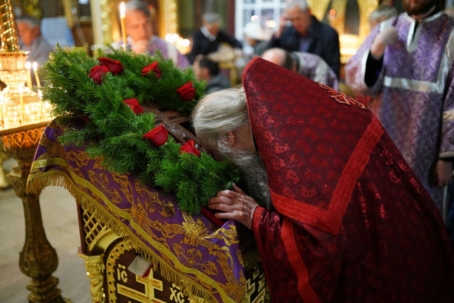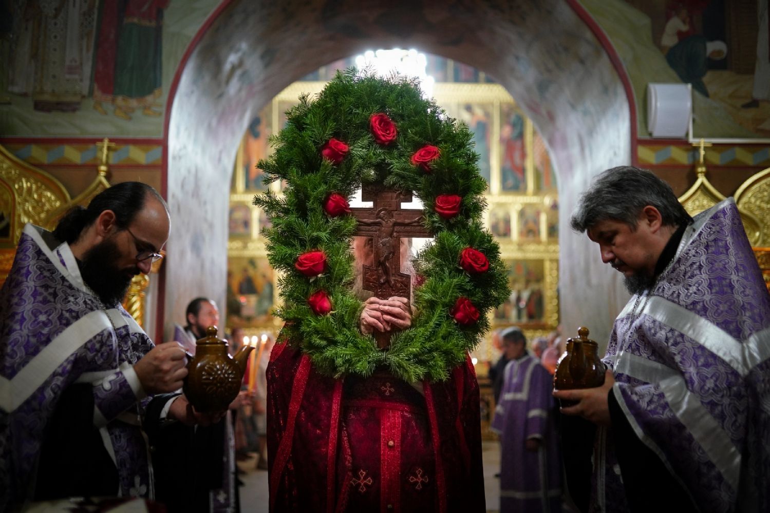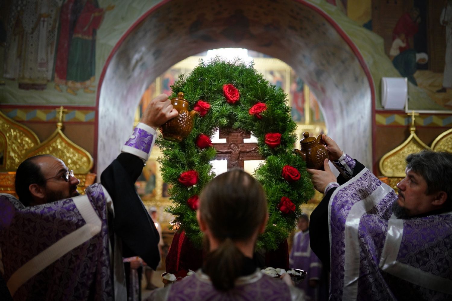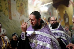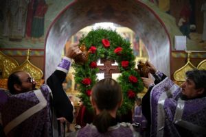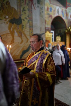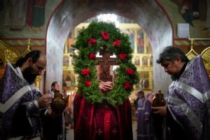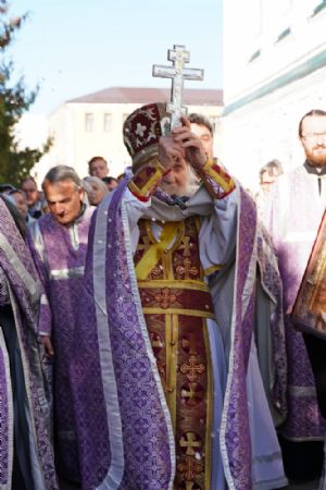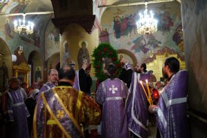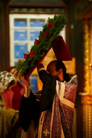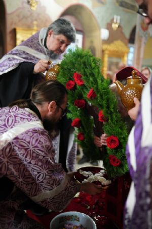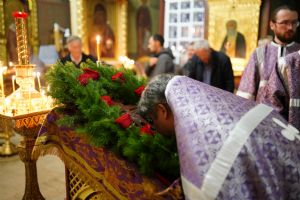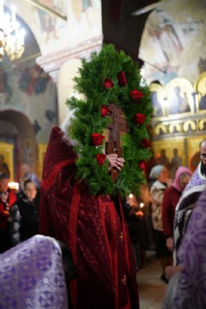 Во время пения Великого славословия было совершено каждение креста, а при пении трисвятого совершено земное поклонение и святой крест был изнесен из алтаря в центр храма. После троекратного пения тропаря по установившейся в храме традиции был совершен чин воздвижения Креста Господня. Настоятель храма взял в руки святой крест и взошел с ним на специально установленное возвышение в центре храма. Протодиакон возглашал пять особых прошений о Церкви, государстве и людях, после каждого из которых хор пел «сотницу» – повторял 100 раз «Господи, помилуй», причем первые 50 раз пение постепенно стихало и спускалось на низкие ноты, а вторую половину, наоборот, усиливалось и возвышалось. В это время настоятель осенял крестом молящихся и, высоко подняв его, постепенно опускал практически до земли и снова поднимал ввысь и осенял, а сослужащие священники возливали на крест благовонную розовую воду.