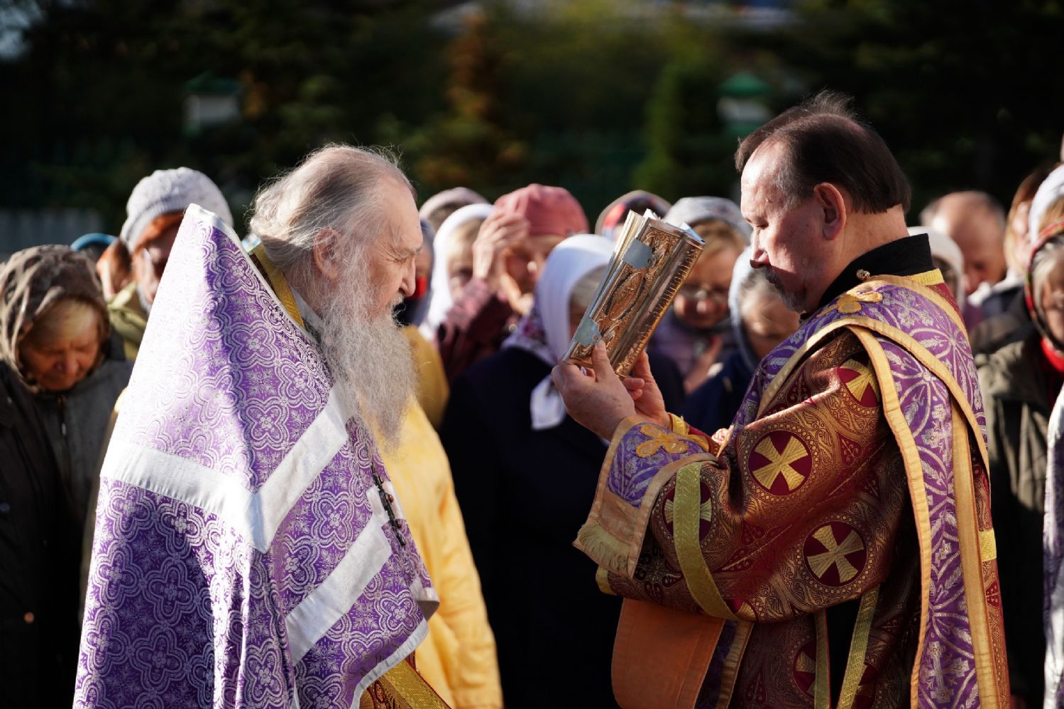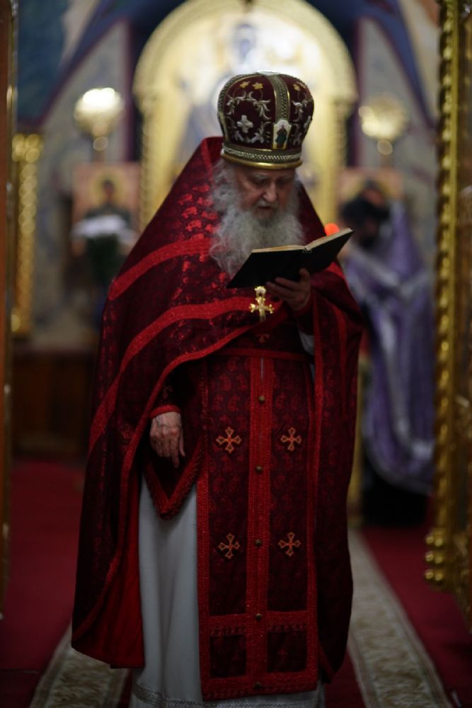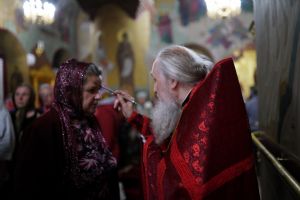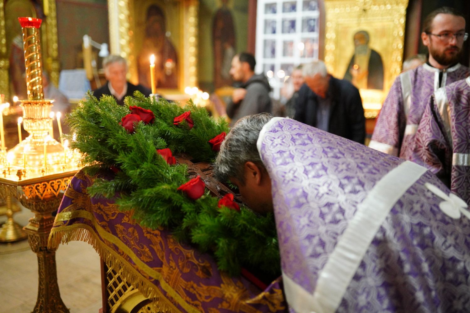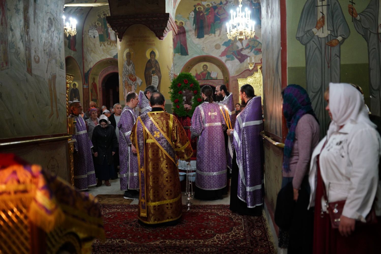 Во время пения Великого славословия было совершено каждение креста, а при пении трисвятого совершено земное поклонение и святой крест был изнесен из алтаря в центр храма. После троекратного пения тропаря по установившейся в храме традиции был совершен чин воздвижения Креста Господня. Настоятель храма взял в руки святой крест и взошел с ним на специально установленное возвышение в центре храма. Протодиакон возглашал пять особых прошений о Церкви, государстве и людях, после каждого из которых хор пел «сотницу» – повторял 100 раз «Господи, помилуй», причем первые 50 раз пение постепенно стихало и спускалось на низкие ноты, а вторую половину, наоборот, усиливалось и возвышалось. В это время настоятель осенял крестом молящихся и, высоко подняв его, постепенно опускал практически до земли и снова поднимал ввысь и осенял, а сослужащие священники возливали на крест благовонную розовую воду.