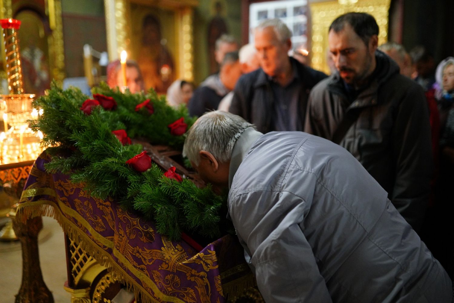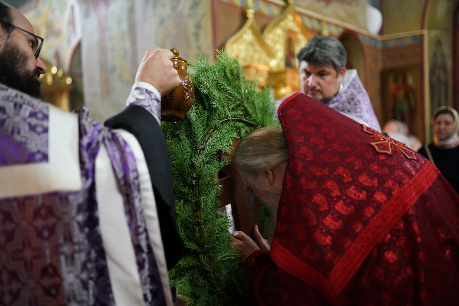 Подобное воздвижение совершалось на четыре стороны света, а на пятый раз повторялось лицом к алтарю. По завершении чина, при пении кондака праздника, крест был положен на аналой в центре храма, после чего совершалось поклонение с помазанием освященным елеем.