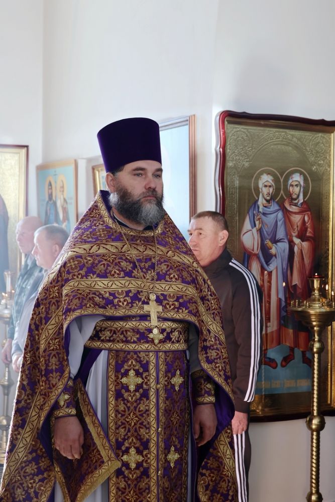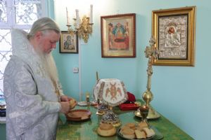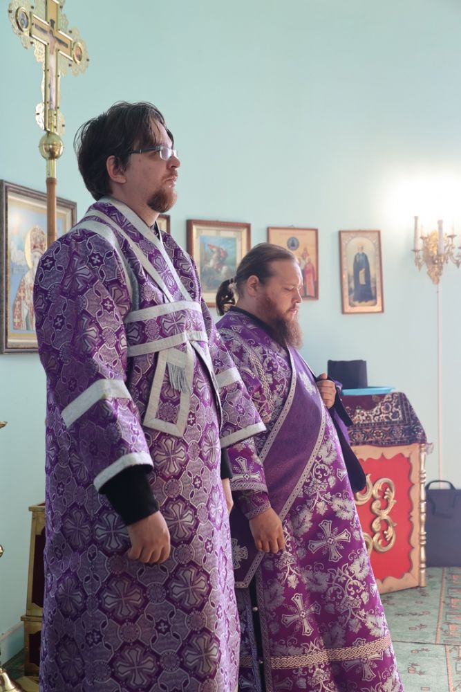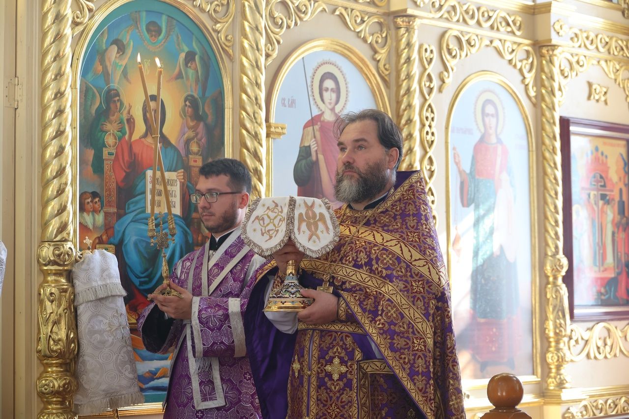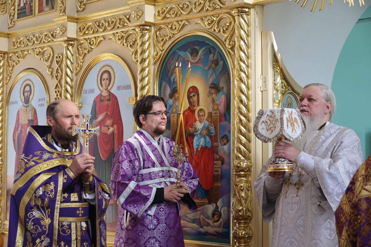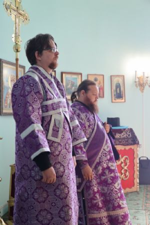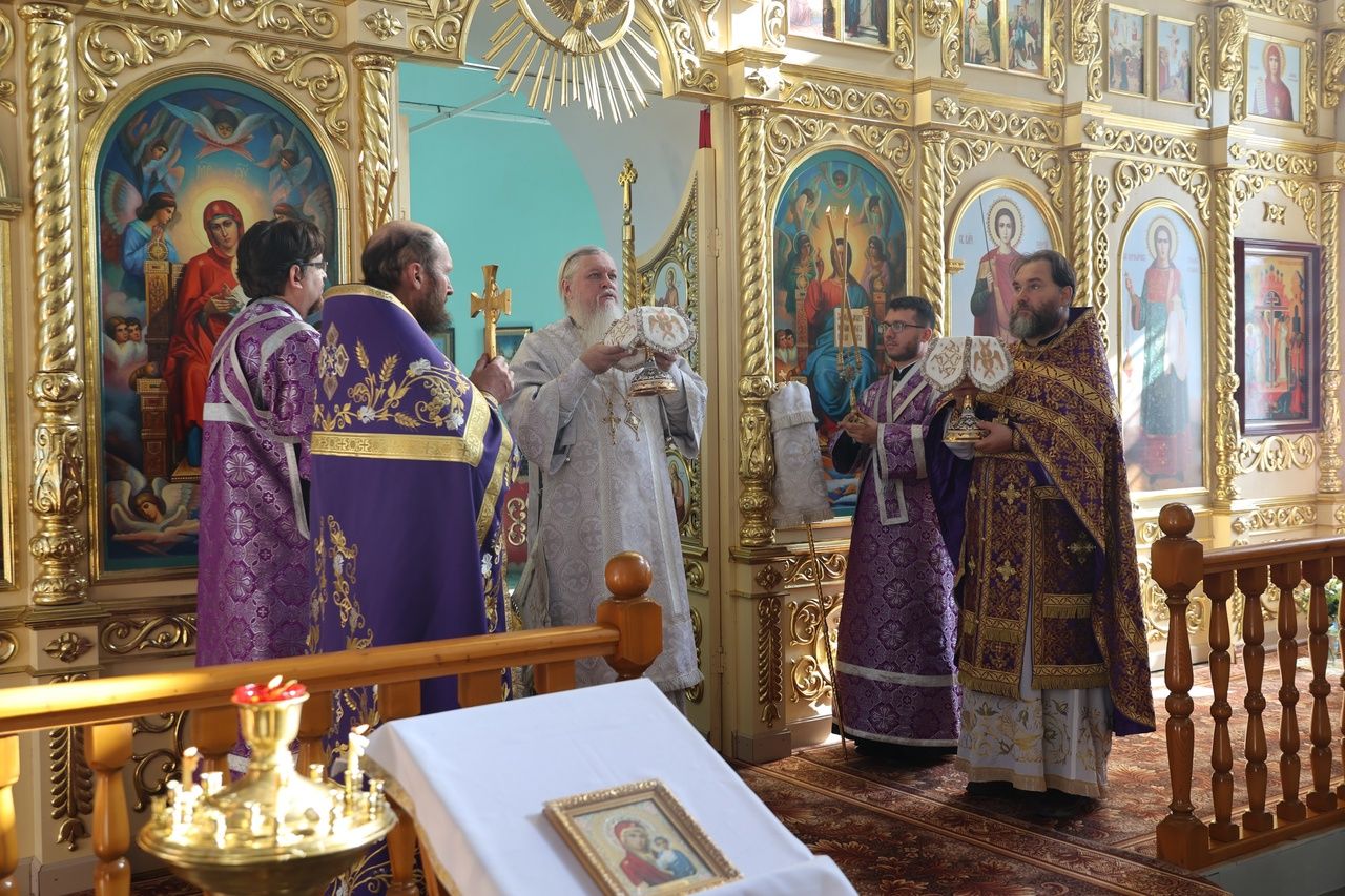 Его Преосвященству сослужили благочинный Северного церковного округа, настоятель храма Архистратига Михаила, п. Сернур протоиерей Владимир Власов, настоятель храма Покрова Пресвятой Богородицы с. Марисола протоиерей Сергий Сильдушкин, клирик Никольского кафедрального собора г. Волжска диакон Иоанн Захаров. Песнопения исполняли певчие храмов г. Йошкар-Олы под управлением регента Ирины Айгловой.