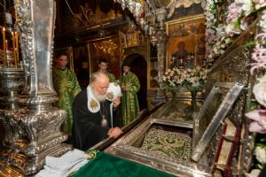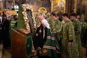 Епископ Сергиево-Посадский и Дмитровский Кирилл приветствовал Святейшего Владыку и преподнес Его Святейшеству ковчег с частицами святых мощей преподобного Сергия Радонежского, святителя Иннокентия Московского, просветителя Сибири и Аляски, преподобного Максима Грека и преподобного Антония Радонежского.