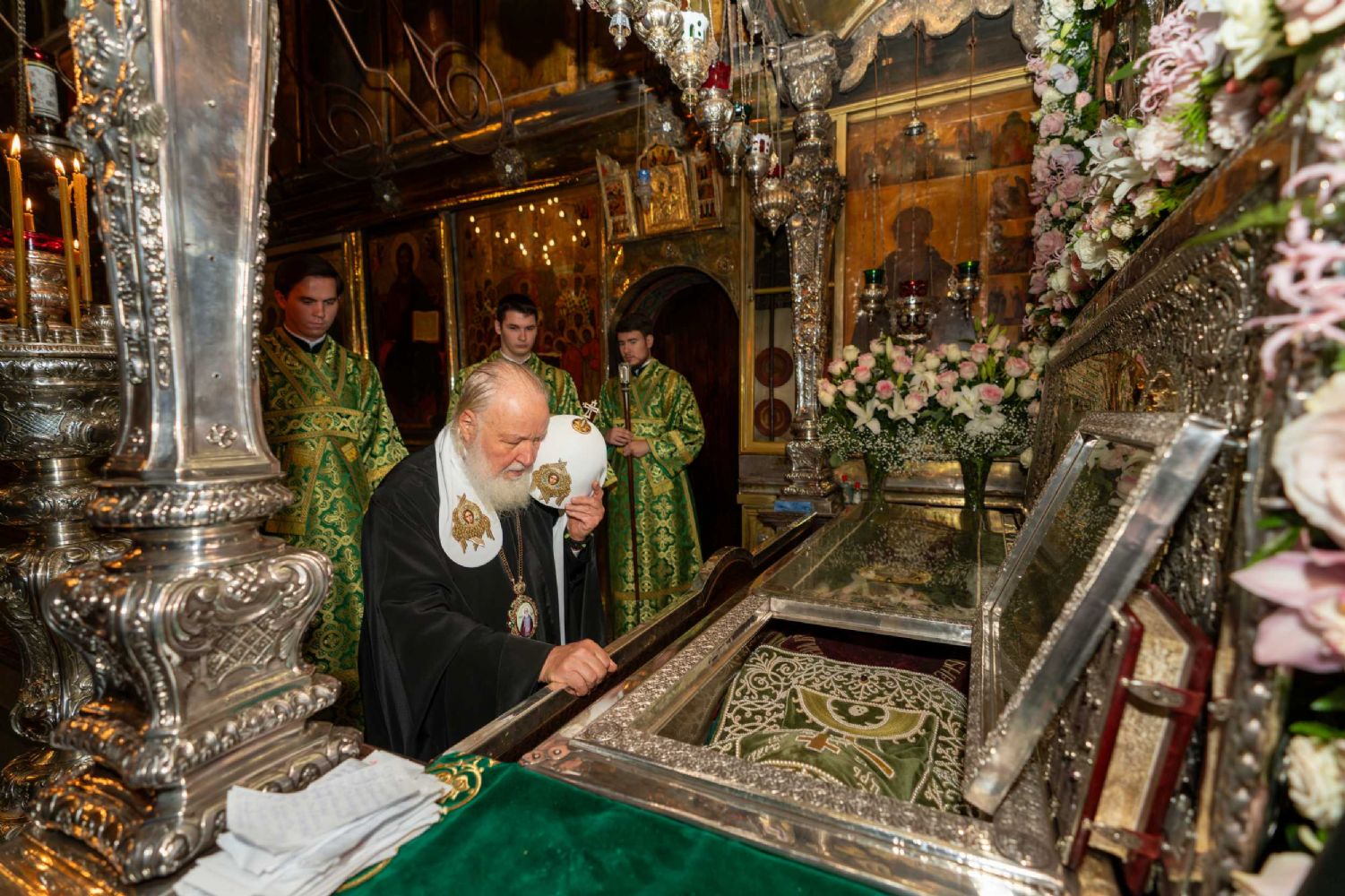 По окончании Литургии Святейший Патриарх Кирилл совершил в Успенском соборе молебен перед чтимой иконой преподобного Сергия Радонежского.