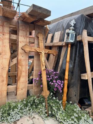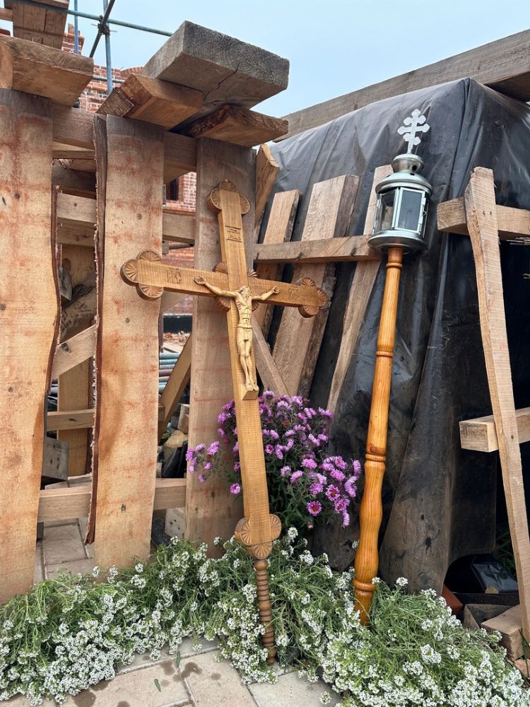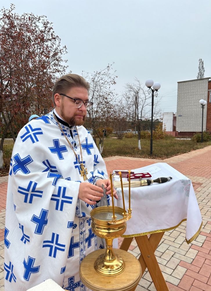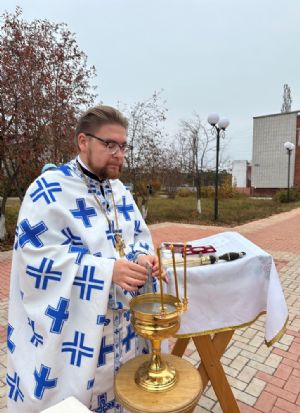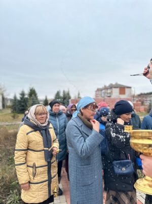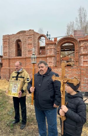 Настоятель Сретенского храма с. Азаново иерей Артемий Промович, окормляющий приход п. Юбилейный, в праздничный день совершил на строительной площадке водосвятный молебен. Далее состоялся первый крестный ход вокруг строящегося храма – все вместе вознесли молитву Пресвятой Богородице, испросили помощи Божией в скорейшем завершении строительства, отец Артемий и окропил стены храма и прихожан святой водой.