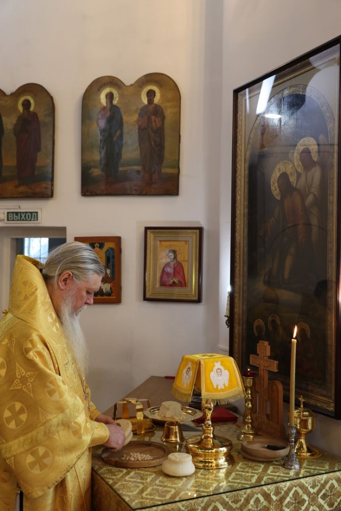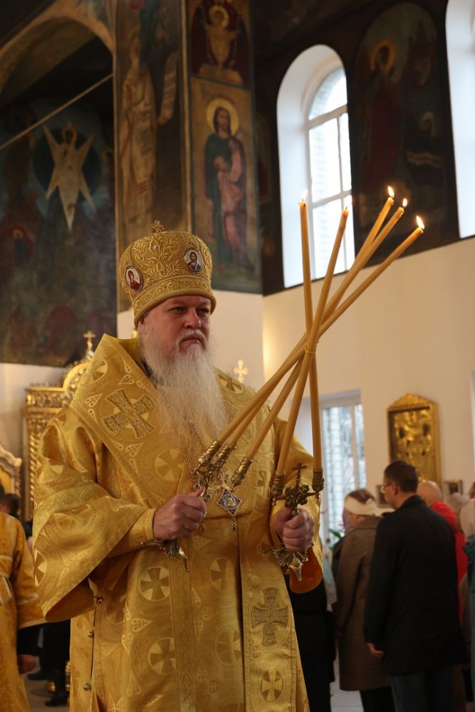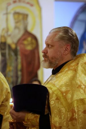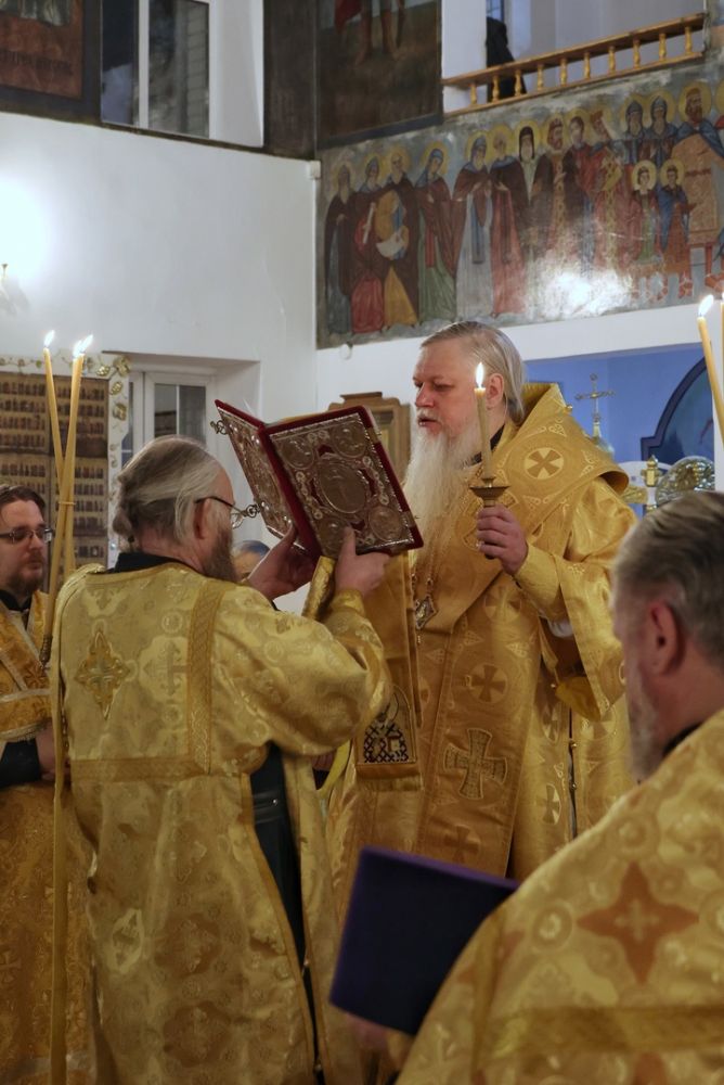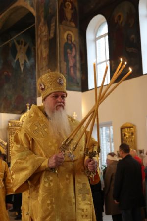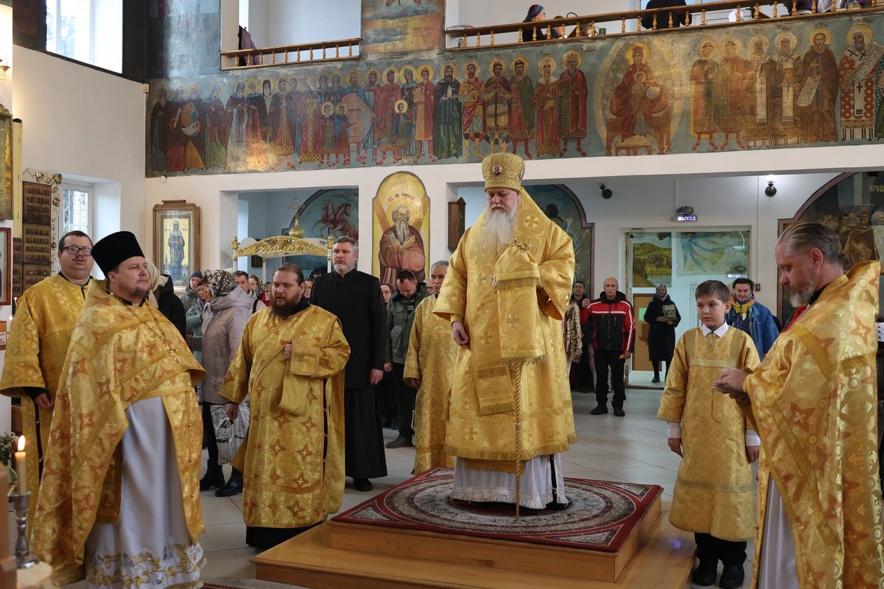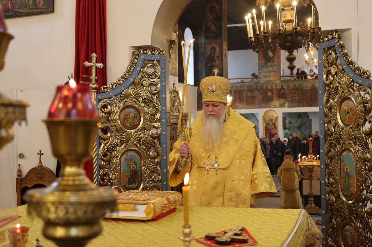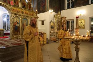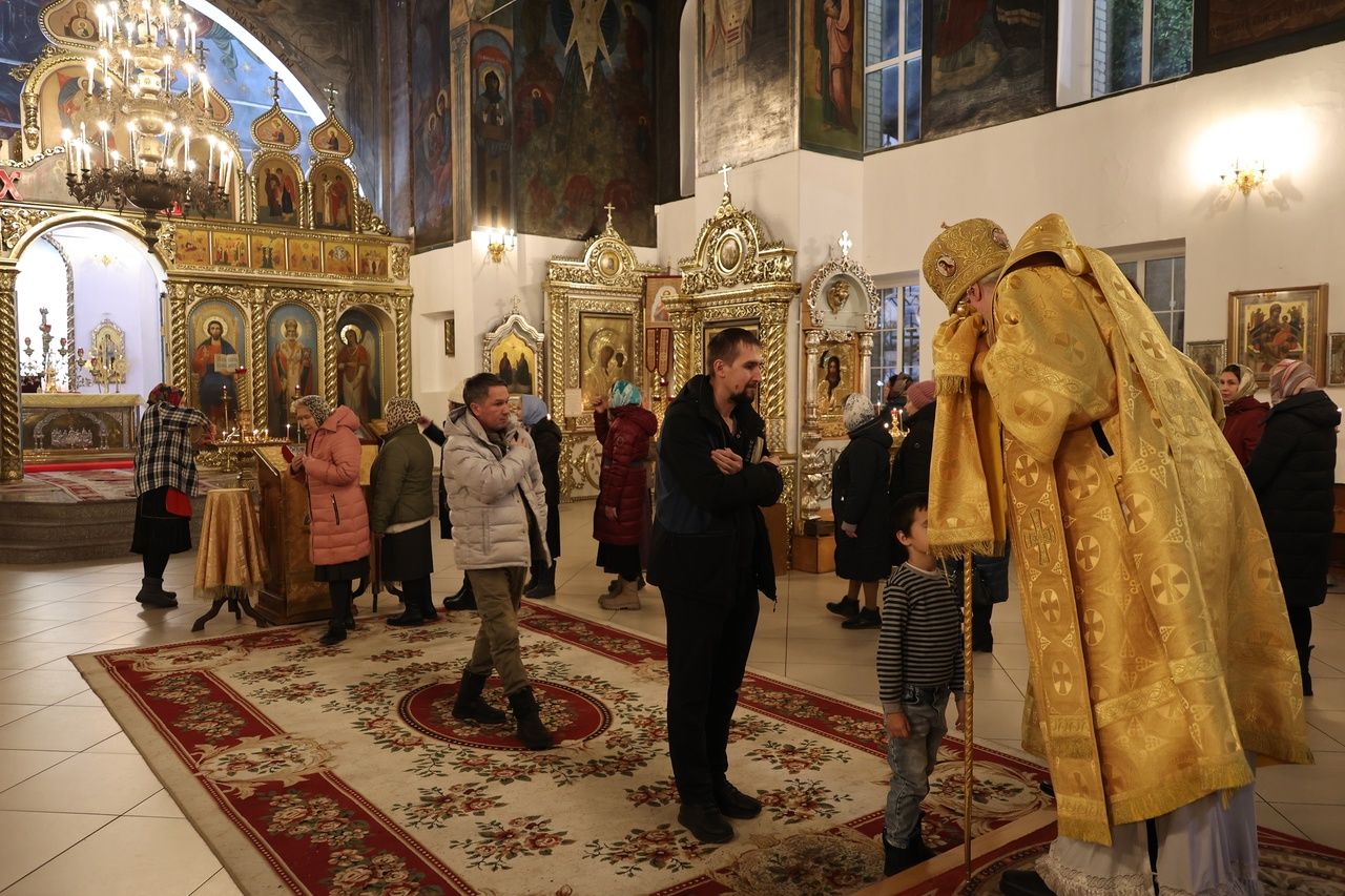 Архипастырю сослужили клирики собора, песнопения всенощного бдения исполнял архиерейский хор, за Литургией пел народный хор.