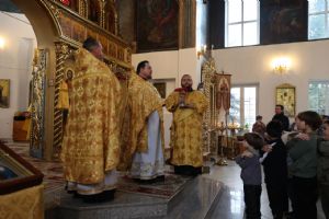 За Литургией возносились особые прошения о тех, кто погиб в дорожно-транспортных происшествиях, чтобы эти люди, окончившие свой земной путь внезапно, обрели от Бога милость.