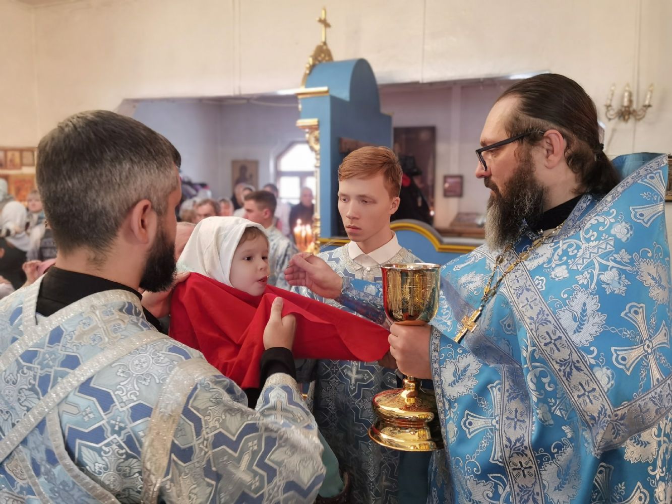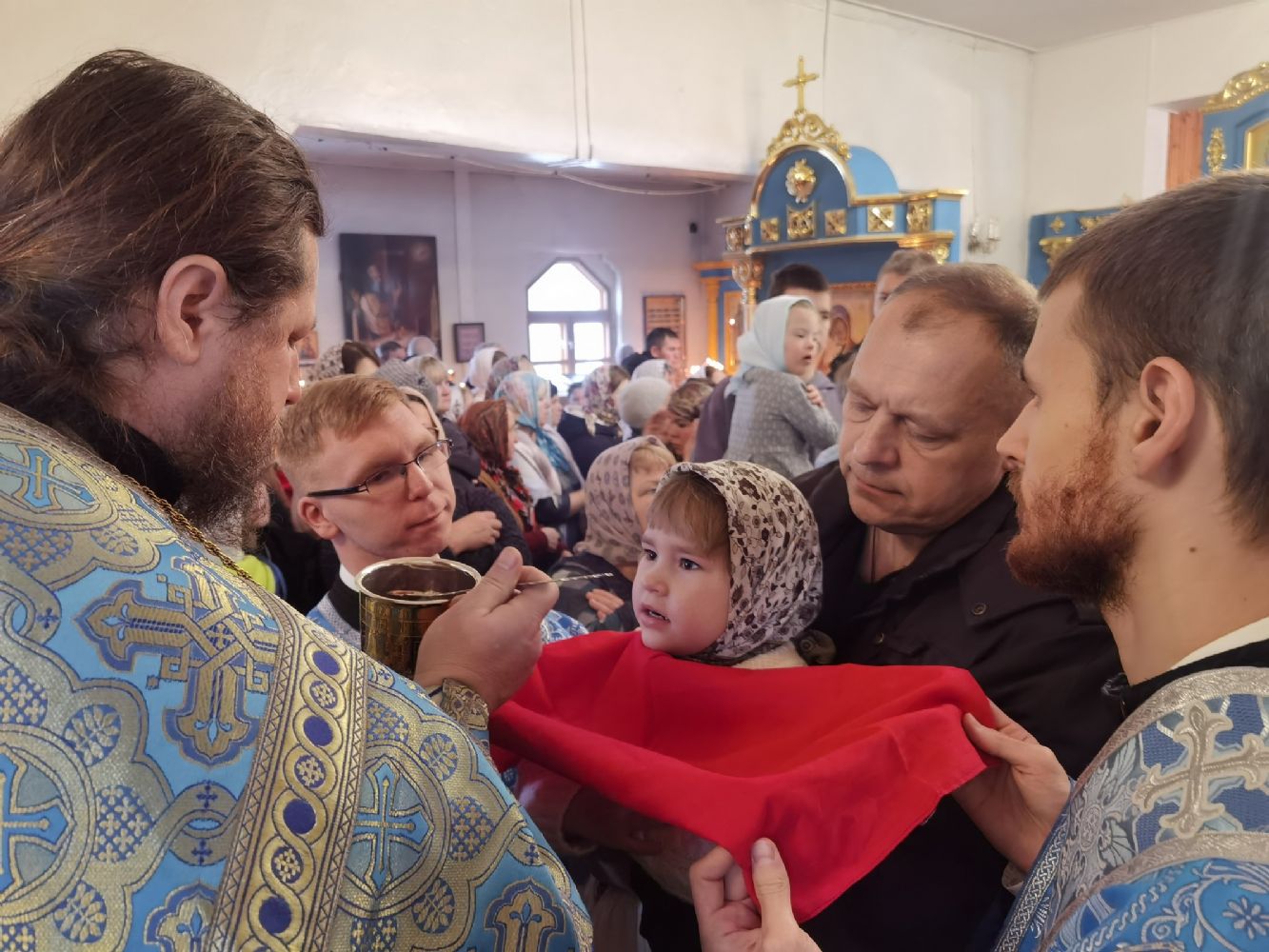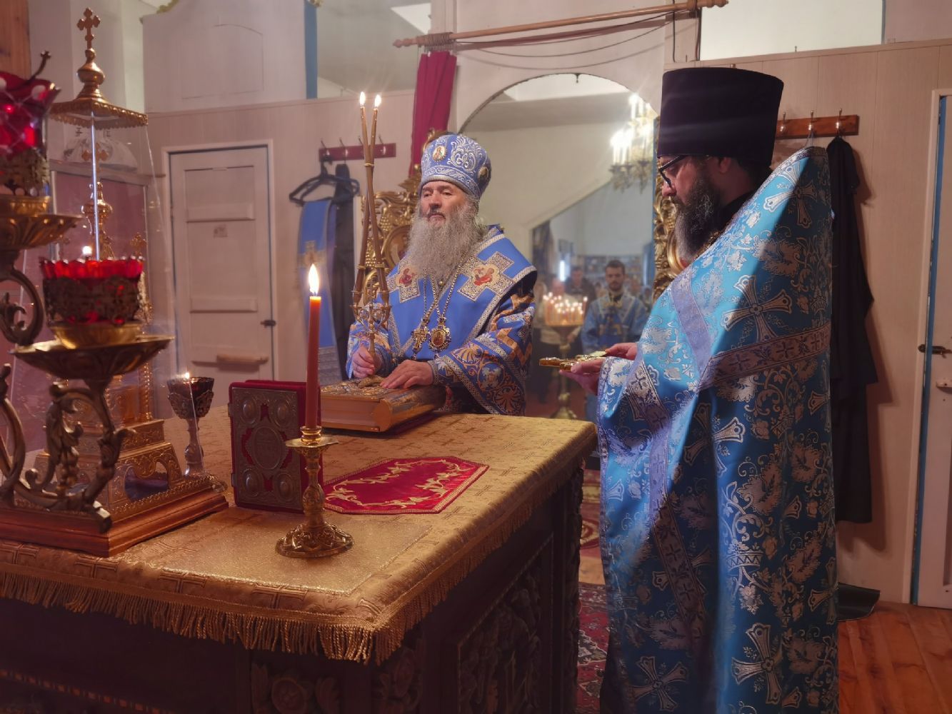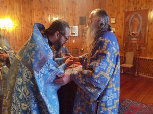 Архипастырю сослужили секретарь Йошкар-Олинского епархиального управления иерей Димитрий Дьяков, настоятель храма, благочинный Лугово-Марийского церковного округа протоиерей Алексий Никитин, заштатный клирик храма иерей Владимир Яшин и клирик Благовещенского кафедрального собора г. Йошкар-Олы диакон Андрей Дружинин. Пел хор храма, часть песнопений звучала на марийском языке.