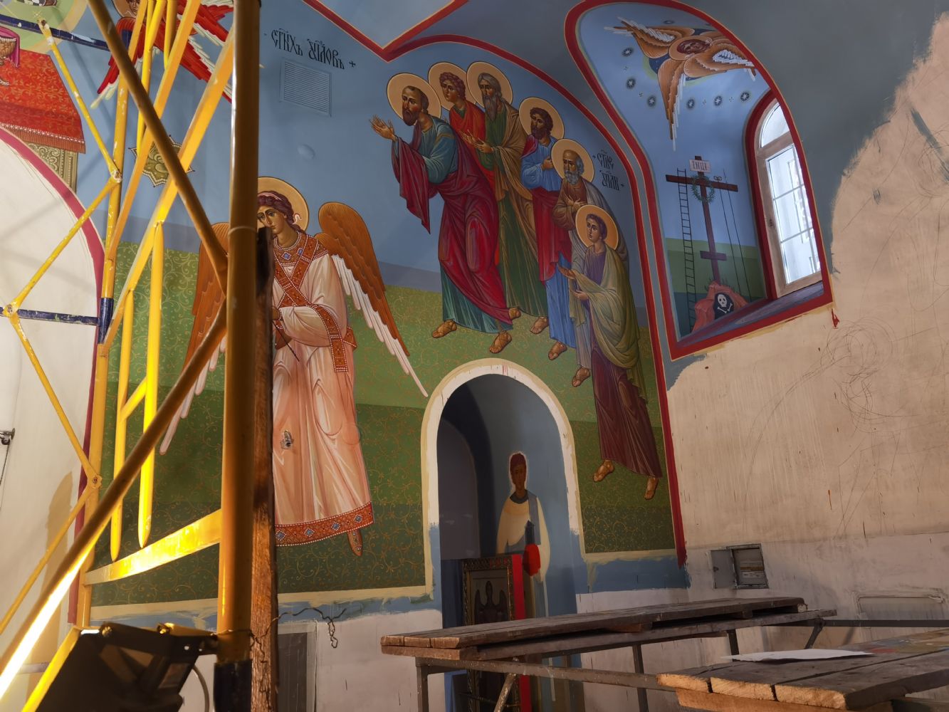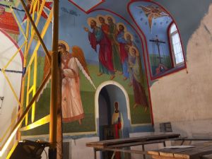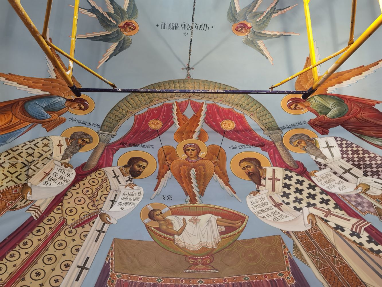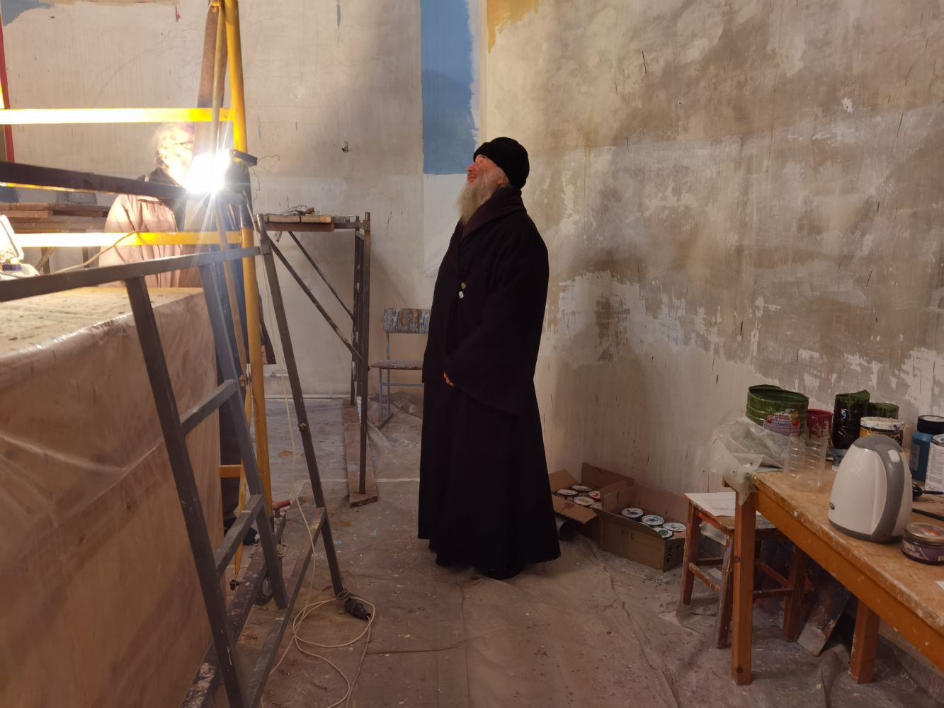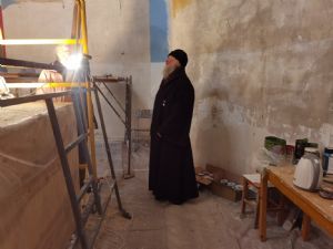 В завершение митрополит Иоанн ознакомился с ходом ремонтных работ в нижнем приделе храма, освященном в честь вмц. Варвары – там идет роспись стен и сводов потолка.