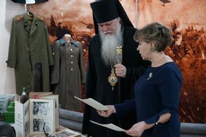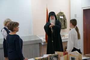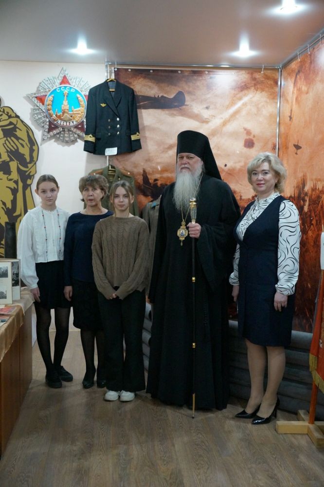В рамках визита в лицей владыка Феофан посетил школьный Музей боевой славы, где ознакомился с экспозициями и оставил запись в Книге отзывов.