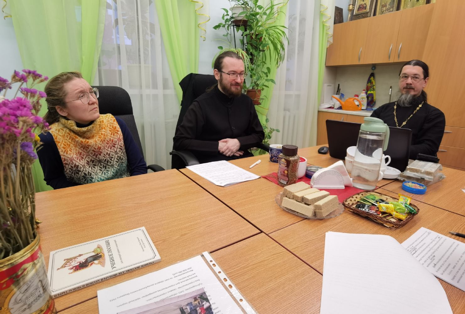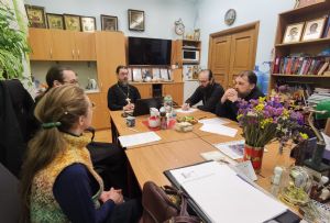 На встрече присутствовали преподаватели Епархиального центра подготовки церковных специалистов: протоиерей Алексий Михайлов (Литургика), чтец Григорий Михеев, магистр истории (Богослужебный устав), иерей Иоанн Кристев, магистр богословия (Священное Писание Нового Завета). Также среди участников были преподаватель церковнославянского языка гимназии имени Сергия Радонежского, кандидат философских наук Александр Тищенко; и секретарь комиссии, регент детско-юношеского хора «Благовест» Татьяна Чернова.