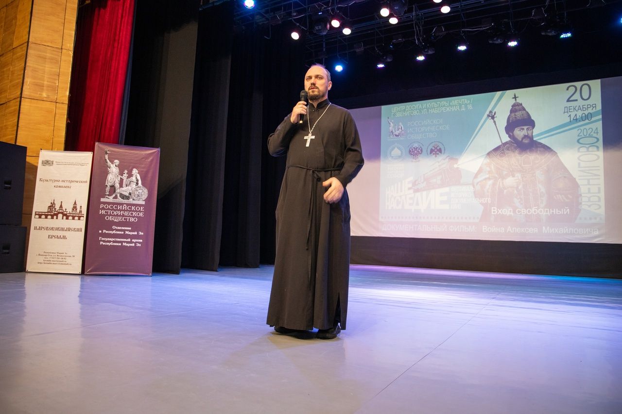 Завершил нашу встречу с жителями Звенигово настоятель Свято-Никольского Храма иерей Антоний Блинов, выступил с проникновенными словами наставления для участников мероприятия. Отец Антоний затронул тему важности сохранения и укрепления традиционных духовно-нравственных ценностей в контексте как показанных в фильме исторических событий, так и проводимой в наши дни Специальной военной операции.