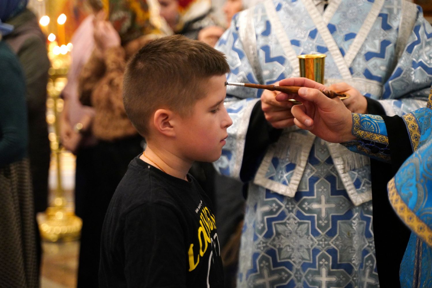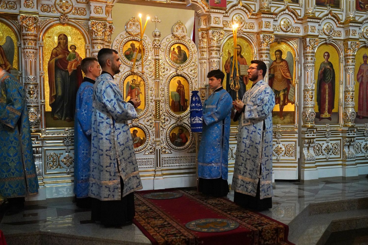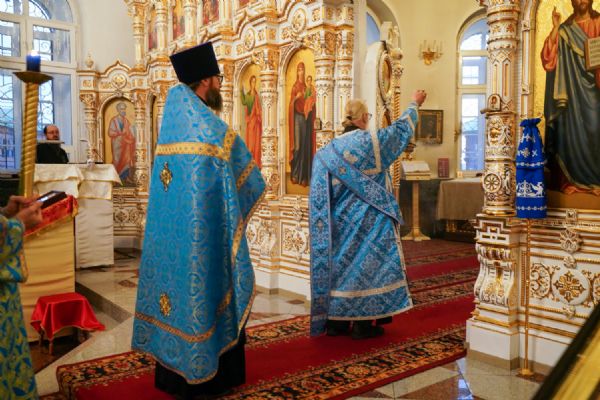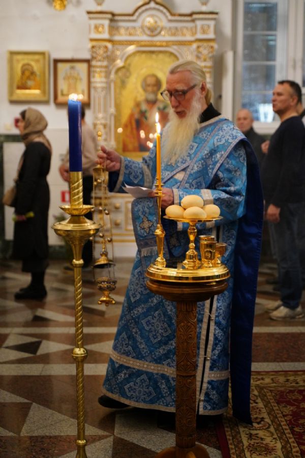 За богослужением читались ветхозаветные паримии из книг Бытия, Пророка Иезекииля и Притчей Соломоновых, прообразующие Пресвятую Богородицу. На литии освящались хлебы, пшеница, вино и елей.