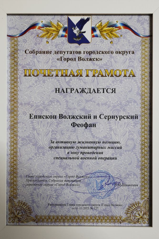 Во время праздничного мероприятия епископу Феофану была вручена Почетная грамота Собрания депутатов ГО «Город Волжск» за активную жизненную позицию и организацию гуманитарных миссий в зону СВО. Также Почетными грамотами были отмечены активные жители города.