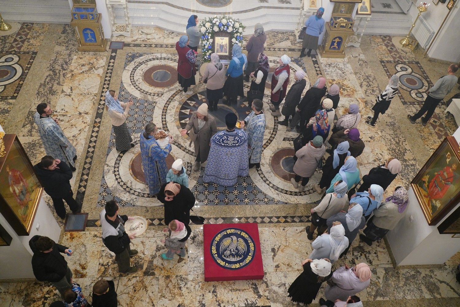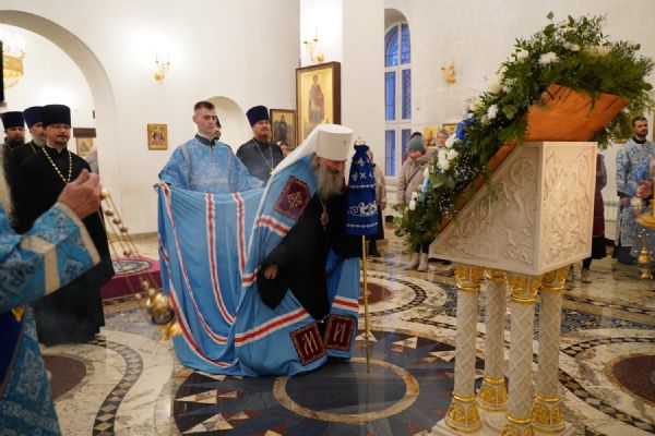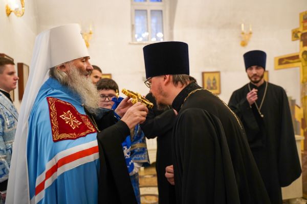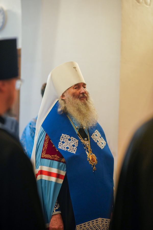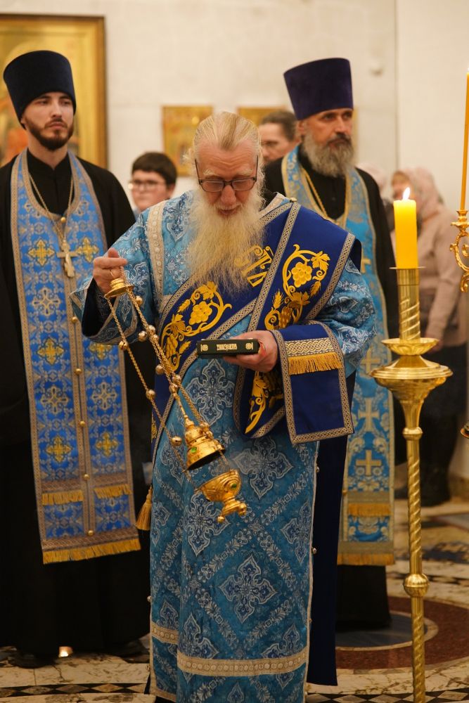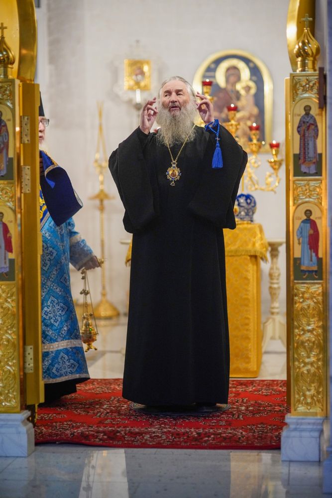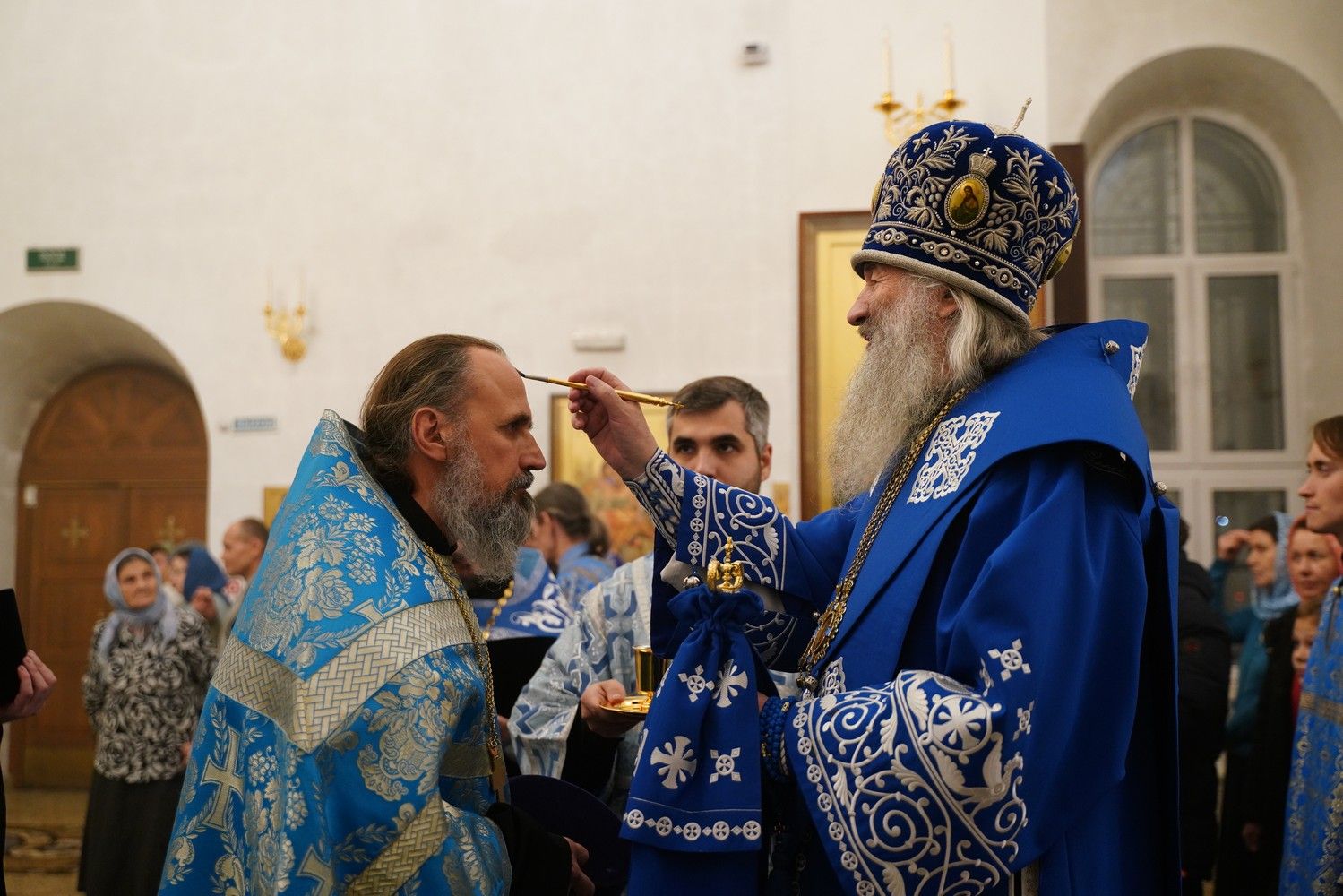 Архипастырю сослужили настоятель храма иерей Алексий Михеев, ключарь Благовещенского кафедрального собора протоиерей Сергий Поглазов, настоятель храма Казанской иконы Божией Матери с. Нурма иерей Александр Коваль, клирики храма иконы «Всех скорбящих Радость» иереи Алексий Кирюшкин, Игорь Коваль и Сергий Пуртов, протодиакон Михаил Козловский и клирик Благовещенского кафедрального собора диакон Андрей Дружинин. Песнопения исполнял хор храма под управлением Александры Ивановой.