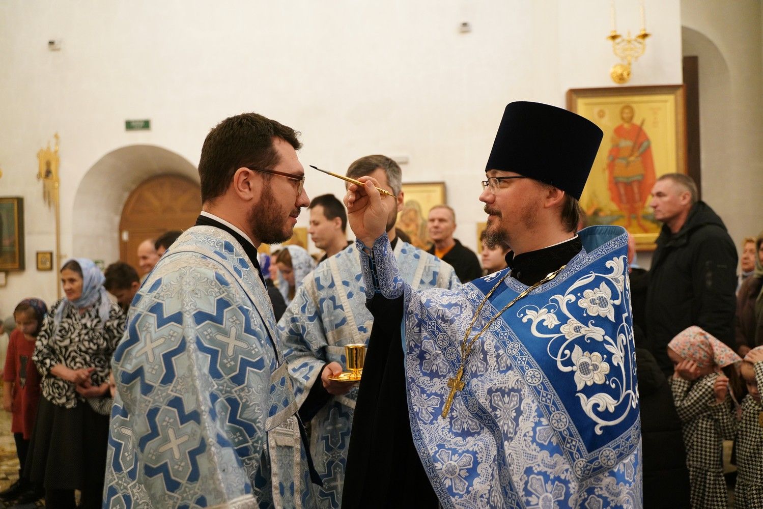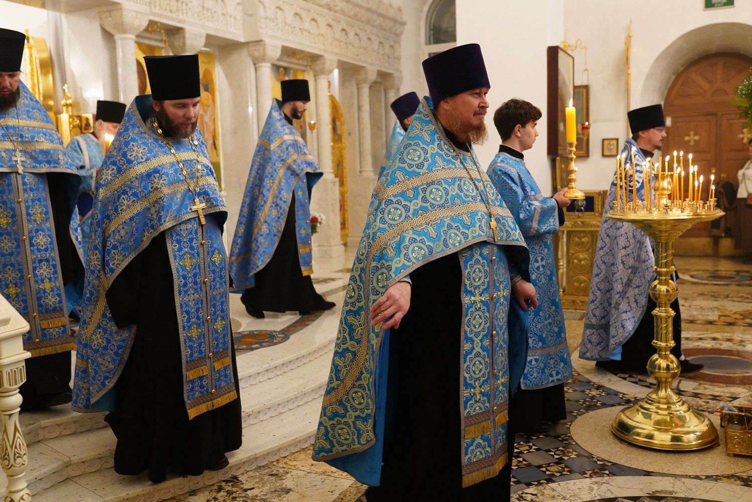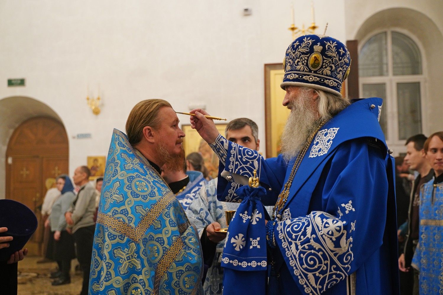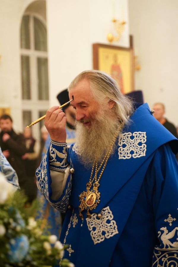 Архипастырю сослужили настоятель храма иерей Алексий Михеев, ключарь Благовещенского кафедрального собора протоиерей Сергий Поглазов, настоятель храма Казанской иконы Божией Матери с. Нурма иерей Александр Коваль, клирики храма иконы «Всех скорбящих Радость» иереи Алексий Кирюшкин, Игорь Коваль и Сергий Пуртов, протодиакон Михаил Козловский и клирик Благовещенского кафедрального собора диакон Андрей Дружинин. Песнопения исполнял хор храма под управлением Александры Ивановой.