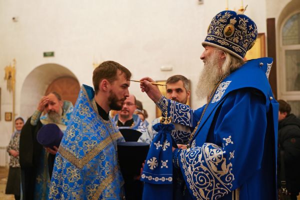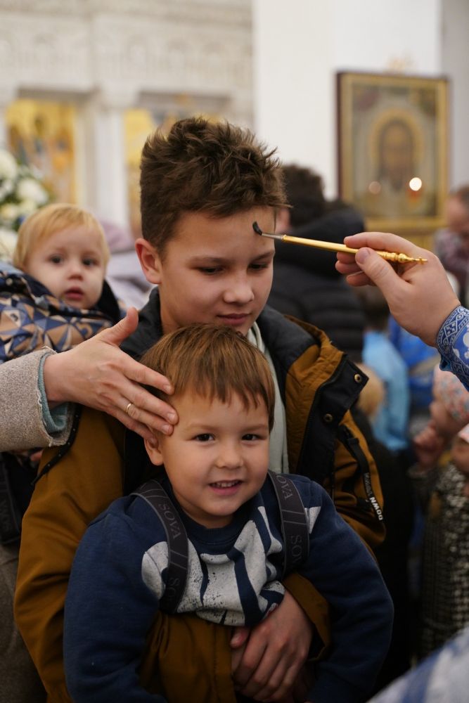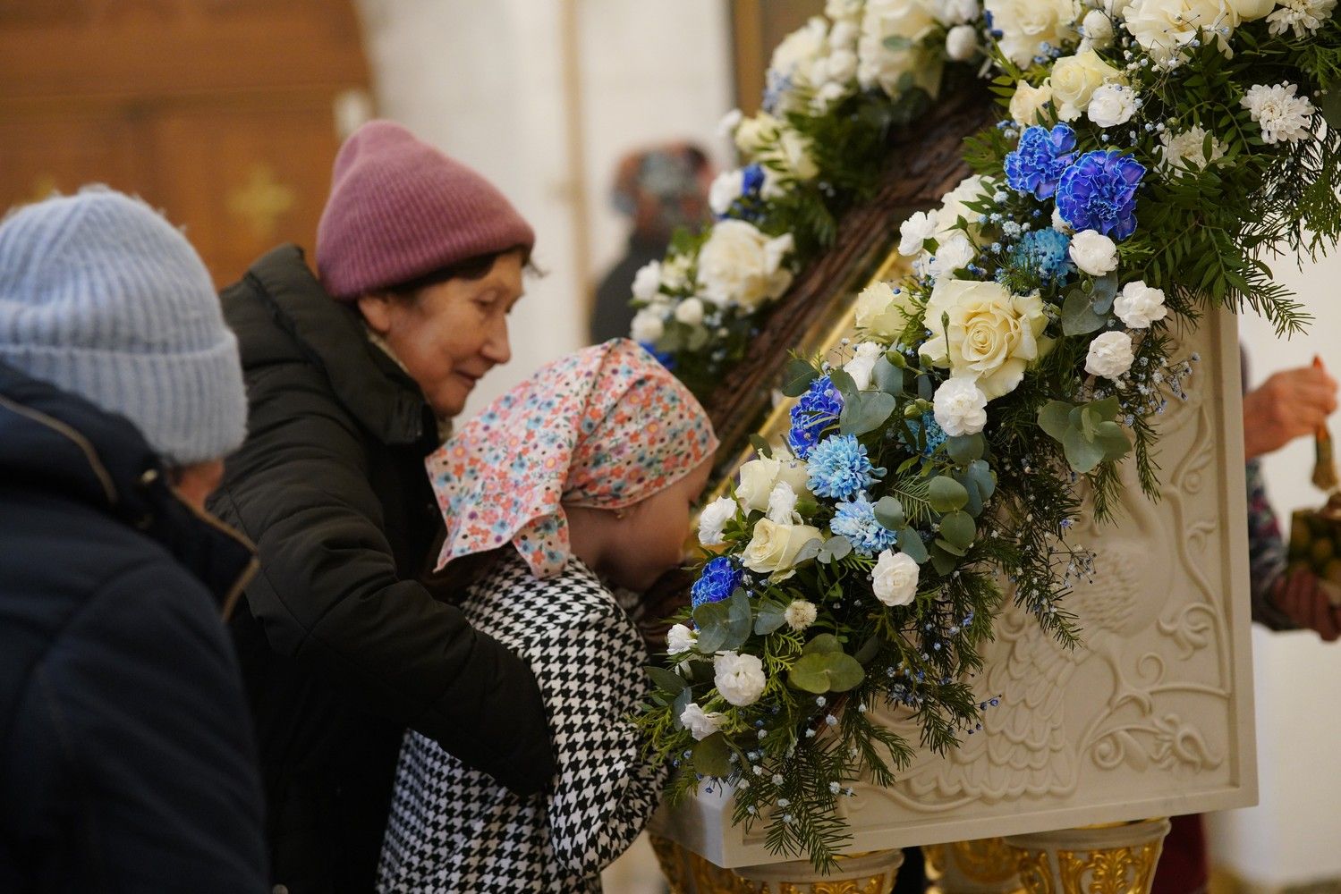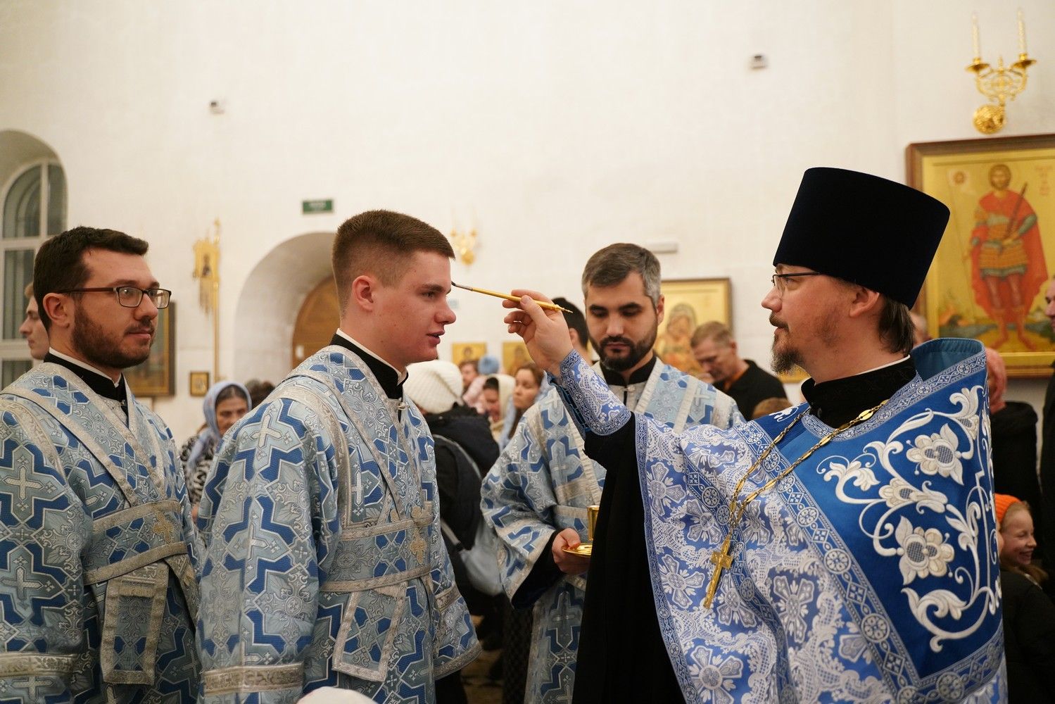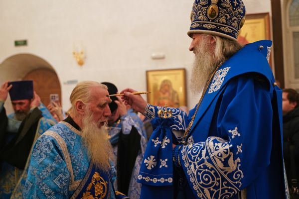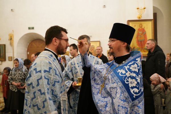 Архипастырю сослужили настоятель храма иерей Алексий Михеев, ключарь Благовещенского кафедрального собора протоиерей Сергий Поглазов, настоятель храма Казанской иконы Божией Матери с. Нурма иерей Александр Коваль, клирики храма иконы «Всех скорбящих Радость» иереи Алексий Кирюшкин, Игорь Коваль и Сергий Пуртов, протодиакон Михаил Козловский и клирик Благовещенского кафедрального собора диакон Андрей Дружинин. Песнопения исполнял хор храма под управлением Александры Ивановой.
