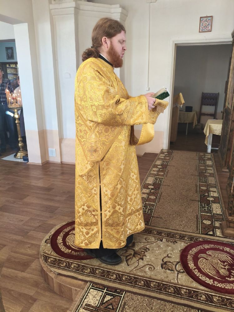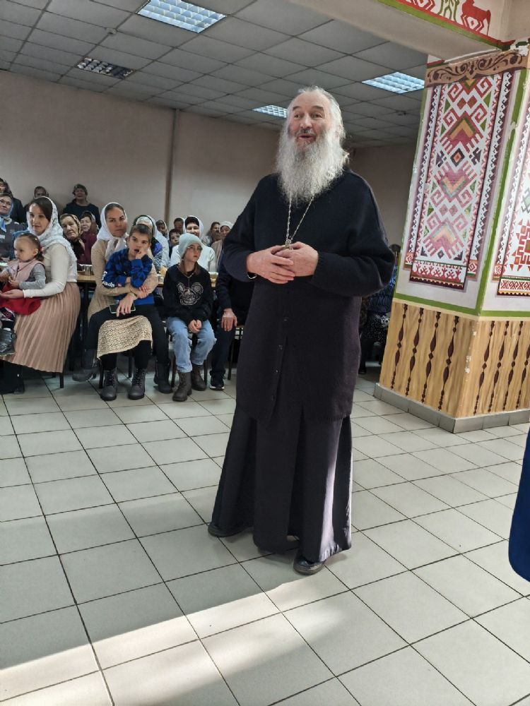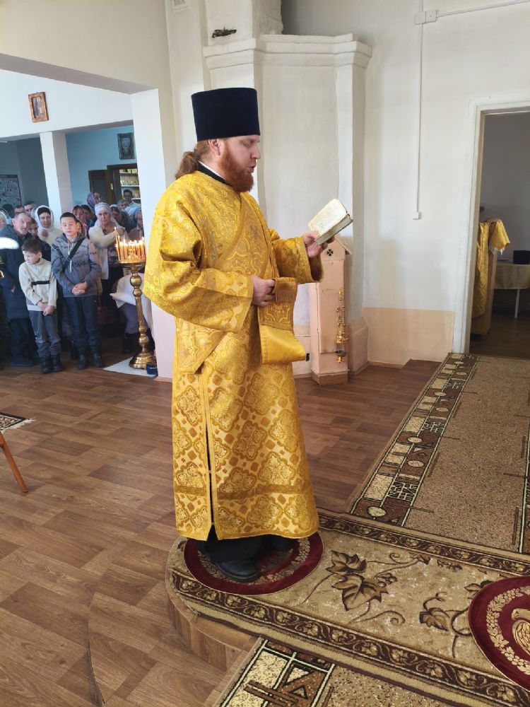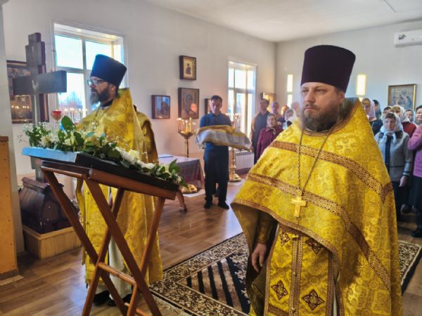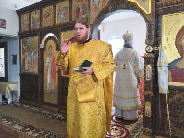 Владыке сослужили секретарь Йошкар-Олинского епархиального управления иерей Димитрий Дьяков, благочинный Лугово-Марийского церковного округа протоиерей Алксий Никитин, настоятель храма иерей Михаил Репин и клирик Благовещенского кафедрального собора диакон Андрей Дружинин. Песнопения исполнял хор под управлением Ирины Айгловой. Молитвы «Верую» и «Отче наш» прихожане пели на марийском языке.