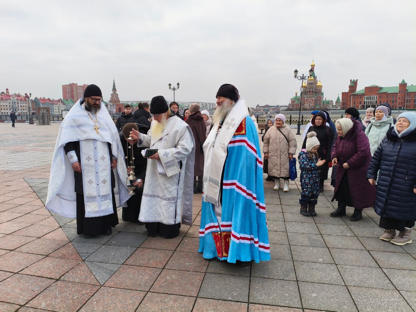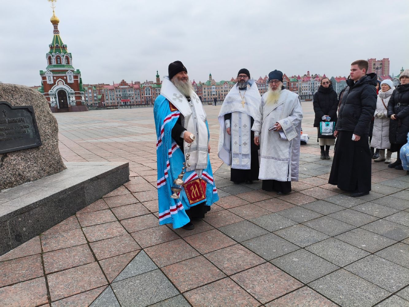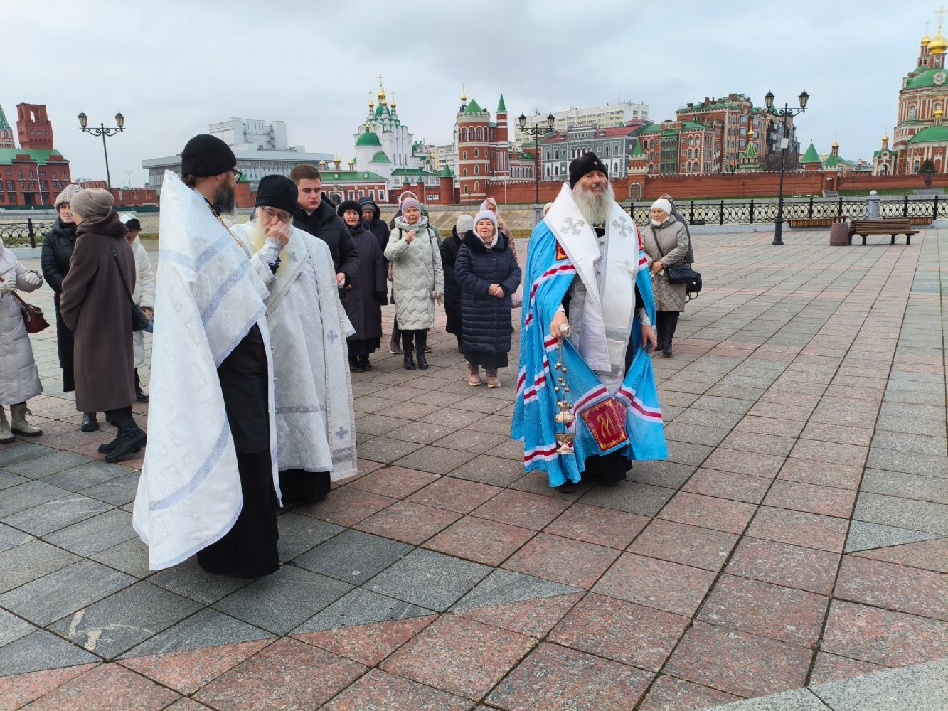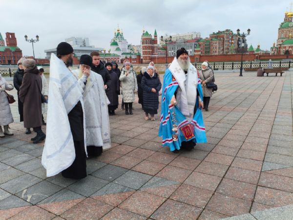 Владыке сослужили секретарь Йошкар-Олинского епархиального управления иерей Димитрий Дьяков, клирик храма иконы Богородицы «Всех скорбящих Радость» иерей Василий Пряморуков и протодиакон Михаил Козловский. Песнопения исполнял детско-юношеский хор «Благовест» под управлением Татьяны Черновой.