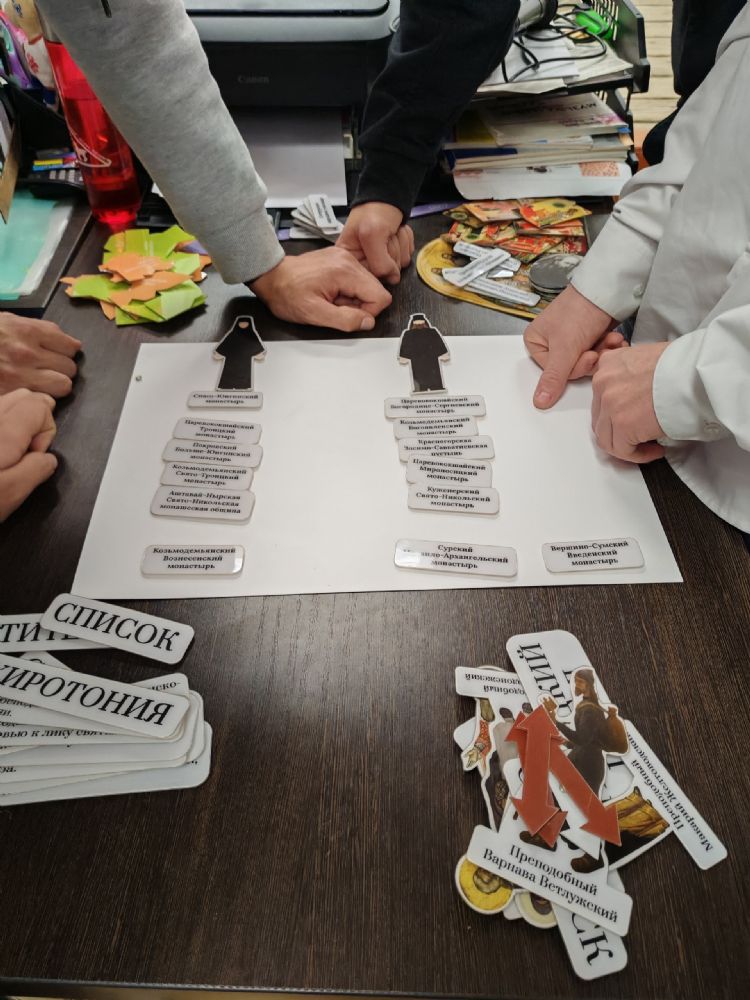 Школьники живо отозвались на предложение, их поддержали учителя и матушка с батюшкой. Все вместе поделились на пять команд: «Храм Богоявления Господня», «Монастыри», «Звезды, «Черепашки», «Вдохновение». Ребята выполняли задания с энтузиазмом и большим вниманием, вновь и вновь рассматривали информацию выставки, очень старались, чтобы ответы получались максимально точными. Командам нужно было собрать карту Марийской митрополии, разделенной на две епархии, расположить в правильном порядке клейма вокруг Мироносицкой иконы Пресвятой Богородицы, выбрать правильные определения таких терминов, как «святитель», «список», «хиротония», «солея», правильно расположить имена святых вокруг иконы новомучеников Марийских, разложить названия монастырей на женские и мужские… Очень захватывающей и интересной оказалось задание «стрела времени», где ребята должны были разложить хронологические события по годам.