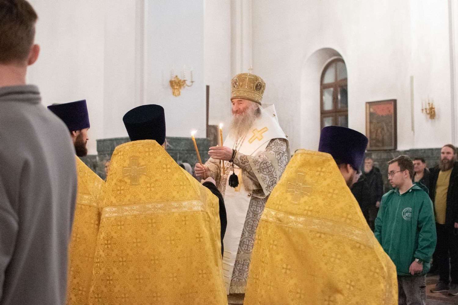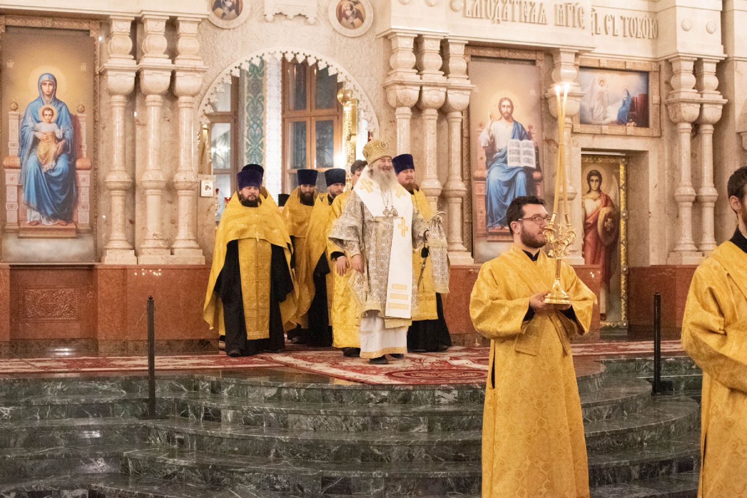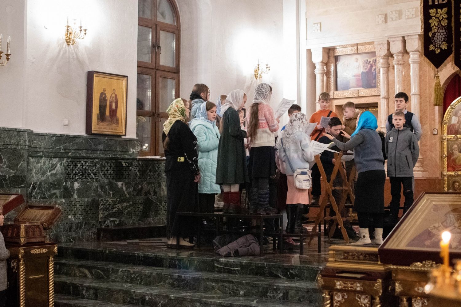 Владыке сослужили ключарь кафедрального собора протоиерей Сергий Поглазов, клирики собора иереи Никифор Захаров, Евгений Самойлов, Александр Староверов, Иоанн Милютин, диакон Артемий Бобоч, а также протодиакон Михаил Козловский. Песнопения исполняли старший и младший составы архиерейского детско-юношеского хора «Благовест» под управлением регентов Татьяны Черновой и Надежды Поздеевой.