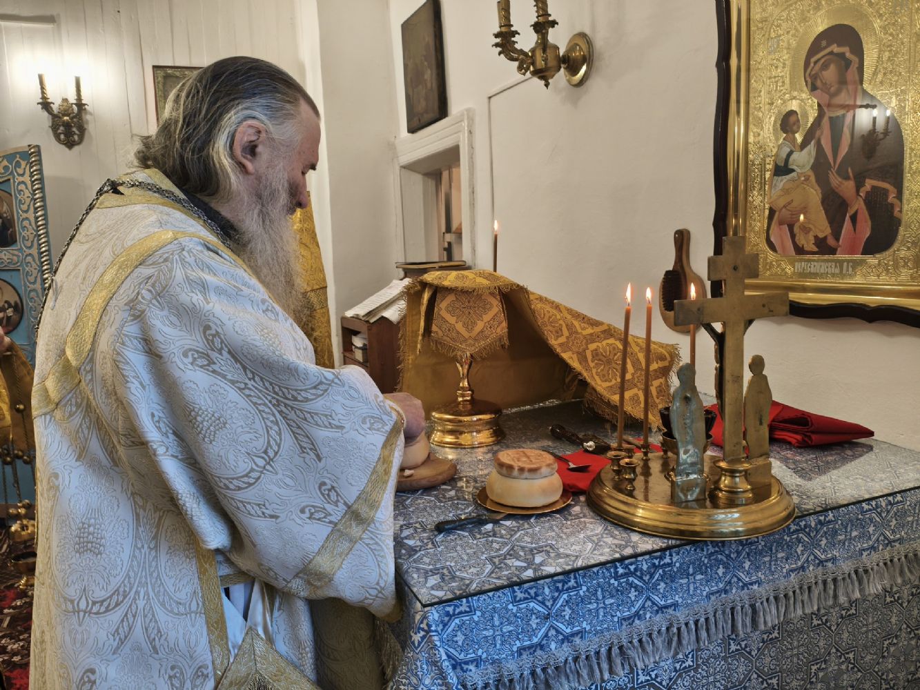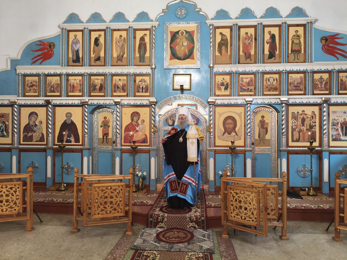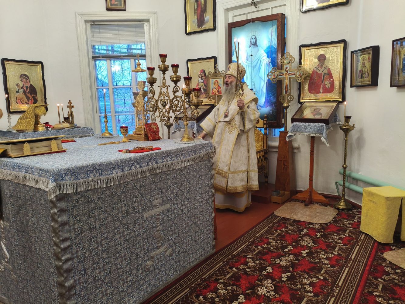 По окончании Литургии владыка тепло поздравил настоятеля храма отца Валентина с грядущим юбилеем и вручил ему на молитвенную память икону святителя Николая Чудотворца.