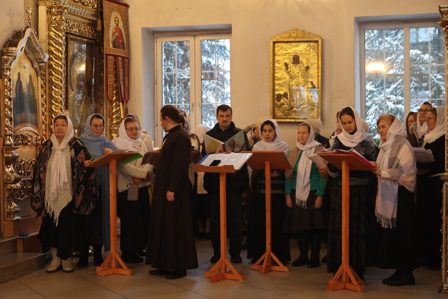 За Литургией Его Преосвященству сослужили клирики кафедрального собора протоиерей Виталий Михеев, иерей Николай Аникин, иеромонах Александр (Чеборов), иерей Сергий Першаков, иеромонах Питирим (Мосякин), диакон Иоанн Захаров и диакон Александр Викторов. Песнопения исполняли два хора: архиерейский (регент Любовь Михеева) и народный под управлением Евгения Чигарова.