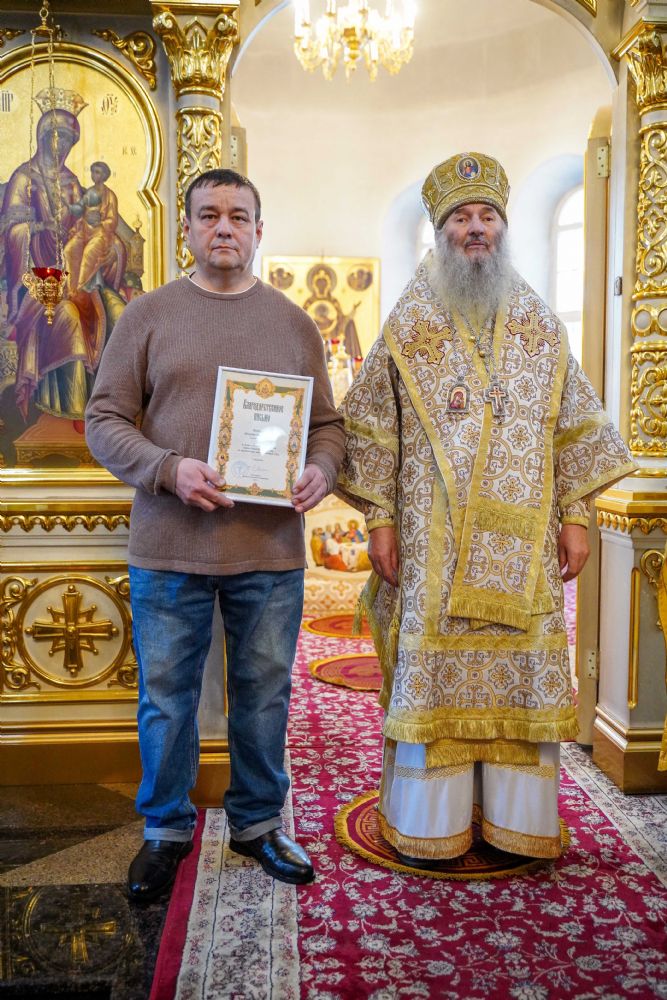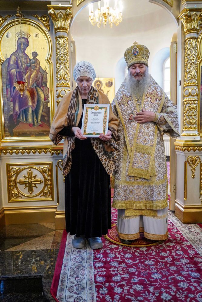 В завершение богослужения митрополит Иоанн вручил награды в связи с 10-летием освящения храма Рождества Христова. Архиерейских грамот за активное участие в приходской жизни удостоены директор воскресной школы храма Шареева Светлана Александровна и директор фирмы «Эридиан» Полевщиков Алексей Николаевич. Благодарственные письма за подписью правящего архиерея за многолетний добросовестный труд получили повар трапезной храма Мельникова Елена Анатольевна и помощник настоятеля храма Ягодаров Андрей Витальевич.