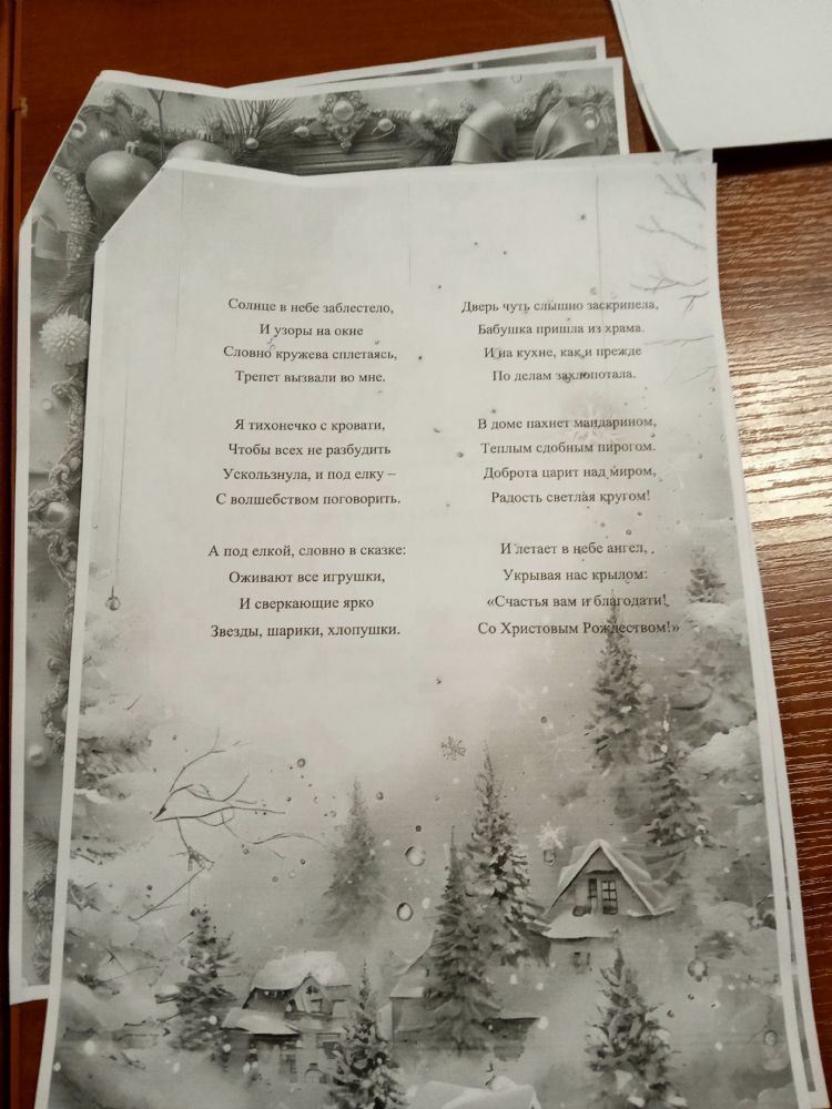 Вот строчки из одного из стихотворений школьника: «Рождество стучится в двери, Чудо начинается. Мы глазам своим не верим – Волшебство случается! В этот день благая весть К нам с небес спустилась, И числа сердцам не счесть, Что добру открылись. В этот день давным-давно На свет Христос родился. Возлюбили мы Его, Он в сердце поселился. Пусть сегодня в каждый дом Счастье постучится! Всех с чудесным Рождеством! Пусть волшебство случится!»