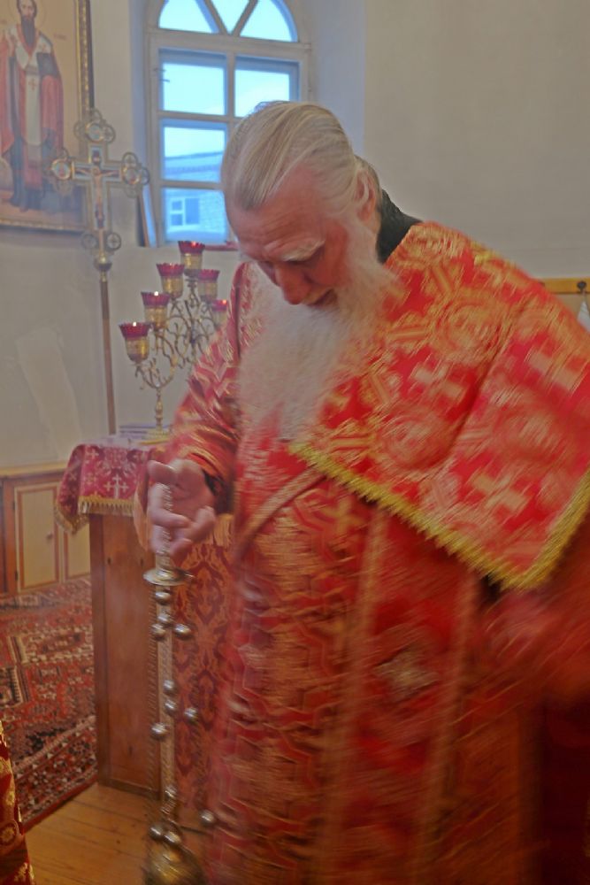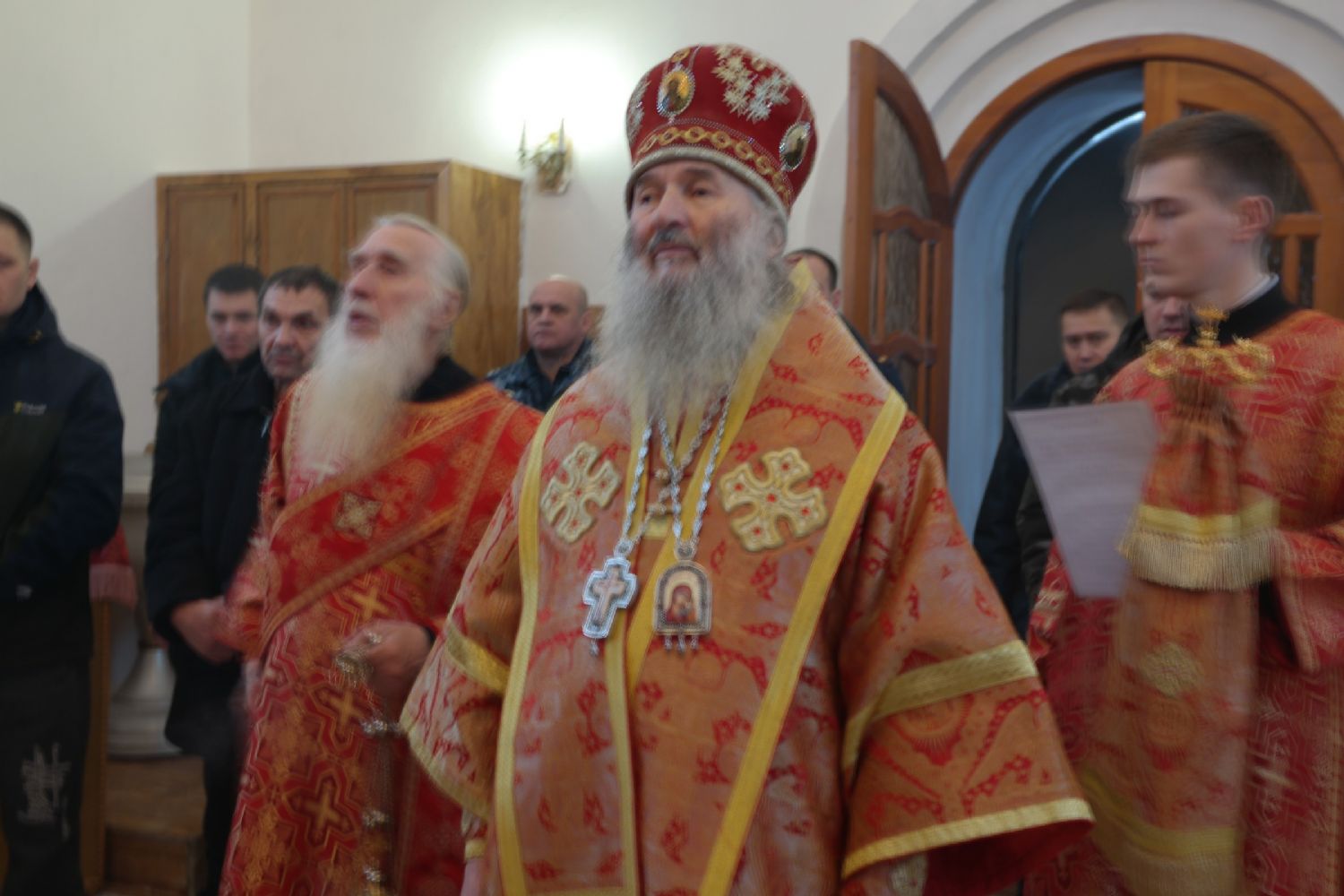 Архипастырю сослужили клирик Успенского храма г. Йошкар-Олы иерей Вячеслав Булычев, окормляющий данное исправительное учреждение, и протодиакон Михаил Козловский. Песнопения исполнял малый состав хора «Благовест» под управлением Софии Андреевой.