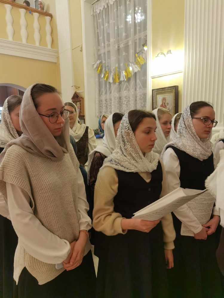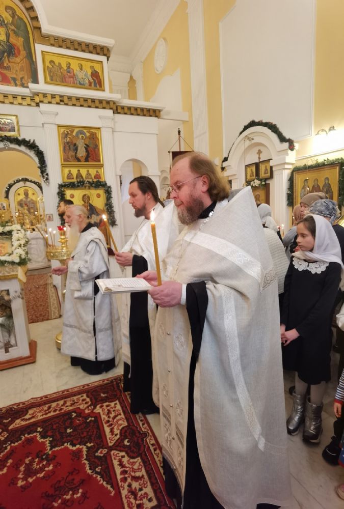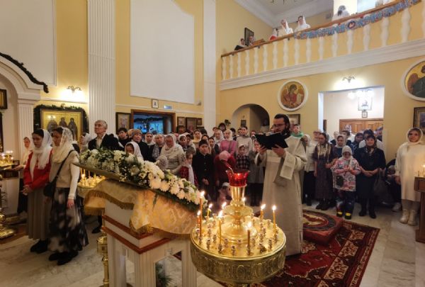 Его Высокопреосвященству сослужили настоятель храма протоиерей Евгений Сурков, клирики храма иерей Андрей Иванов и диакон Никита Сурков, а также клирик храма иконы «Всех скорбящих Радость» иерей Игорь Коваль и протодиакон Михаил Козловский. Песнопения исполняли антифонно архиерейский хор «Благовест» под управлением Софии Андреевой, хор Татианинского храма (регент – Алла Симакова) и детский хор гимназии имени Сергия Радонежского под руководством Анастасии Староверовой.