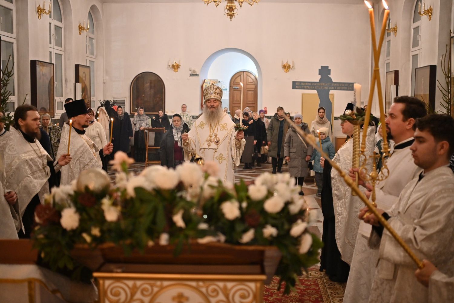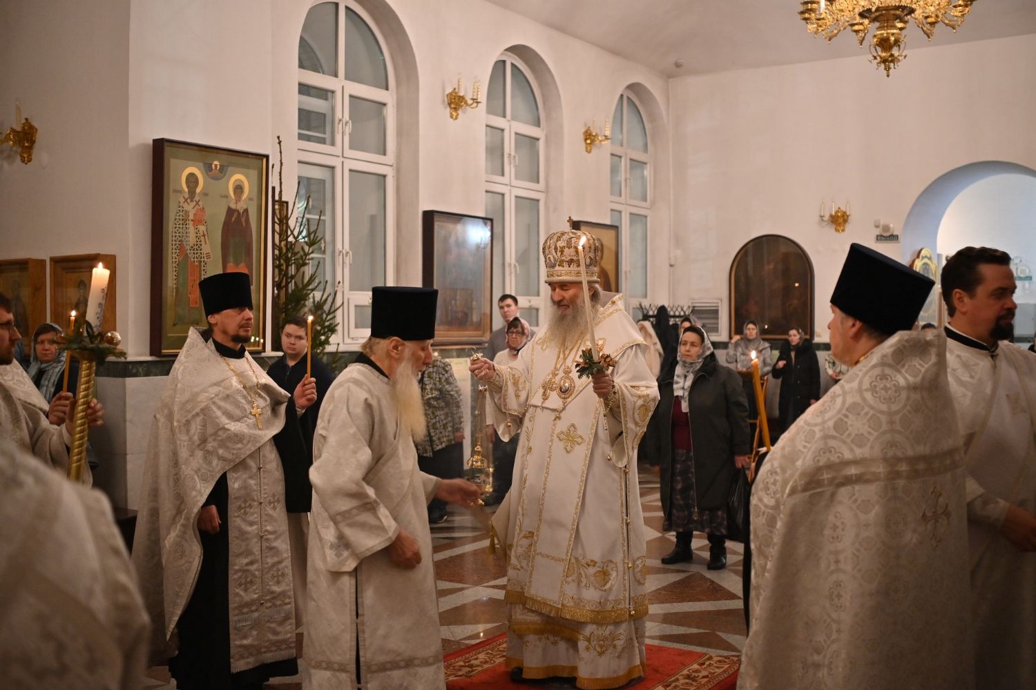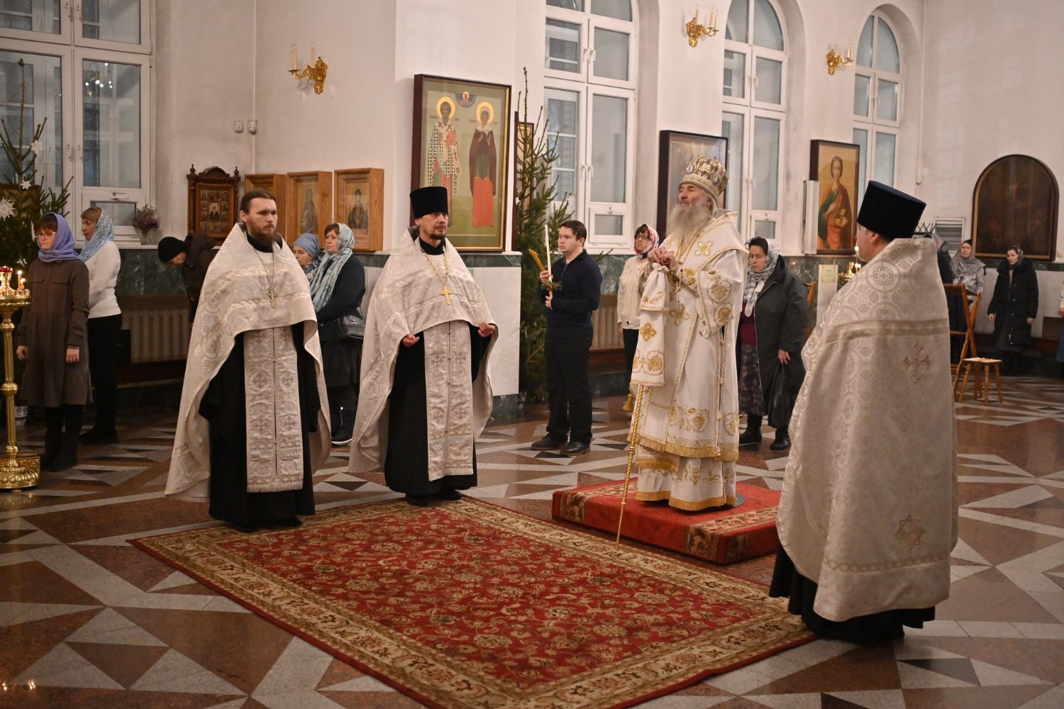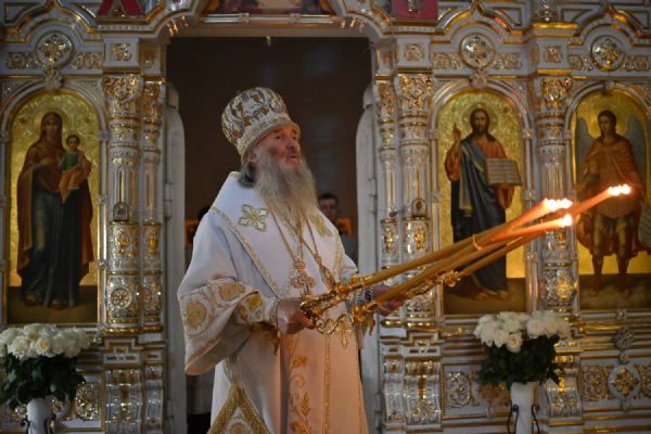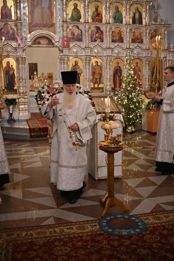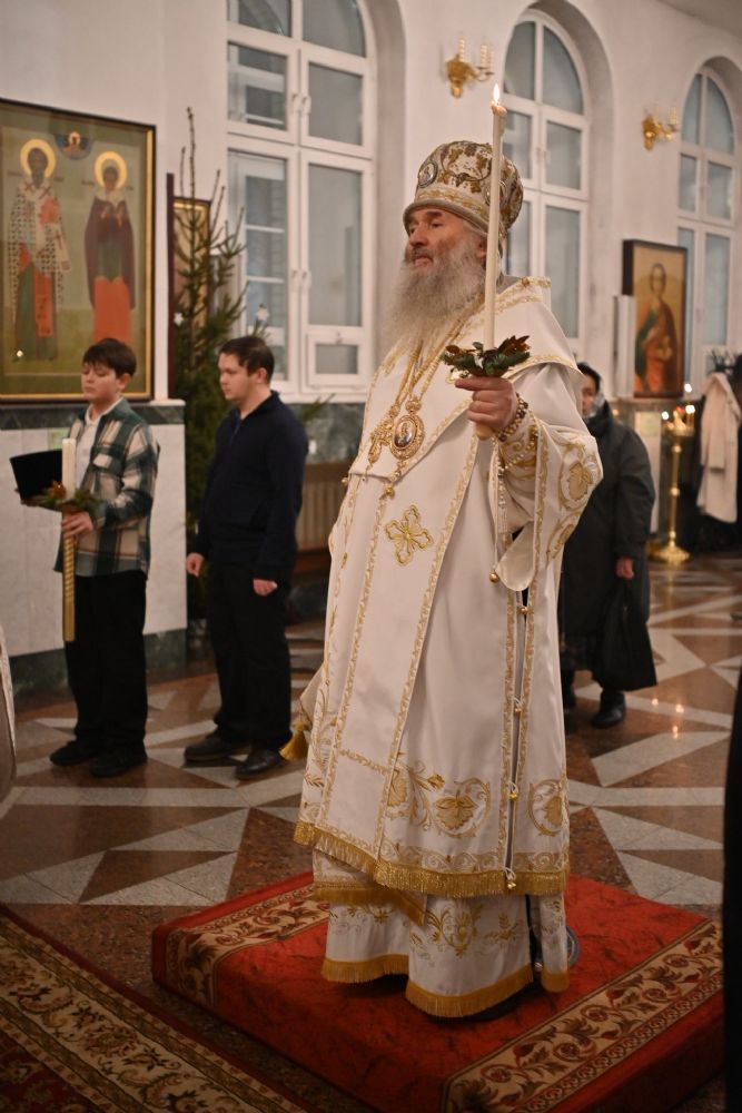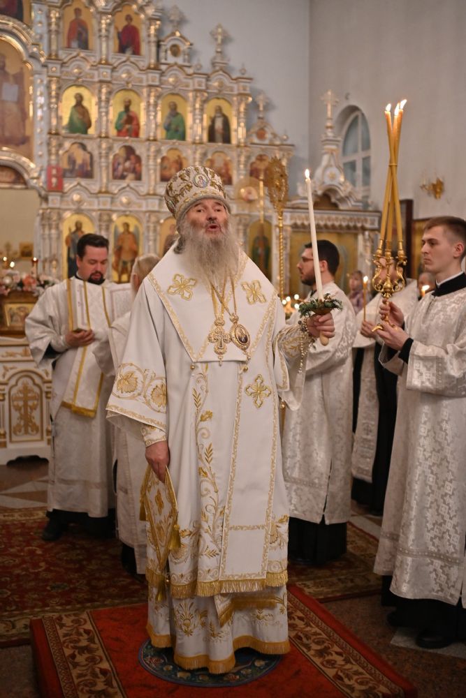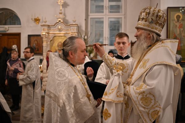Владыке сослужили настоятель собора иерей Андрей Кочаков, клирики собора иерей Леонид Вылекжанин, иерей Димитрий Лукьянов и диакон Алексий Кузнецов, а также протодиакон Михаил Козловский. Песнопения исполнял хор собора под управлением Елены Поглазовой.