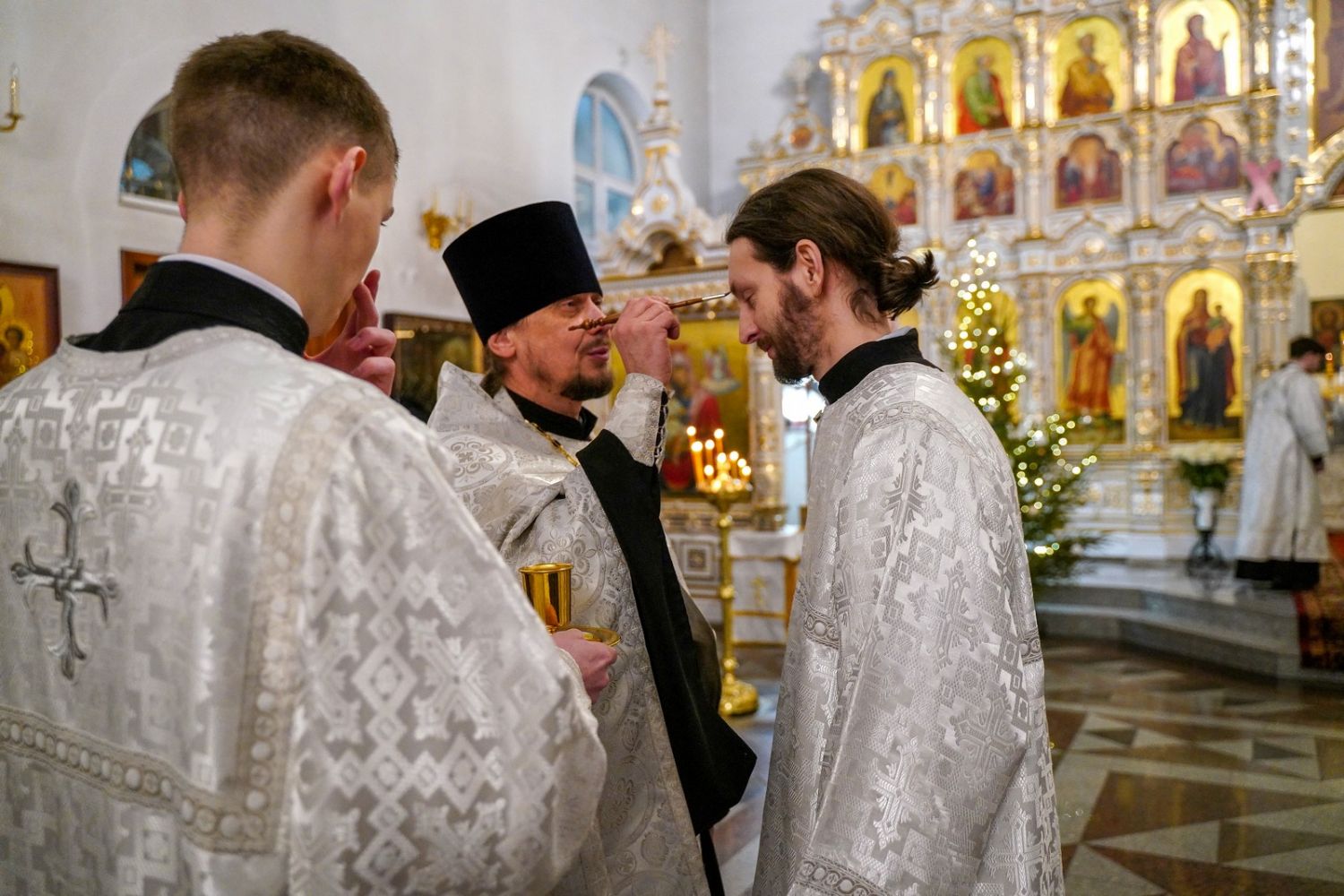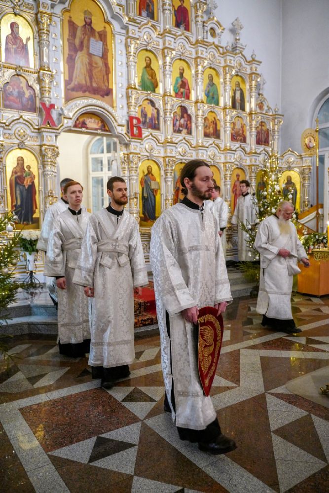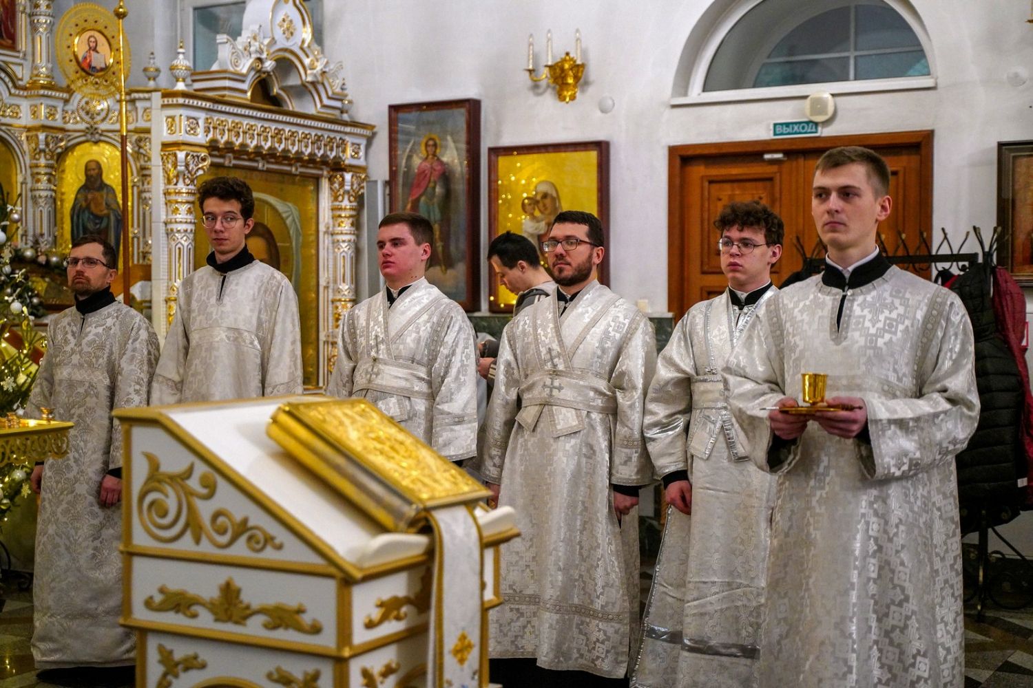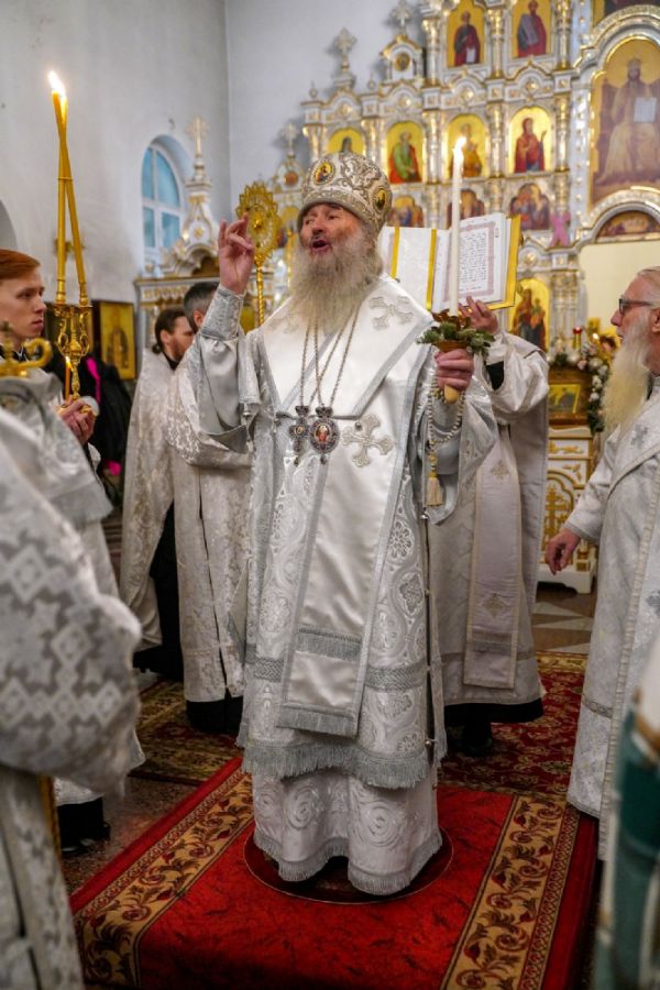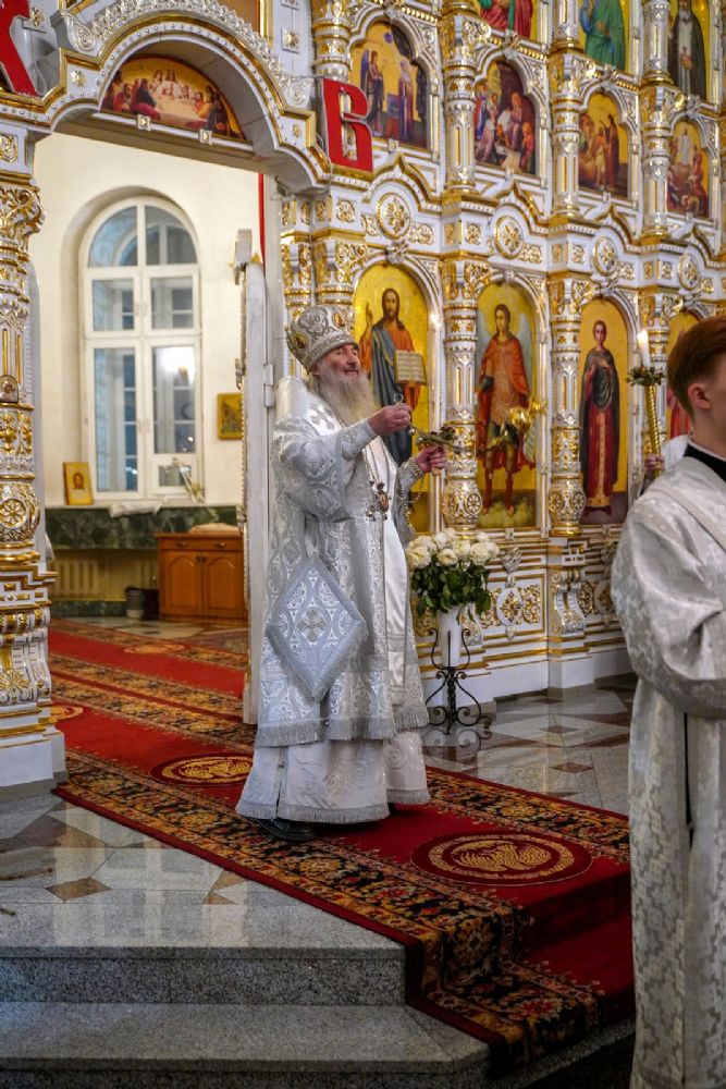 Владыке сослужили настоятель собора иерей Андрей Кочаков, клирики собора иерей Леонид Вылекжанин, иерей Димитрий Лукьянов и диакон Алексий Кузнецов, а также настоятель Сретенского храма с. Русский Кадам иерей Владимир Каплунов и протодиакон Михаил Козловский. Песнопения исполнял хор собора под управлением Елены Поглазовой.