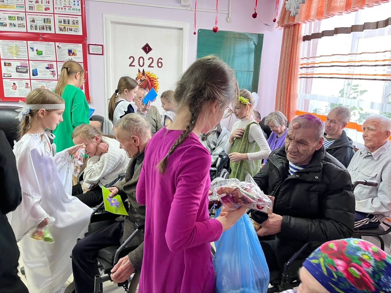 После концерта юные артисты раздали всем подарки и открытки с теплыми пожеланиями, изготовленные своими руками. Вниманием и заботой никто не был обделен – к лежачим жильцам дети пришли в палаты, всех поздравили с праздниками Рождества Христова и Крещения Господня, согрели добротой и сердечным теплом. Многие бабушки и дедушки не могли сдержать слёз, обнимая ребят и благодаря за доставленную радость.