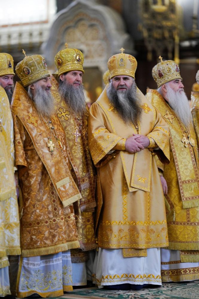 Его Святейшеству сослужили митрополиты, архиепископы и епископы Русской Православной Церкви, представители Поместных Православных Церквей, клирики Русской Православной Церкви. Среди сослужащих архиереев Марийскую митрополию представляли митрополит и епископ Волжский и Сернурский Феофан.