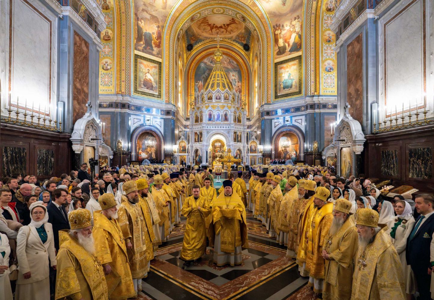 В этот знаменательный день Святейший Патриарх Кирилл совершил Божественную литургию в кафедральном соборном Храме Христа Спасителя в Москве в интронизационных облачениях и с копией жезла святителя Петра.