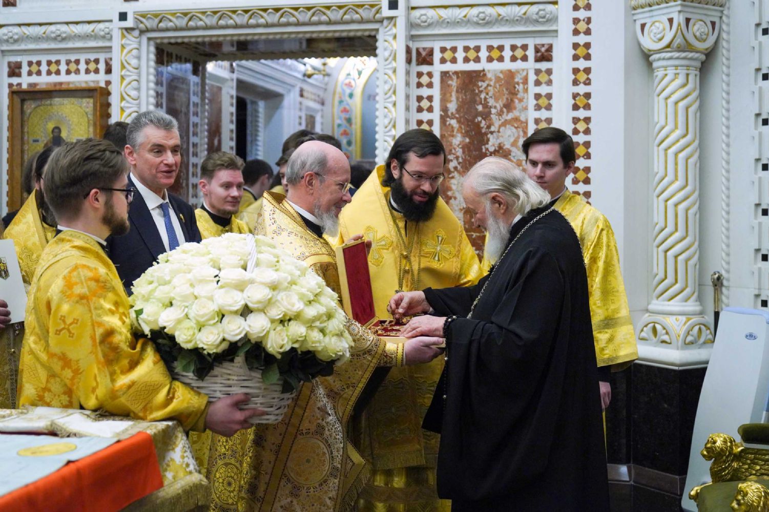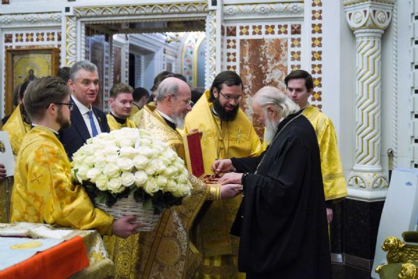По окончании Литургии, после «Многолетия», управляющий делами Московской Патриархии, первый викарий Патриарха Московского и всея Руси по г. Москве митрополит Воскресенский Григорий огласил поздравительный адрес от членов Священного Синода Русской Православной Церкви Святейшему Патриарху Кириллу с 17-летием интронизации. В дар Его Святейшеству митрополит Григорий преподнес икону Божией Матери «Одигитрия» и букет белых роз.