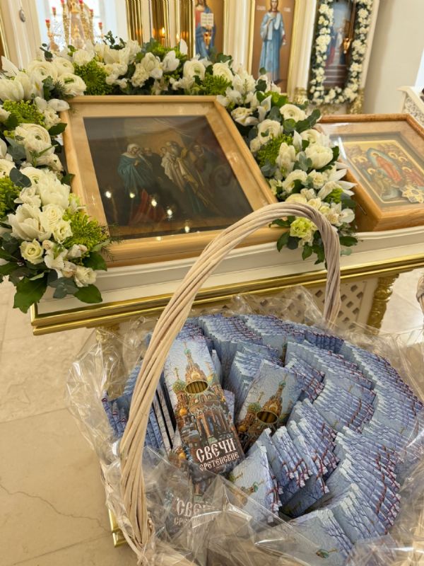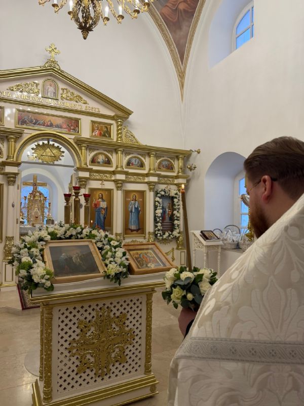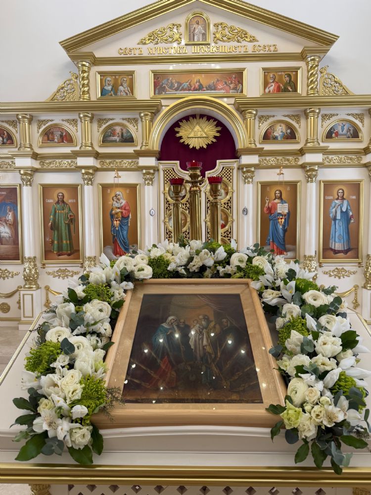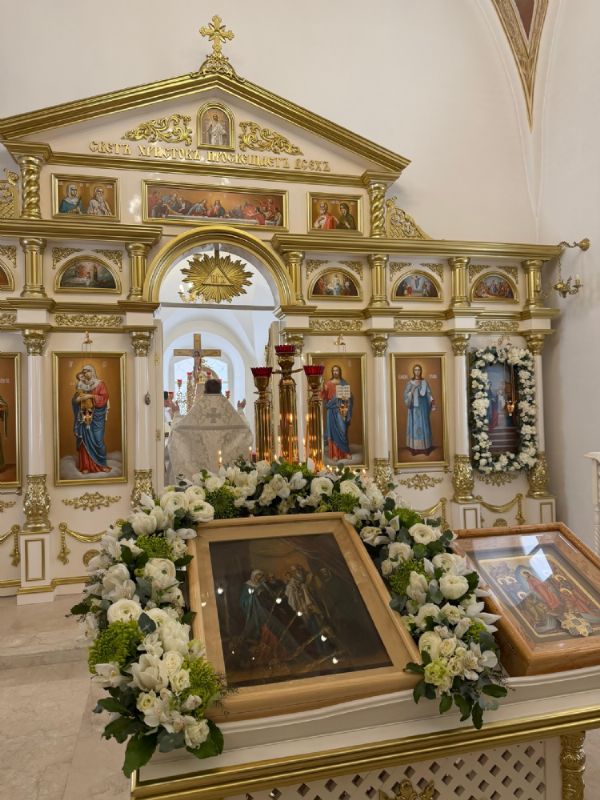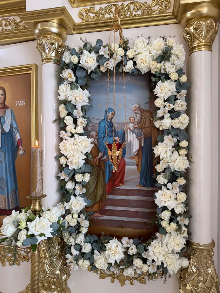 Традиционно, к празднику прихожане украсили храм и иконы нарядными композициями из живых цветов.
