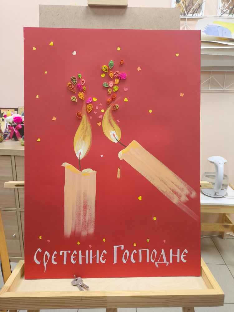 Далее собравшиеся приступили к оформлению заранее приготовленной Марией Юрьевной картины, на которой изображены две свечи. Как праведный Иосиф принёс в храм голубей в качестве жертвы за рождение Иисуса Христа, так и мы покупаем свечи в церковной лавке, совершая тем самым пожертвование «на храм». Также свеча символизирует свет веры и нашу горячую молитву ко Господу.