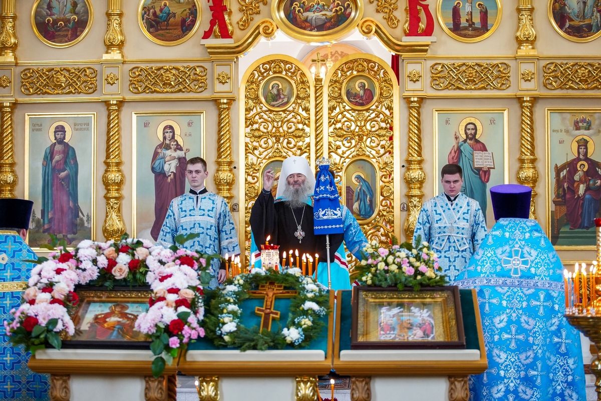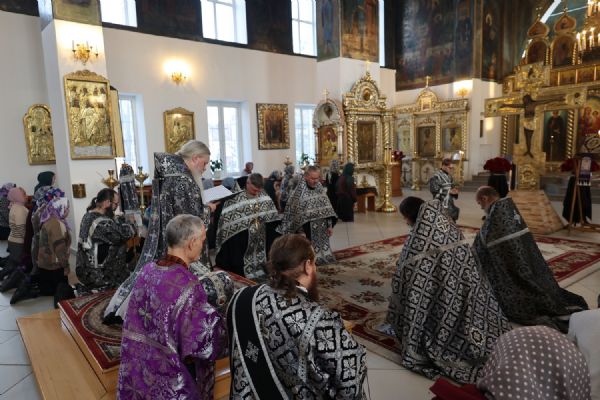 Его Преосвященству сослужили клирики собора иерей Николай Аникин, иеромонах Александр (Чеборов), иерей Сергий Першаков, иеромонах Питирим (Мосякин), диакон Иоанн Захаров. Песнопения исполнял народный хор под управлением Евгения Чигарова.